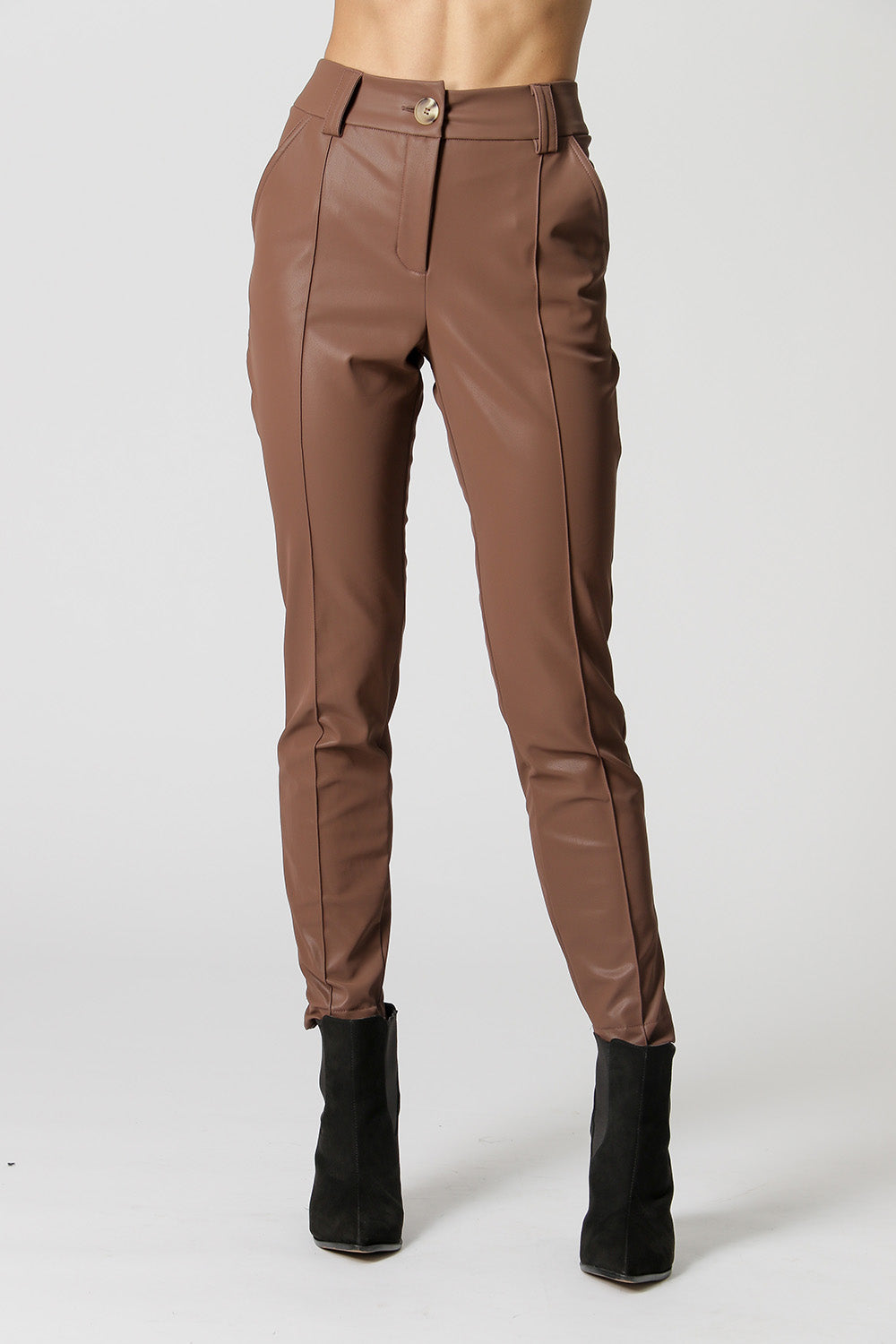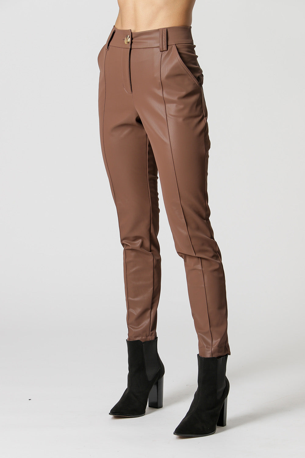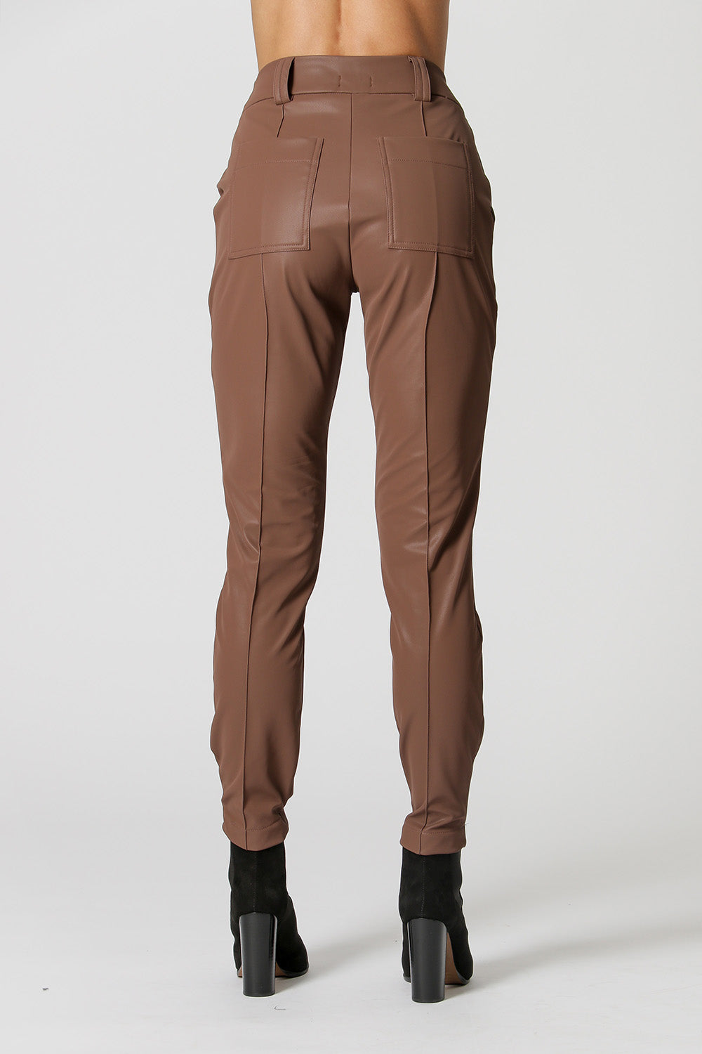 Calça em detalhe de pesponto e nervuras. Confeccionada em tecido de couro sintético. Uma peça com combinação perfeita para partes de cima fluídas, e também peças mais pesadas de inverno e meia-estação.
