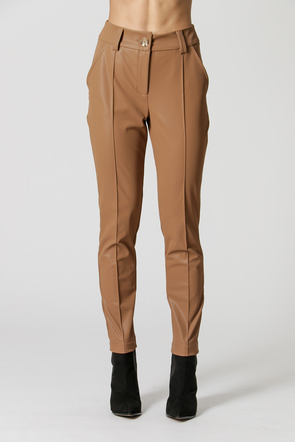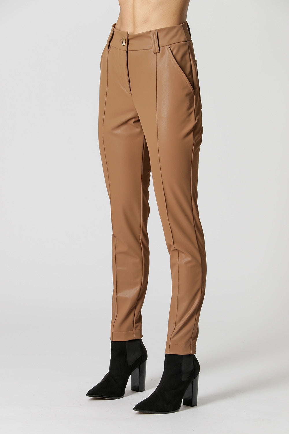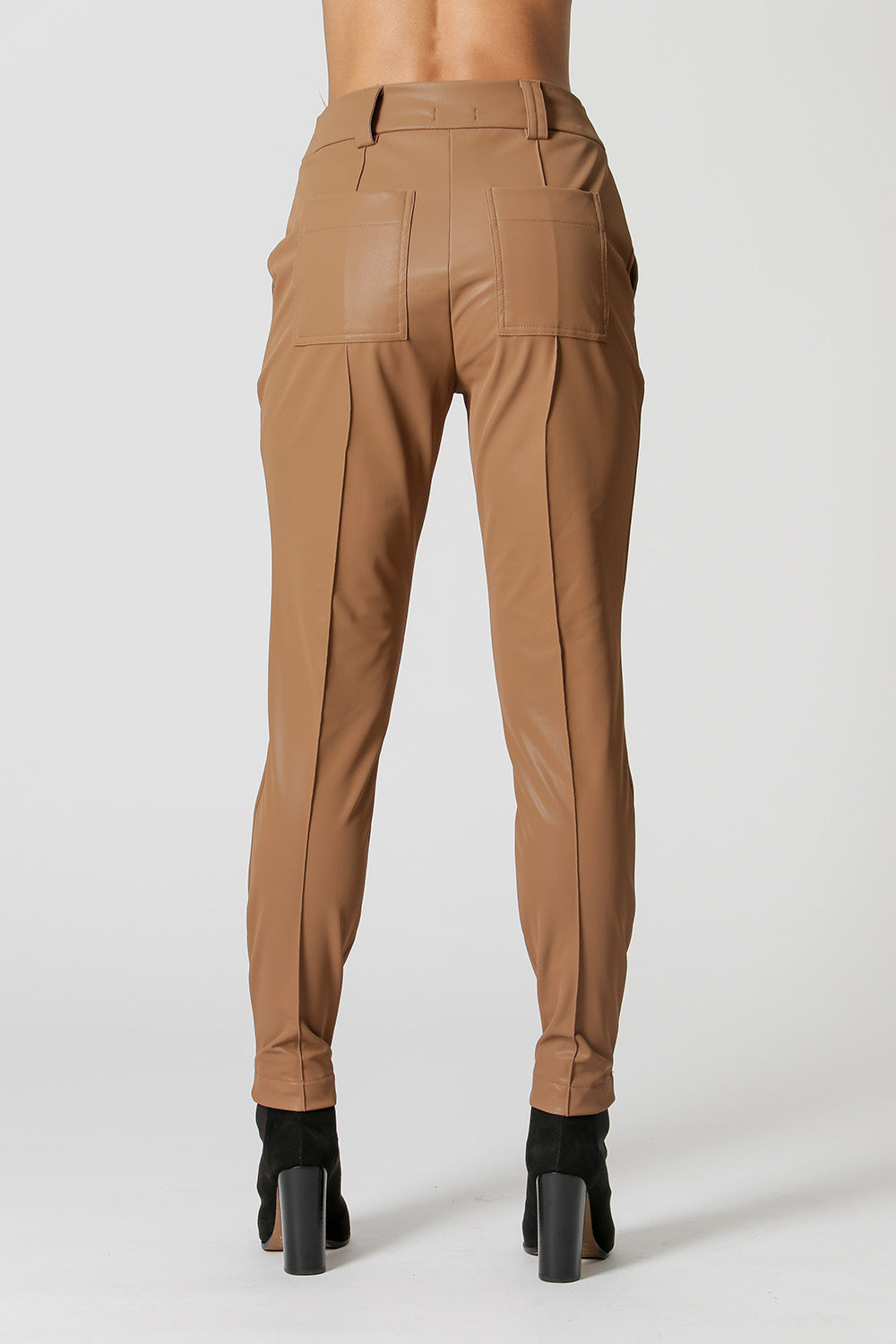 Calça em detalhe de pesponto e nervuras. Confeccionada em tecido de couro sintético. Uma peça com combinação perfeita para partes de cima fluídas, e também peças mais pesadas de inverno e meia-estação.
