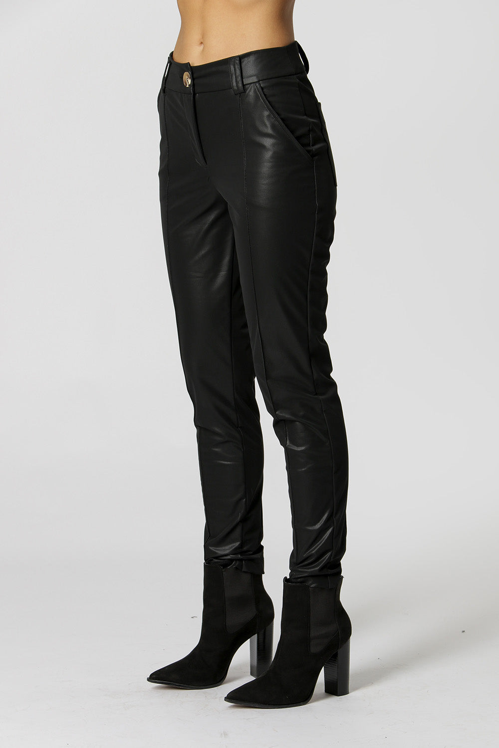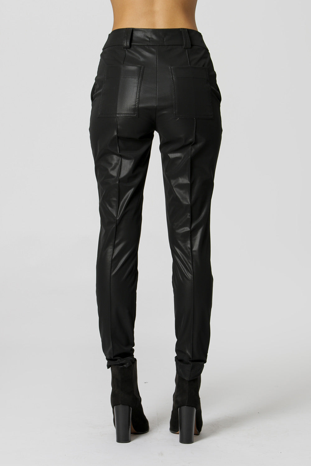 Calça em detalhe de pesponto e nervuras. Confeccionada em tecido de couro sintético. Uma peça com combinação perfeita para partes de cima fluídas, e também peças mais pesadas de inverno e meia-estação.