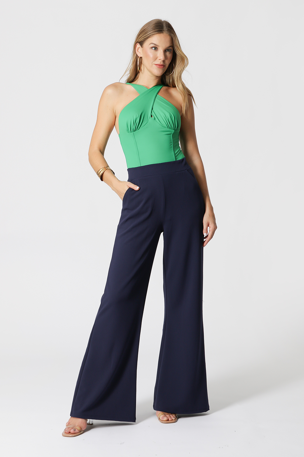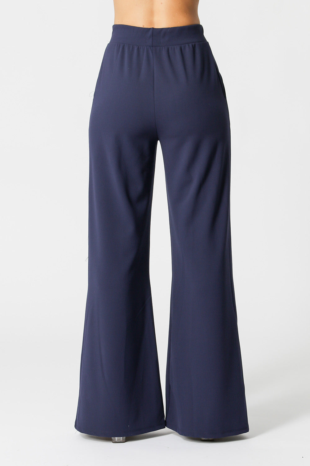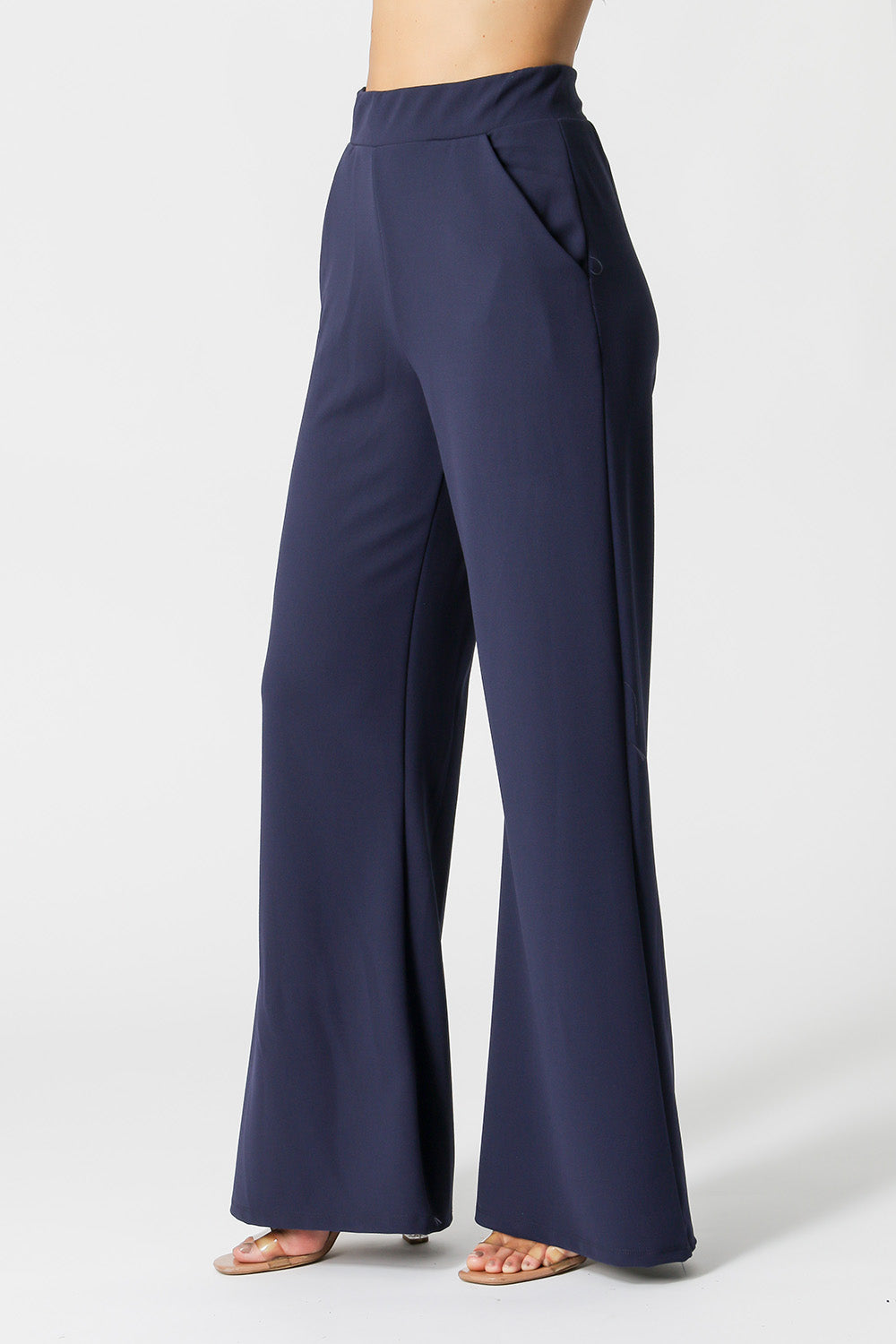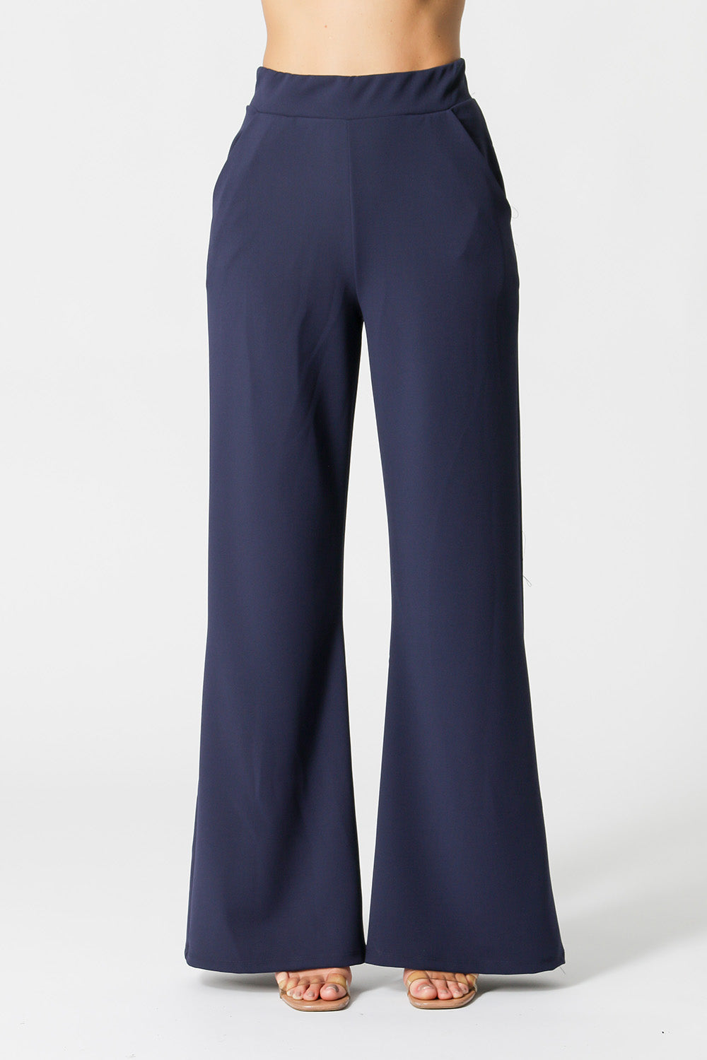 Calça Pantalona com bolsos na frente e elástico no cós. Confeccionada em tecido Malha crepe. Um modelo super confortável e que possibilita compor com vários looks casual.