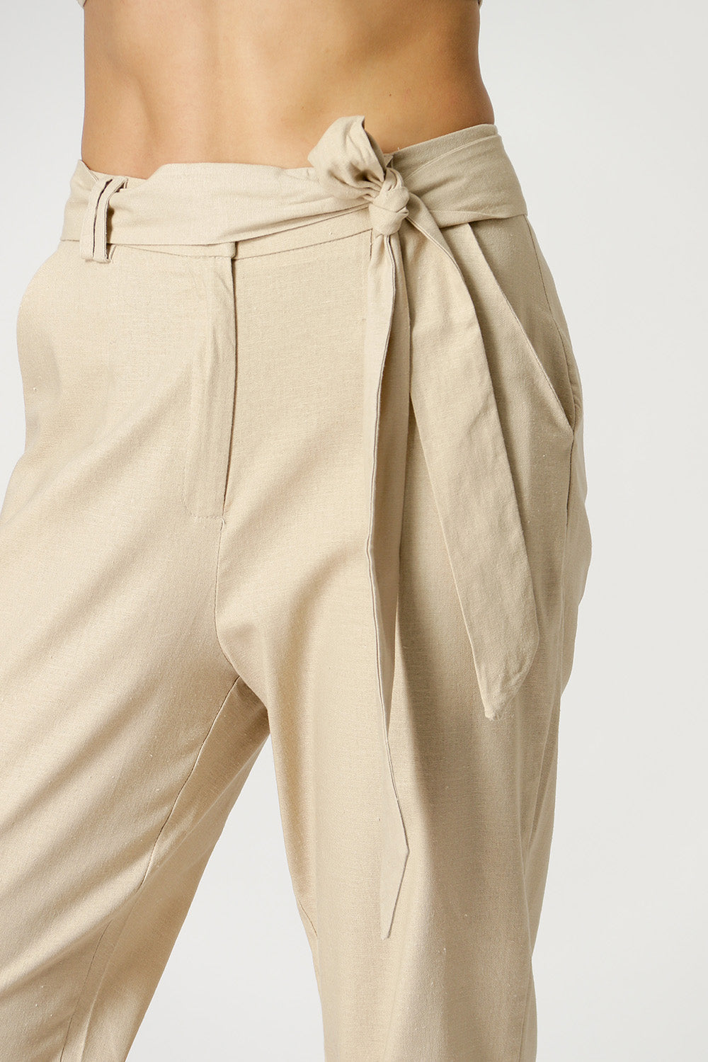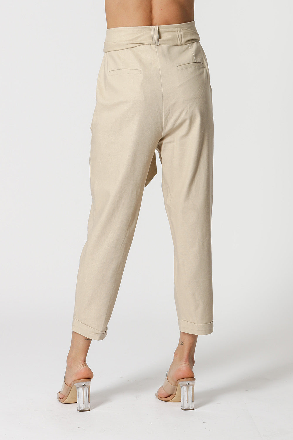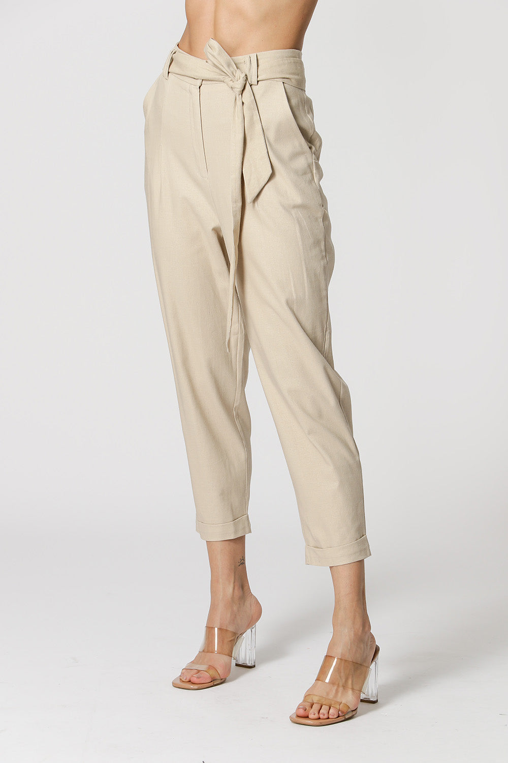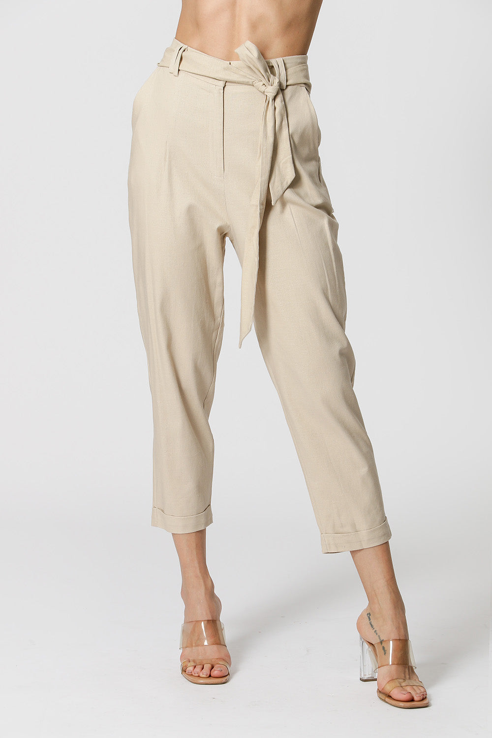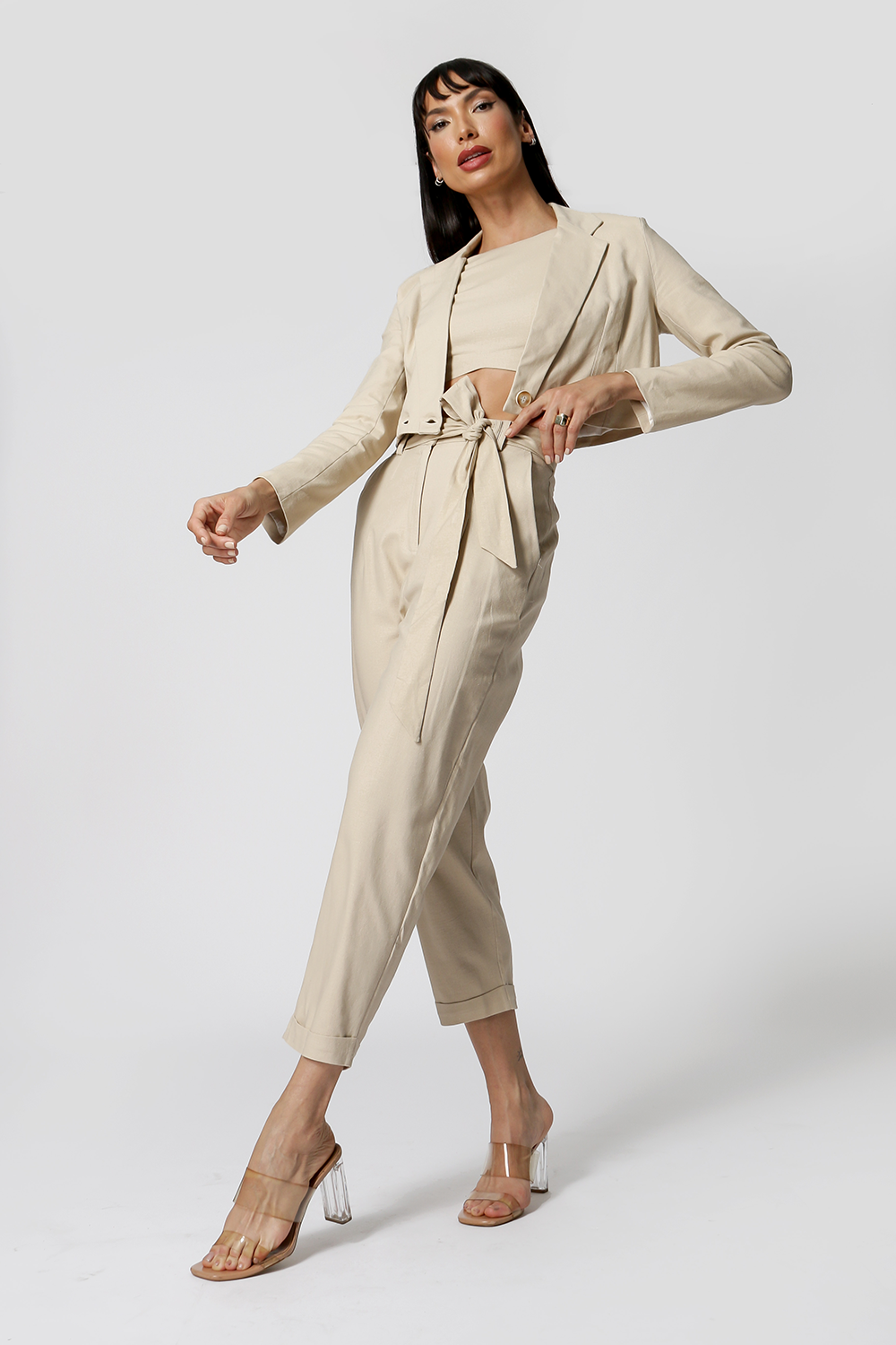 Calça com shape mais jogger com barra italiana, um shape prático e versátil para o dia a dia, confeccionado em linho de viscose, acompanha uma faixa de cinto.