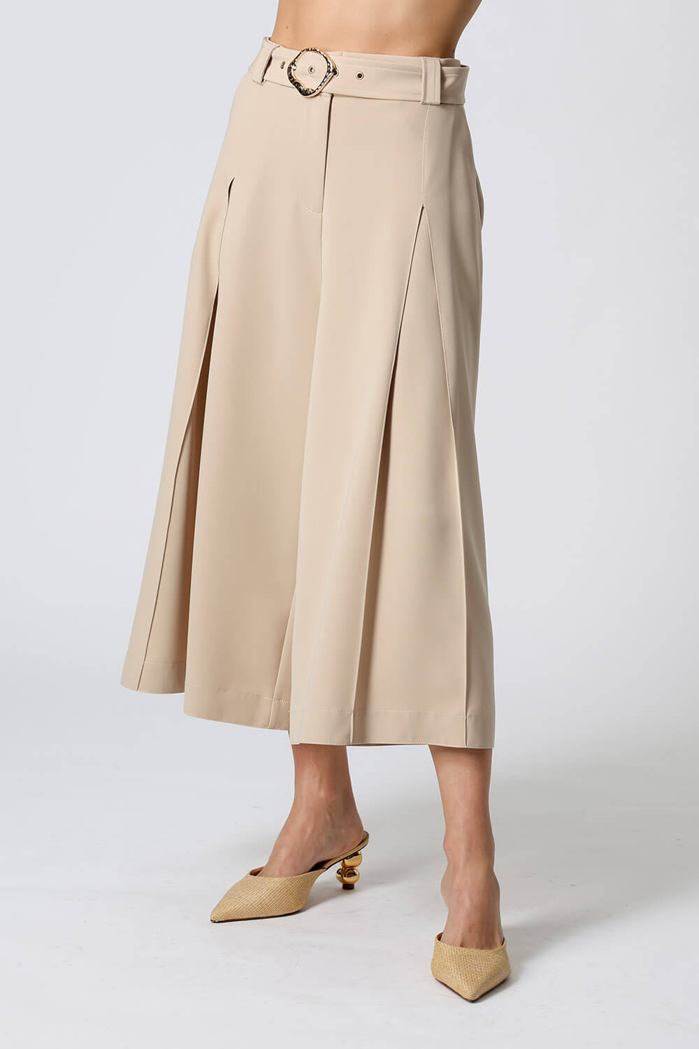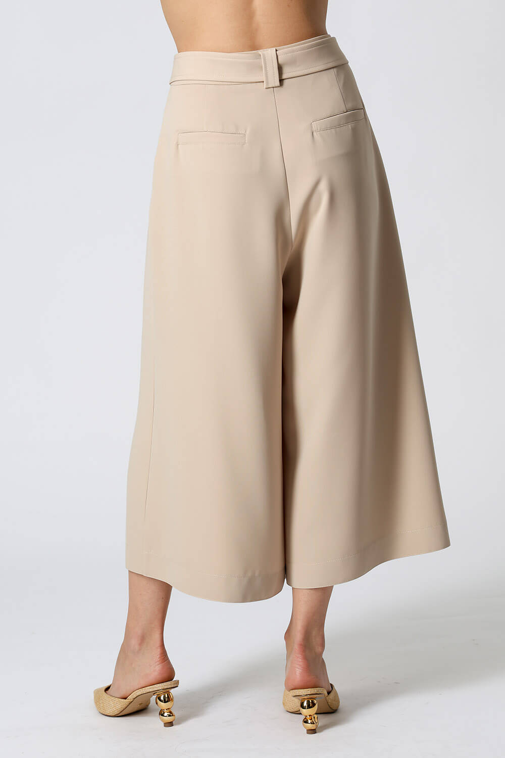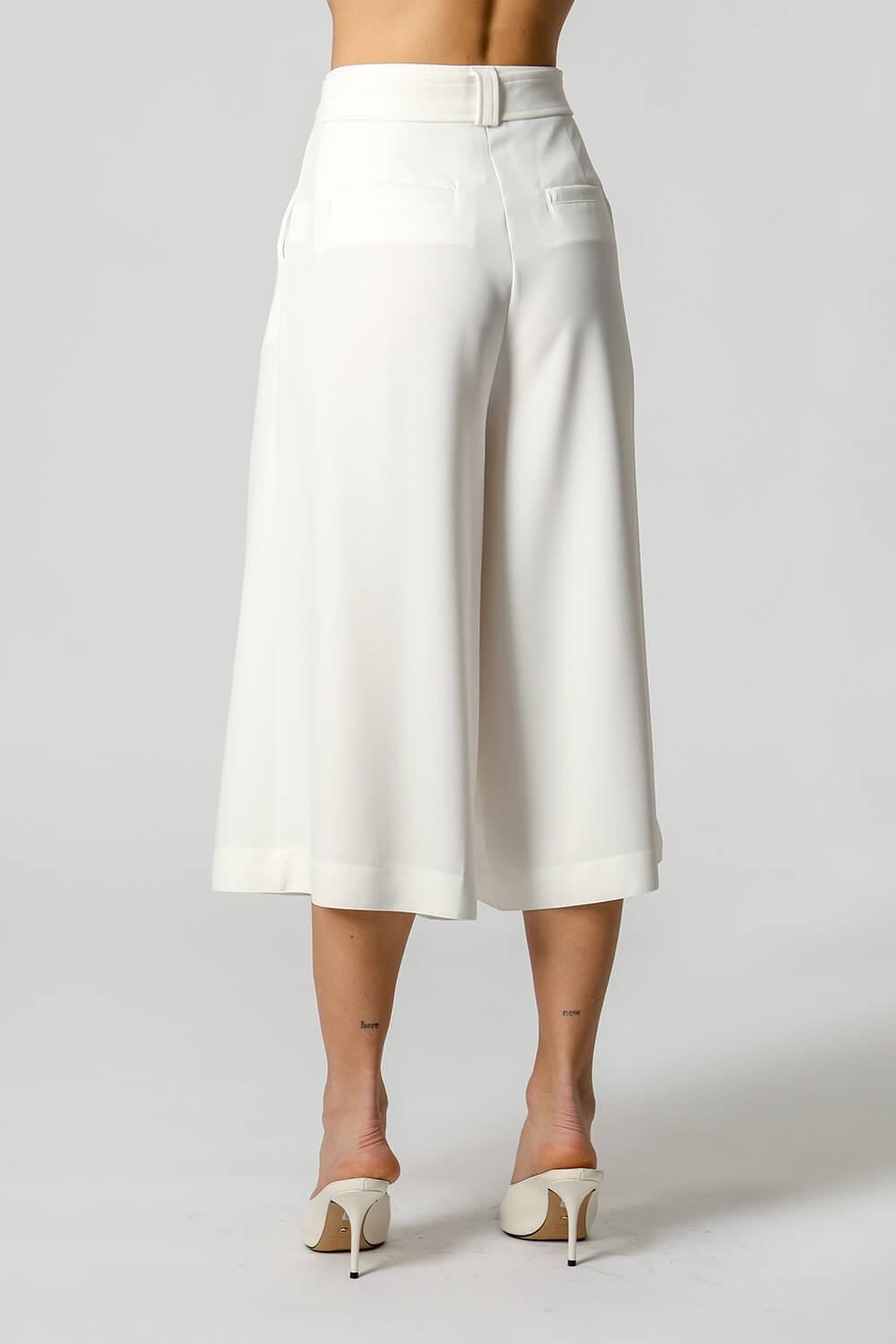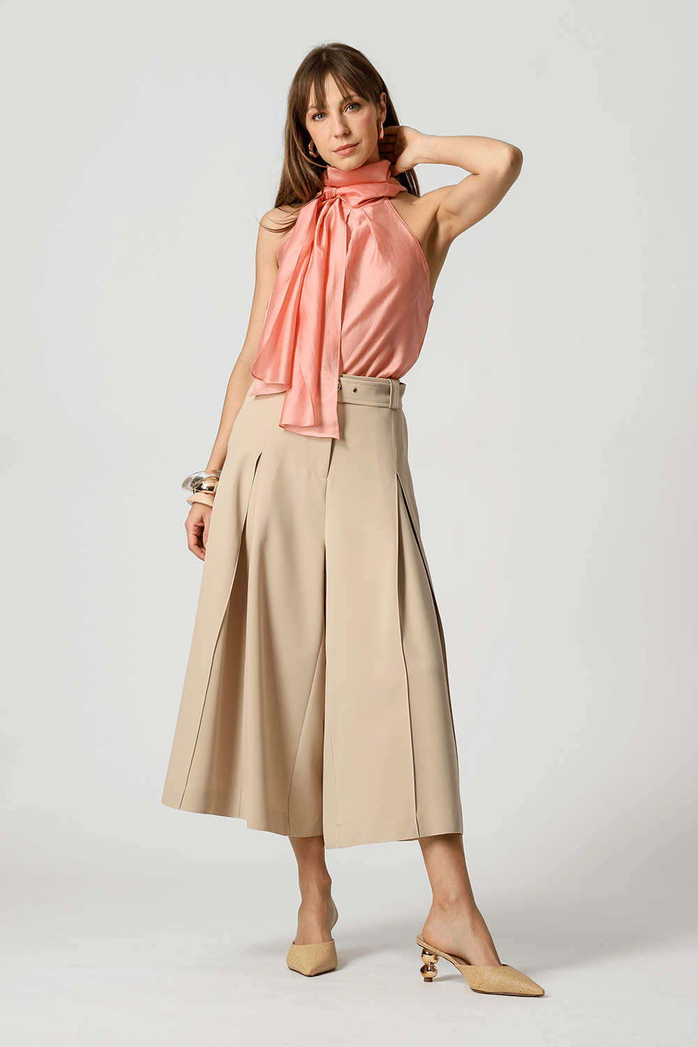 Com uma silhueta midi e boca ampla, esta calça exibe pregas frontais que conferem um caimento elegante. As pregas nas costas garantem um ajuste perfeito e um toque de sofisticação. Feita em tecido alfaiataria fluido, a peça oferece conforto e leveza, ideal para looks sofisticados.