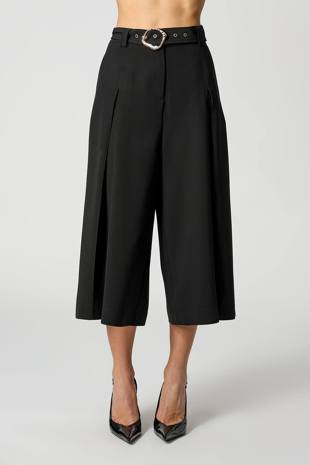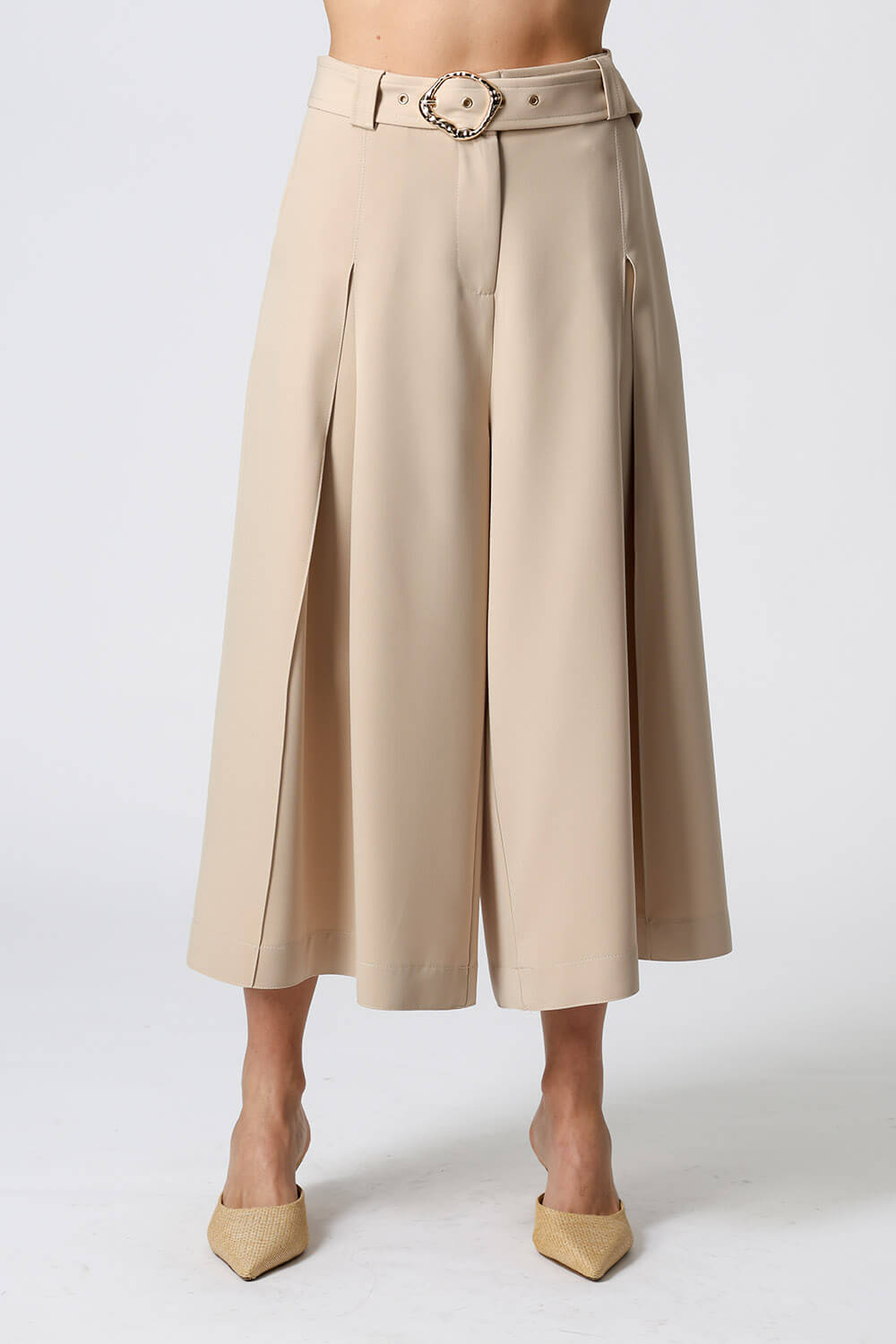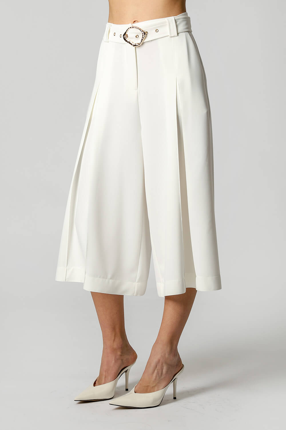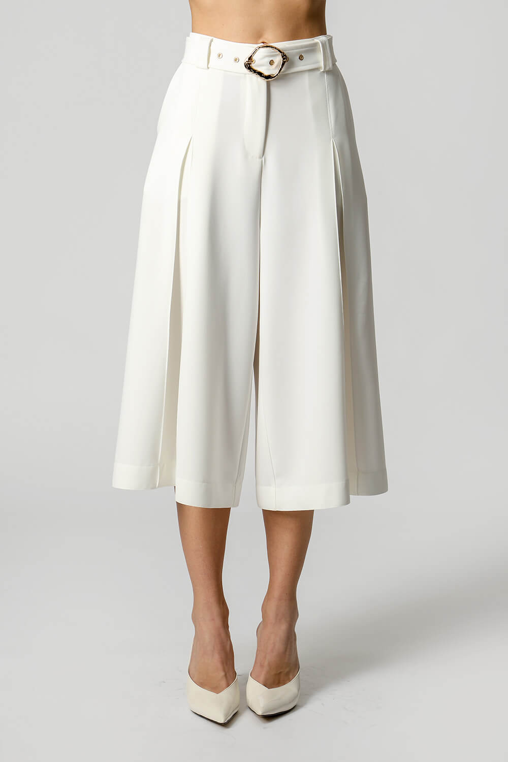 Com uma silhueta midi e boca ampla, esta calça exibe pregas frontais que conferem um caimento elegante. As pregas nas costas garantem um ajuste perfeito e um toque de sofisticação. Feita em tecido alfaiataria fluido, a peça oferece conforto e leveza, ideal para looks sofisticados.