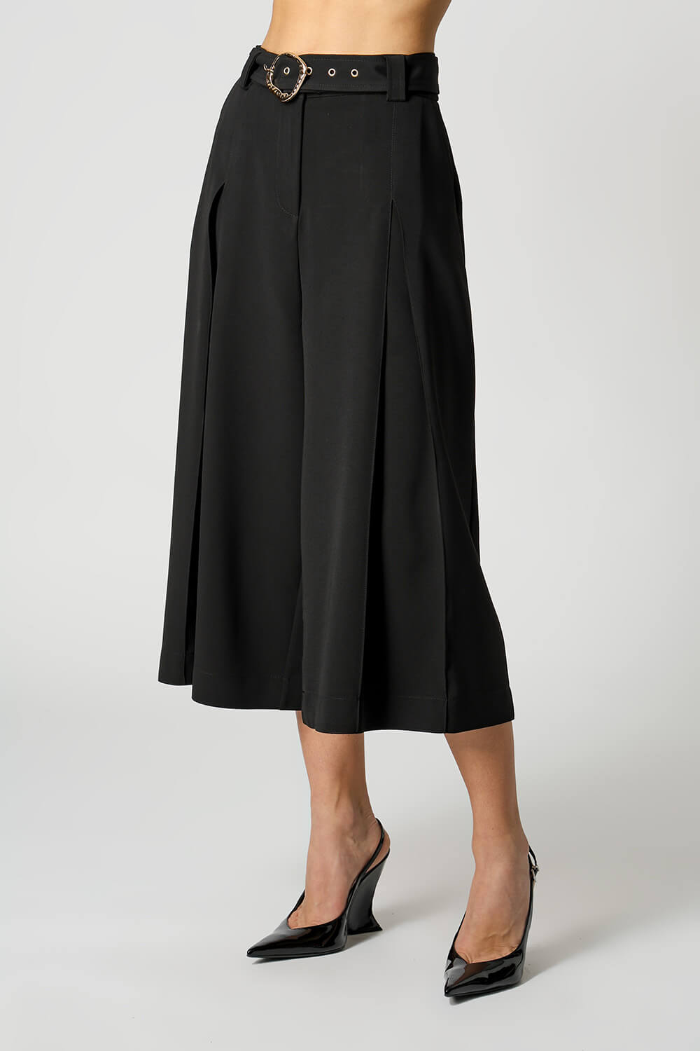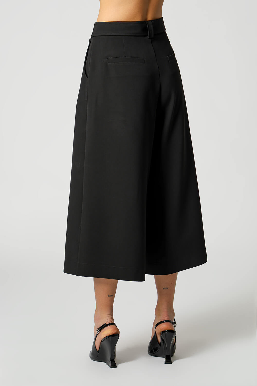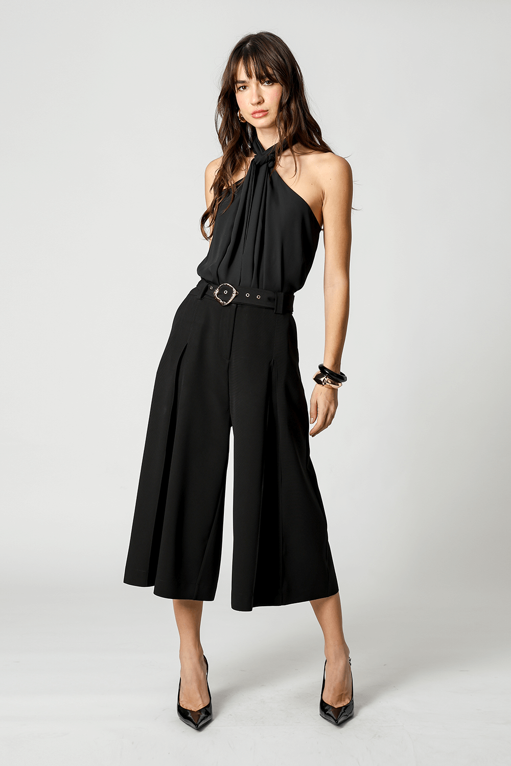 Com uma silhueta midi e boca ampla, esta calça exibe pregas frontais que conferem um caimento elegante. As pregas nas costas garantem um ajuste perfeito e um toque de sofisticação. Feita em tecido alfaiataria fluido, a peça oferece conforto e leveza, ideal para looks sofisticados.