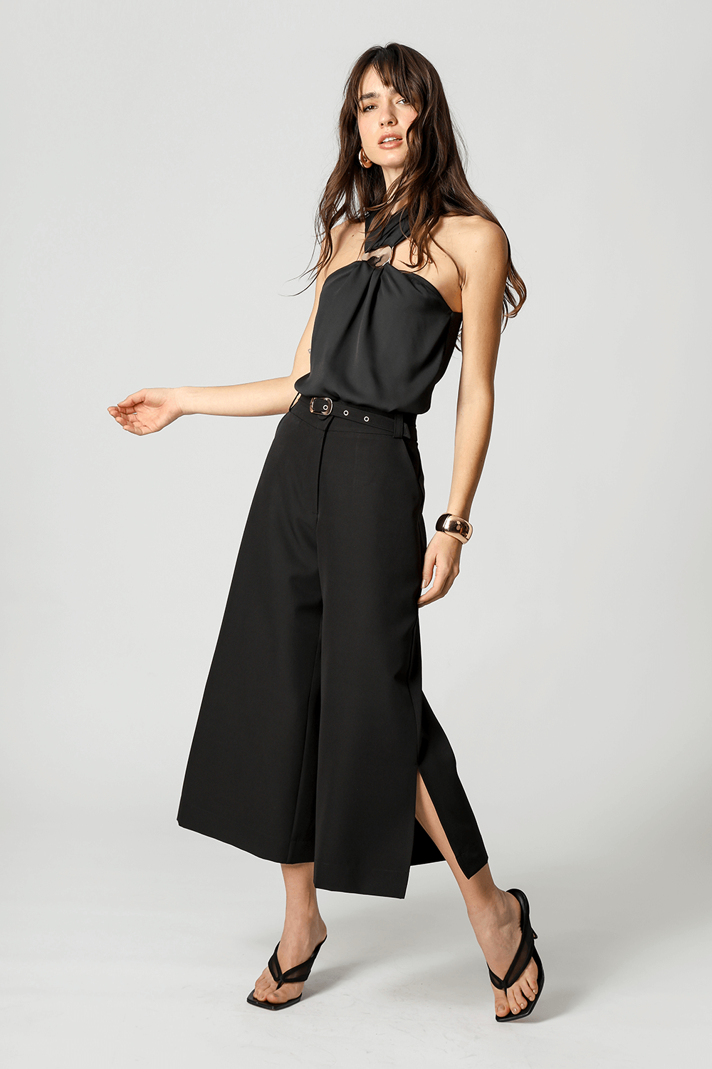 Calça pantacourt em alfaiataria com fenda lateral e cinto removível. Estilo e praticidade em uma peça versátil para composições elegantes e modernas.