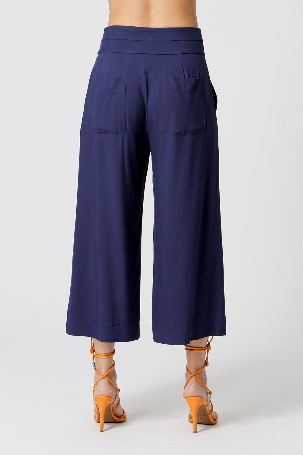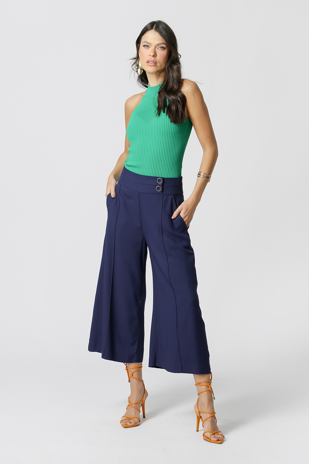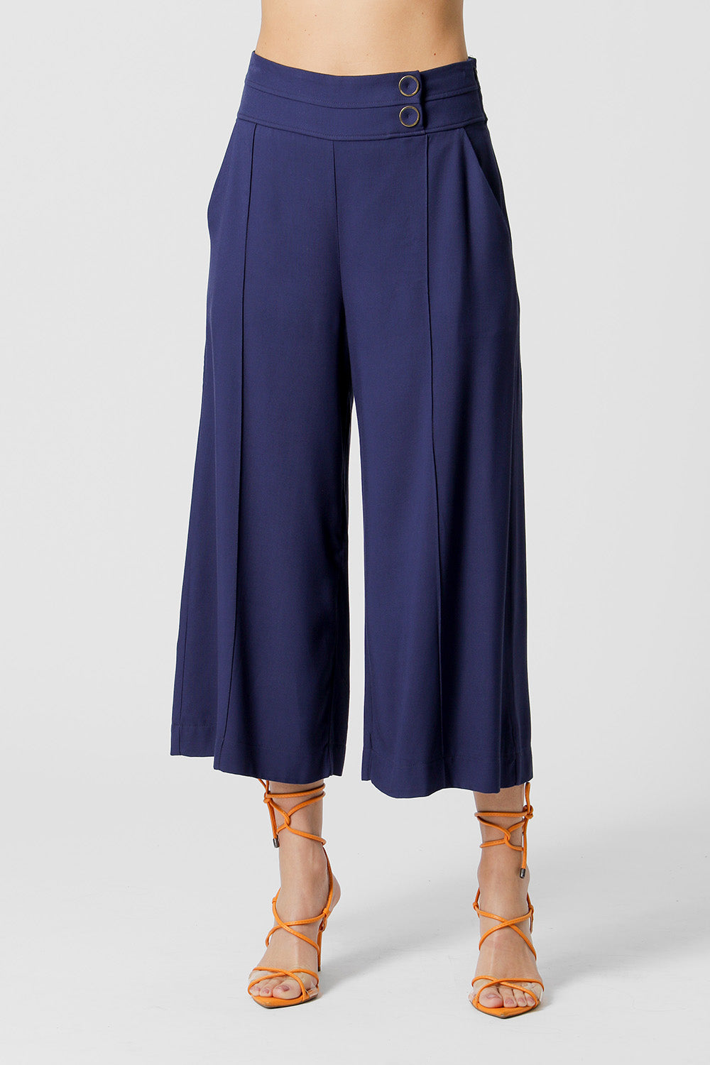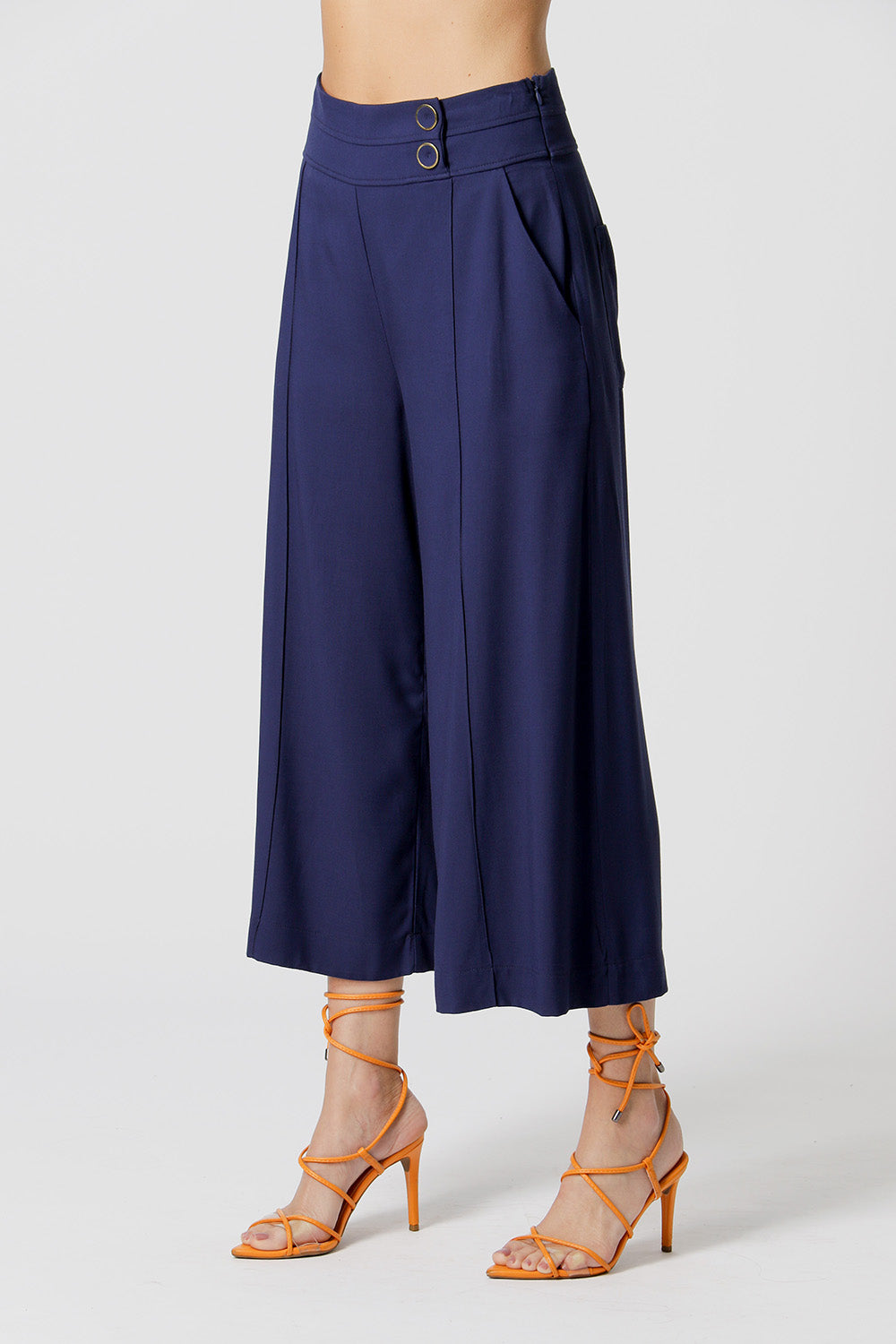 Calça pantacourt confeccionada em viscose texturizada. Possui cós duplo com botões em detalhe de metal.