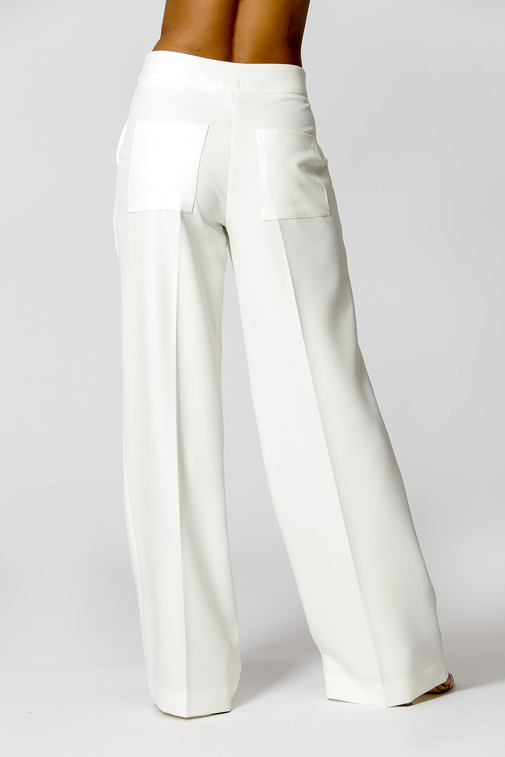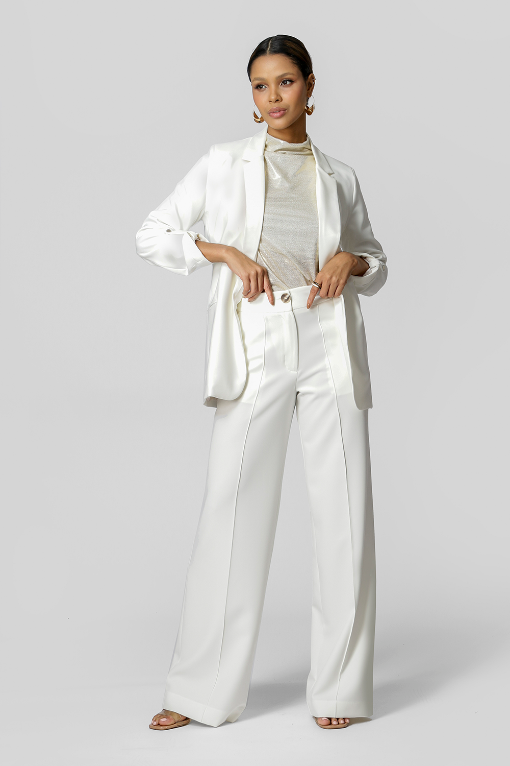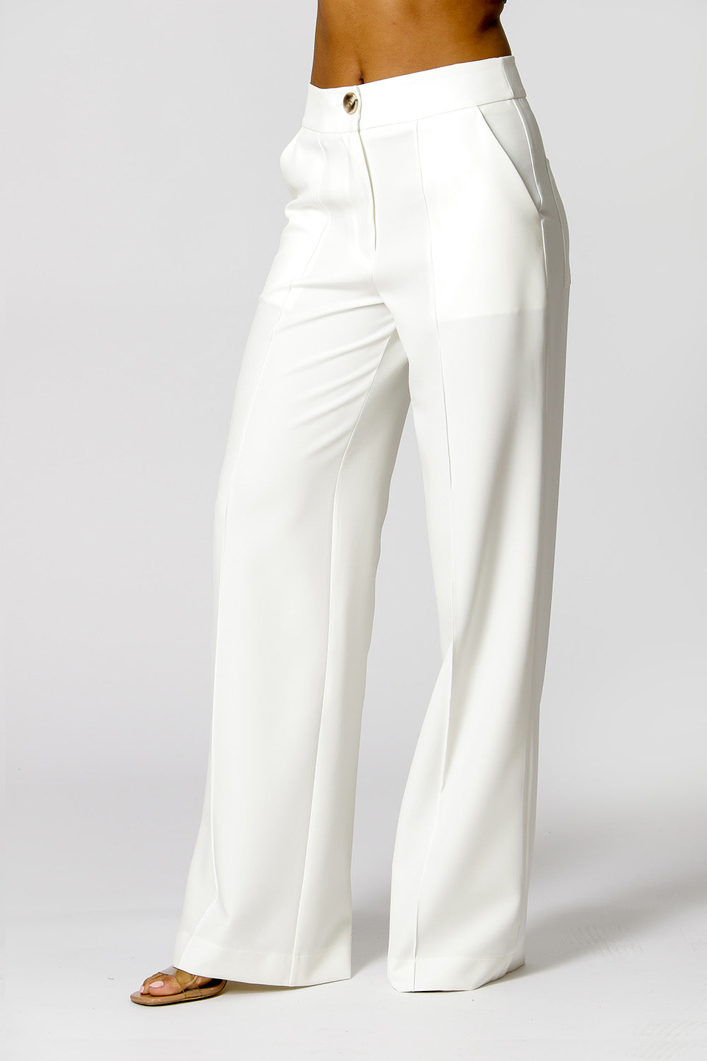 Calça pantalona em alfaiataria com bolso faca, botão diferenciado. Peça ideal para um look elegante de trabalho.
