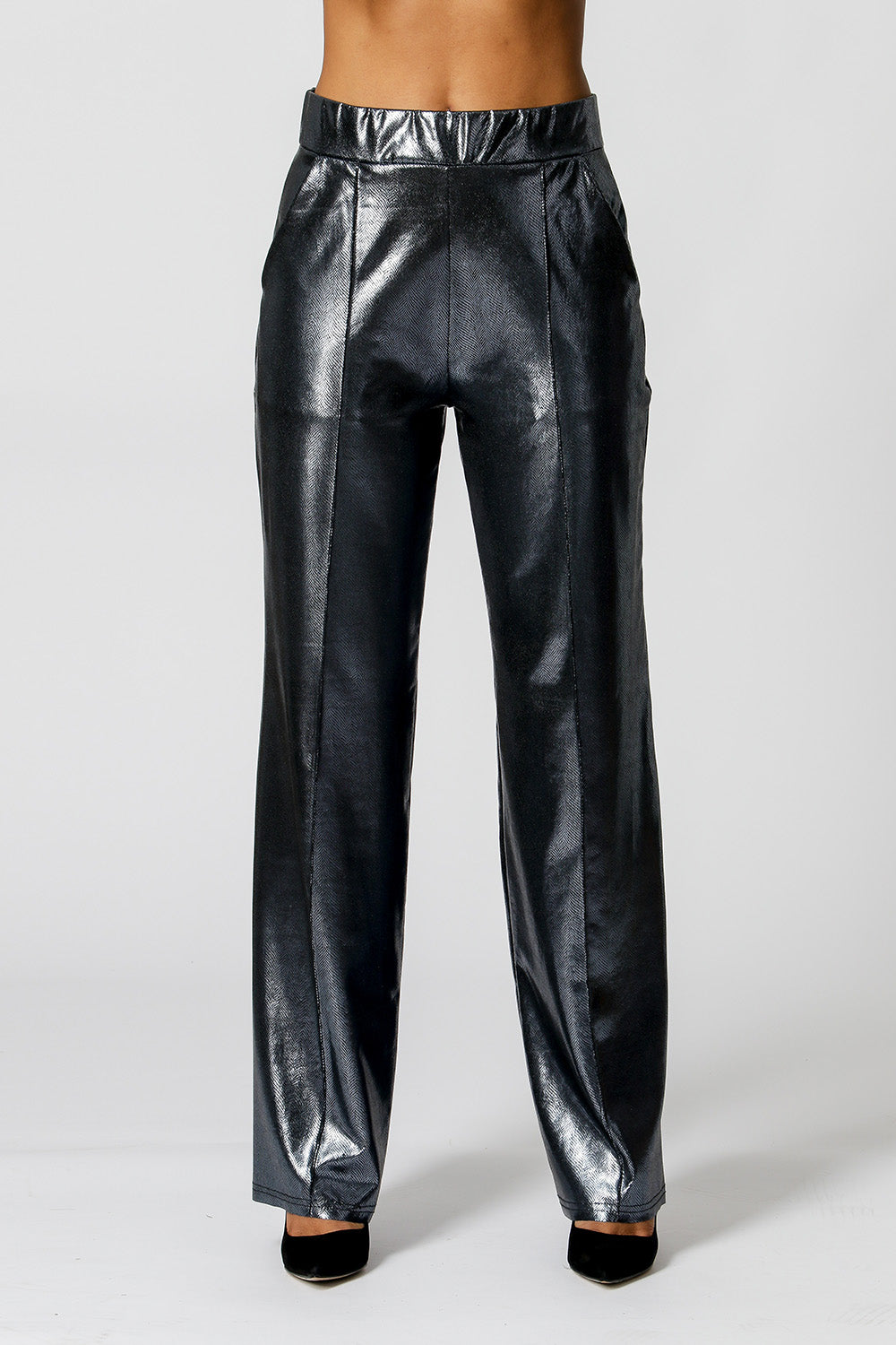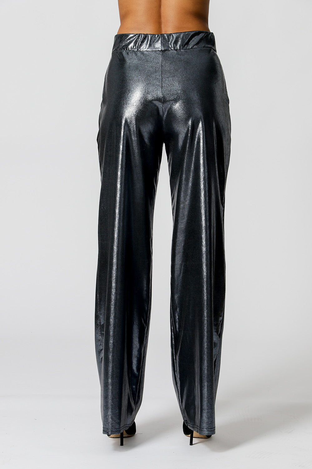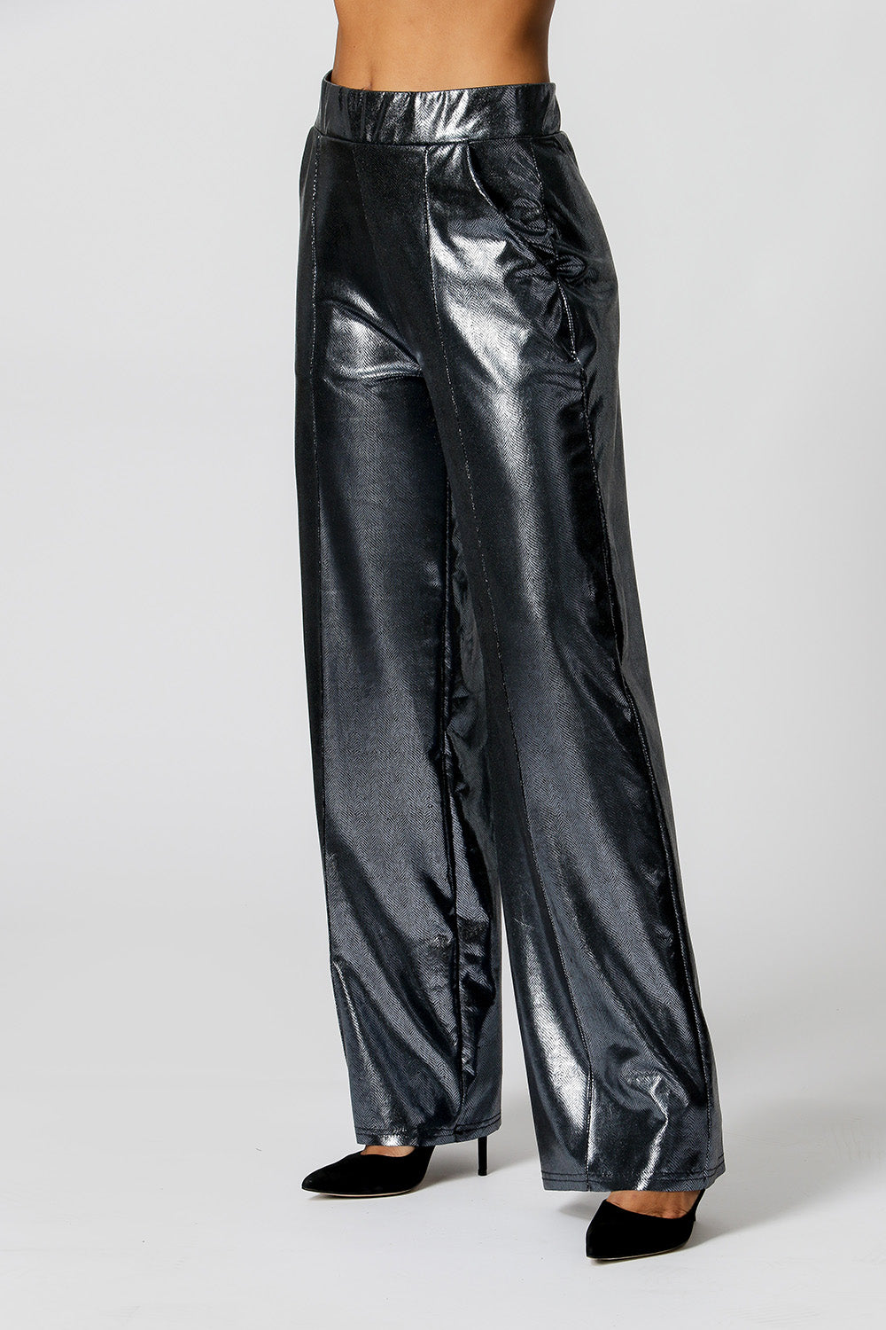 Calça pantalona feita em tecido brilhante. Com cós de elástico. A peça perfeita para o seu look night!