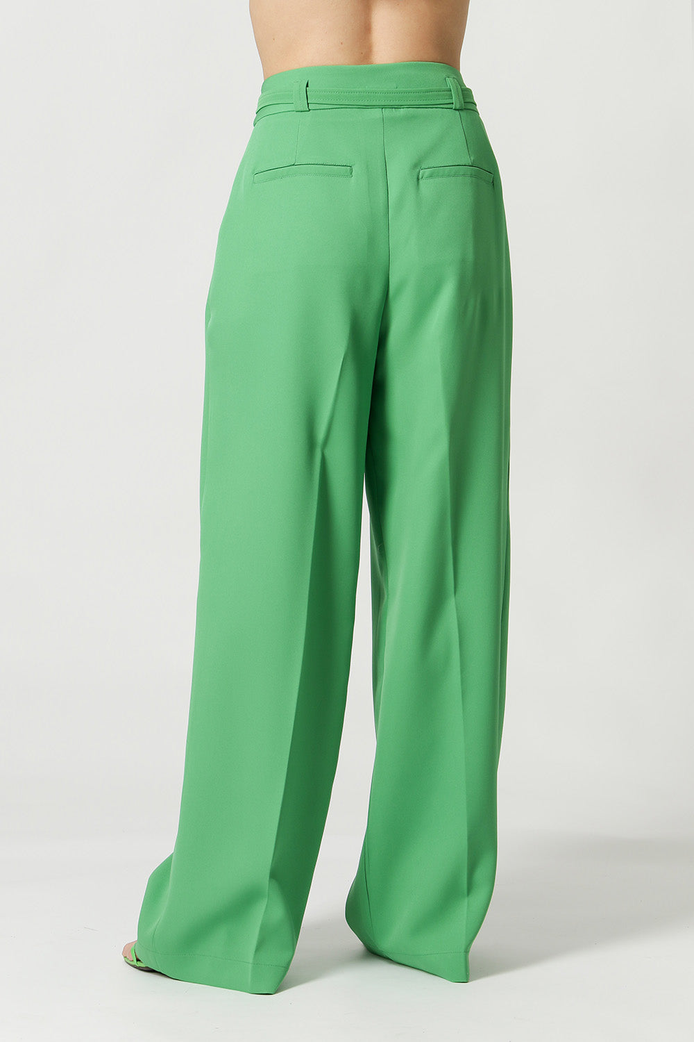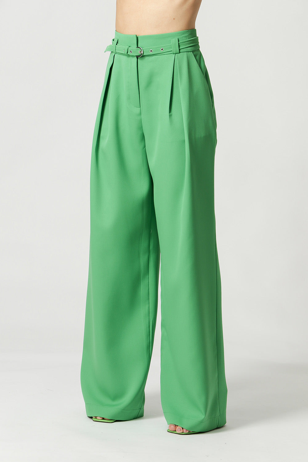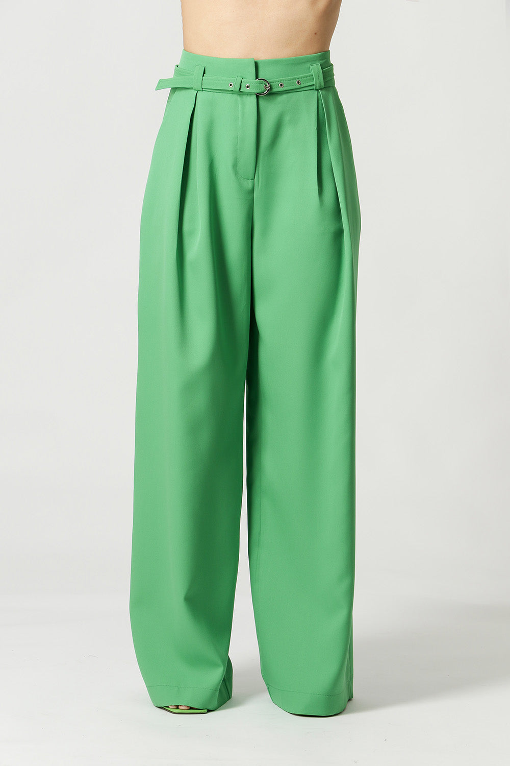 Calça pantalona feita em alfaiataria. Possui bolso faca, detalhe de pregas e cinto do próprio tecido com fivela de metal. Peça clássica e atemporal que vai deixar seu look mais elegante!