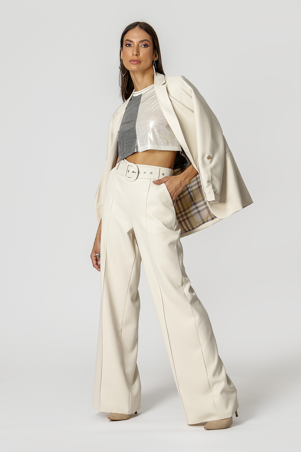 Calça pantalona de cintura alta com cinto e fivela forrados. Linha peça para váras ocasiões, tanto mais trabalho quanto mais casuais.