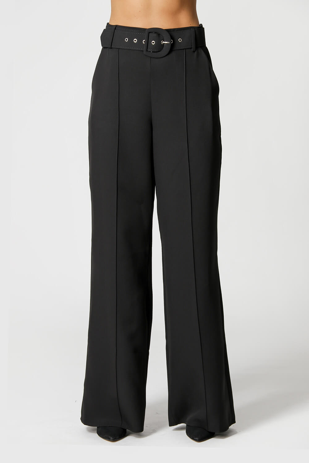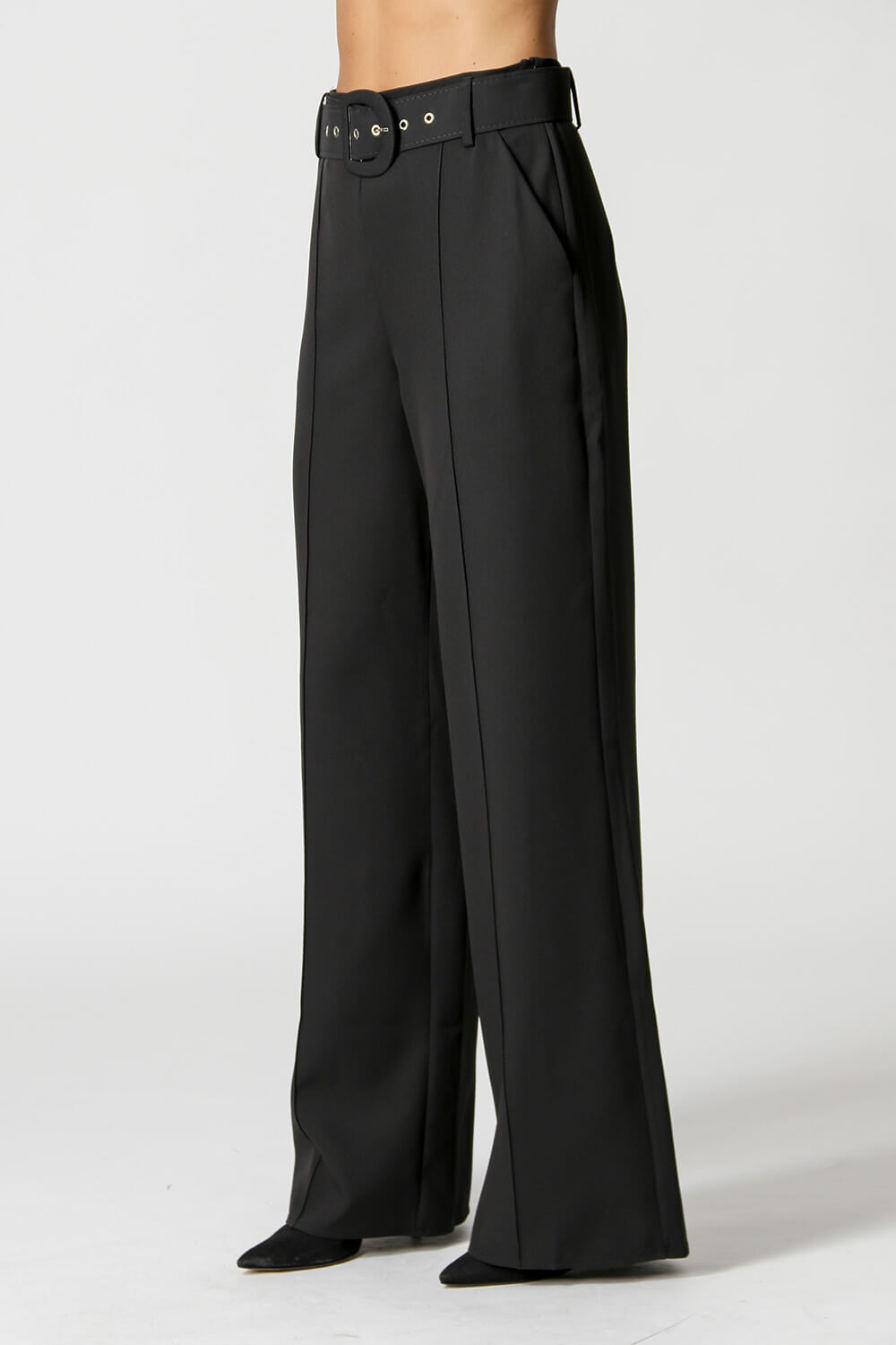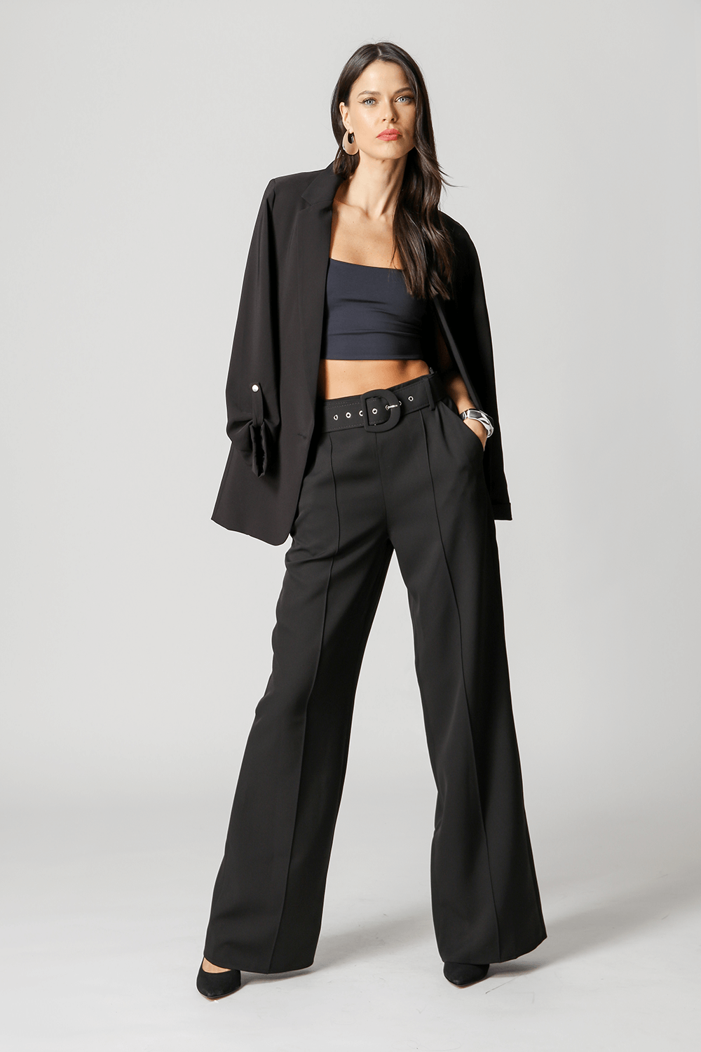 Calça pantalona de cintura alta com cinto e fivela forrados. Linha peça para váras ocasiões, tanto mais trabalho quanto mais casuais.