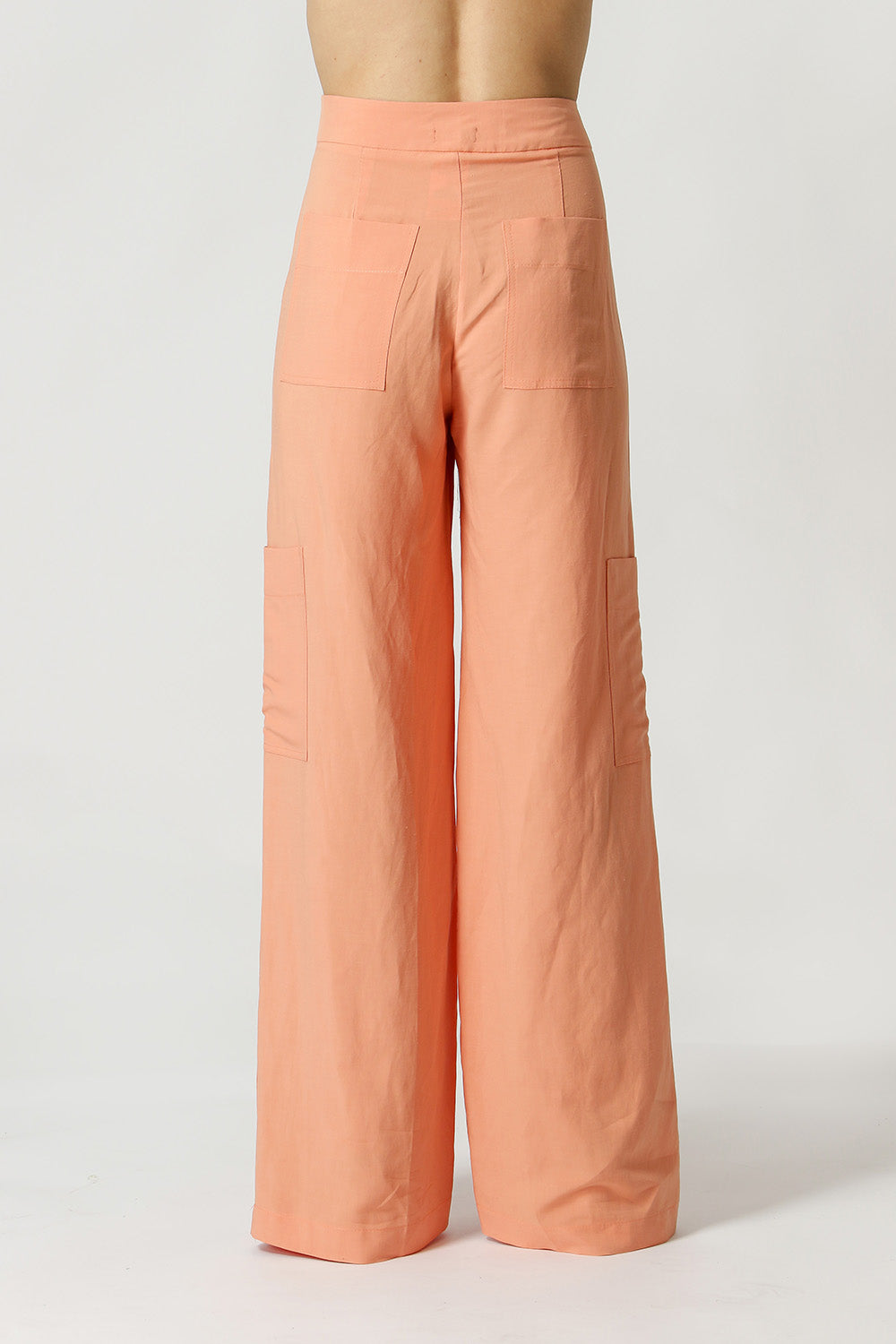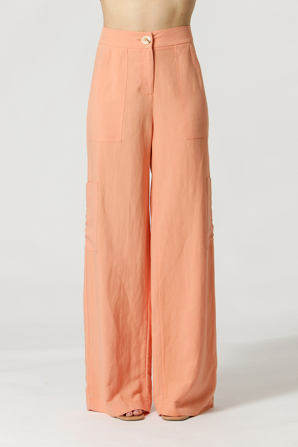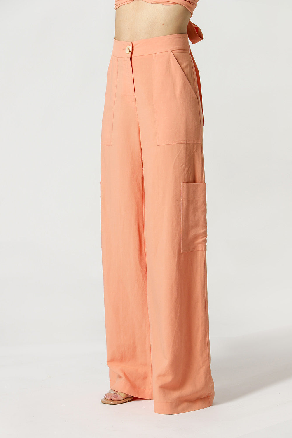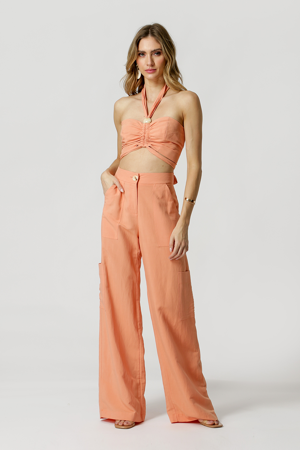 Calça com modelagem pantalona e bolsos pespontados. Peça tendência que não pode faltar nesta estação.