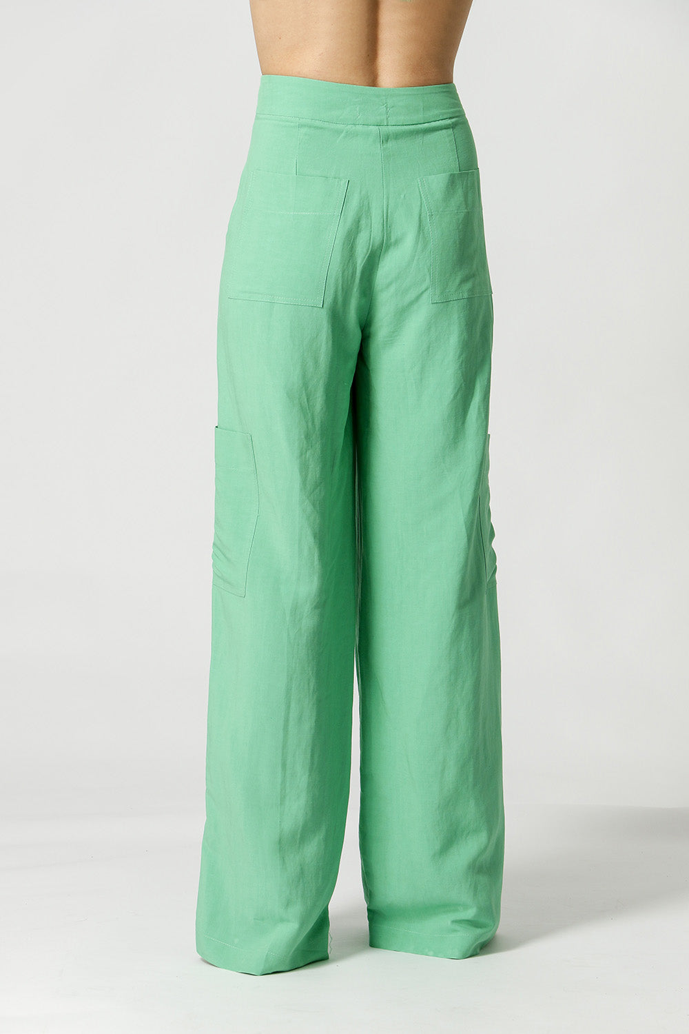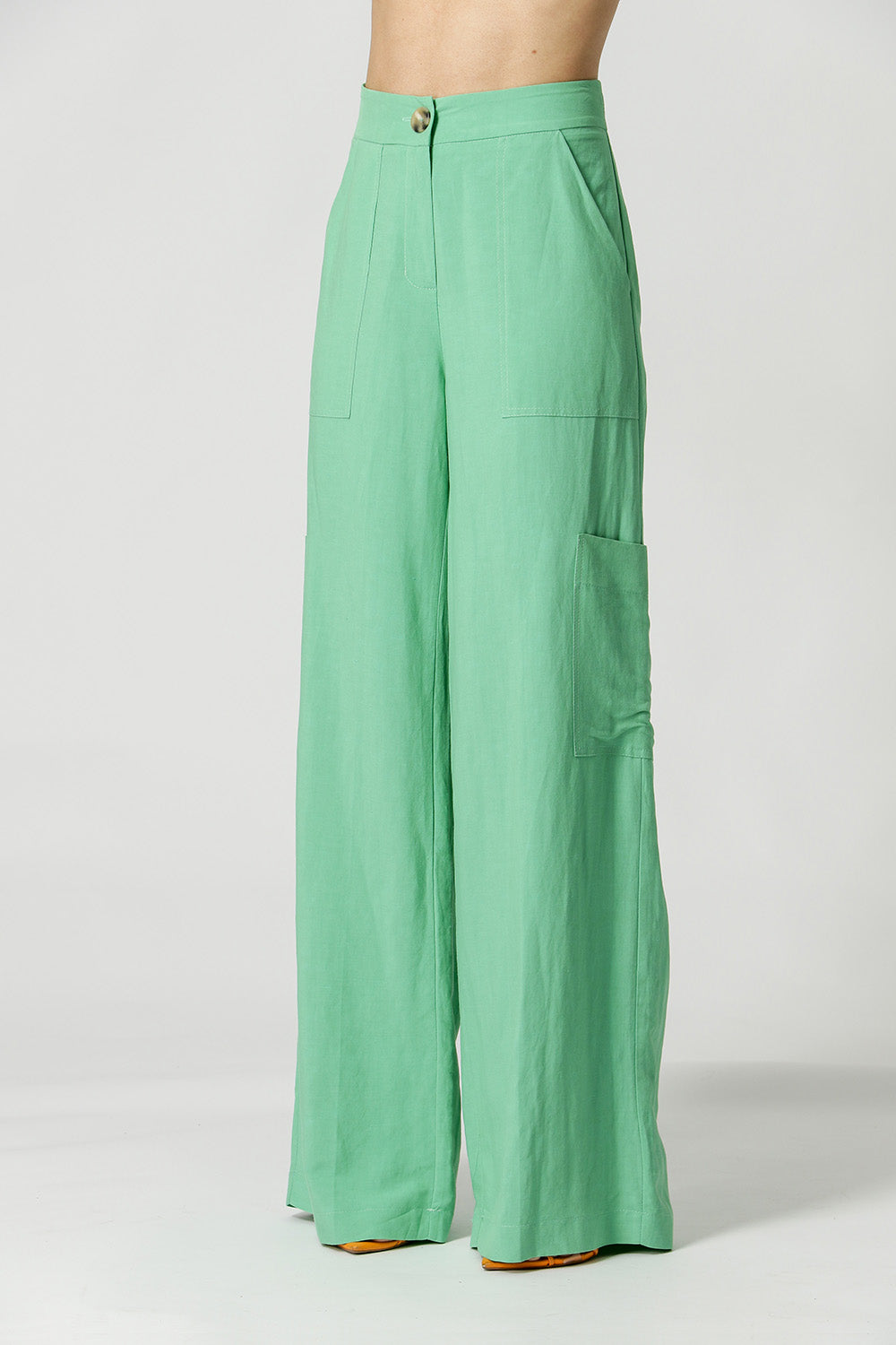 Calça com modelagem pantalona e bolsos pespontados. Peça tendência que não pode faltar nesta estação.