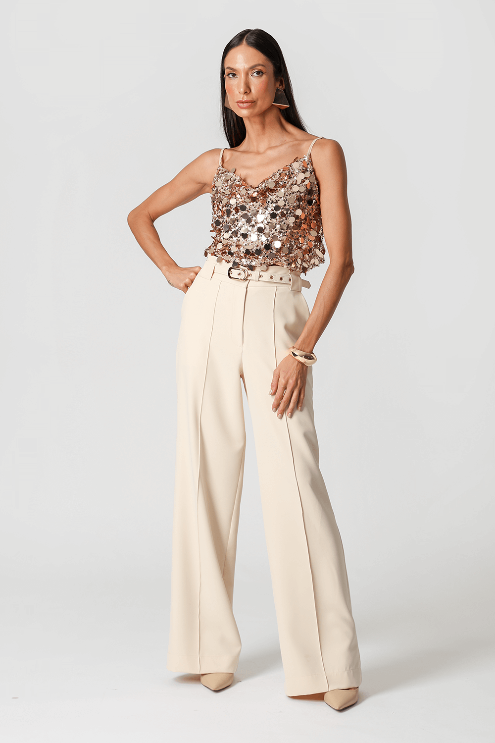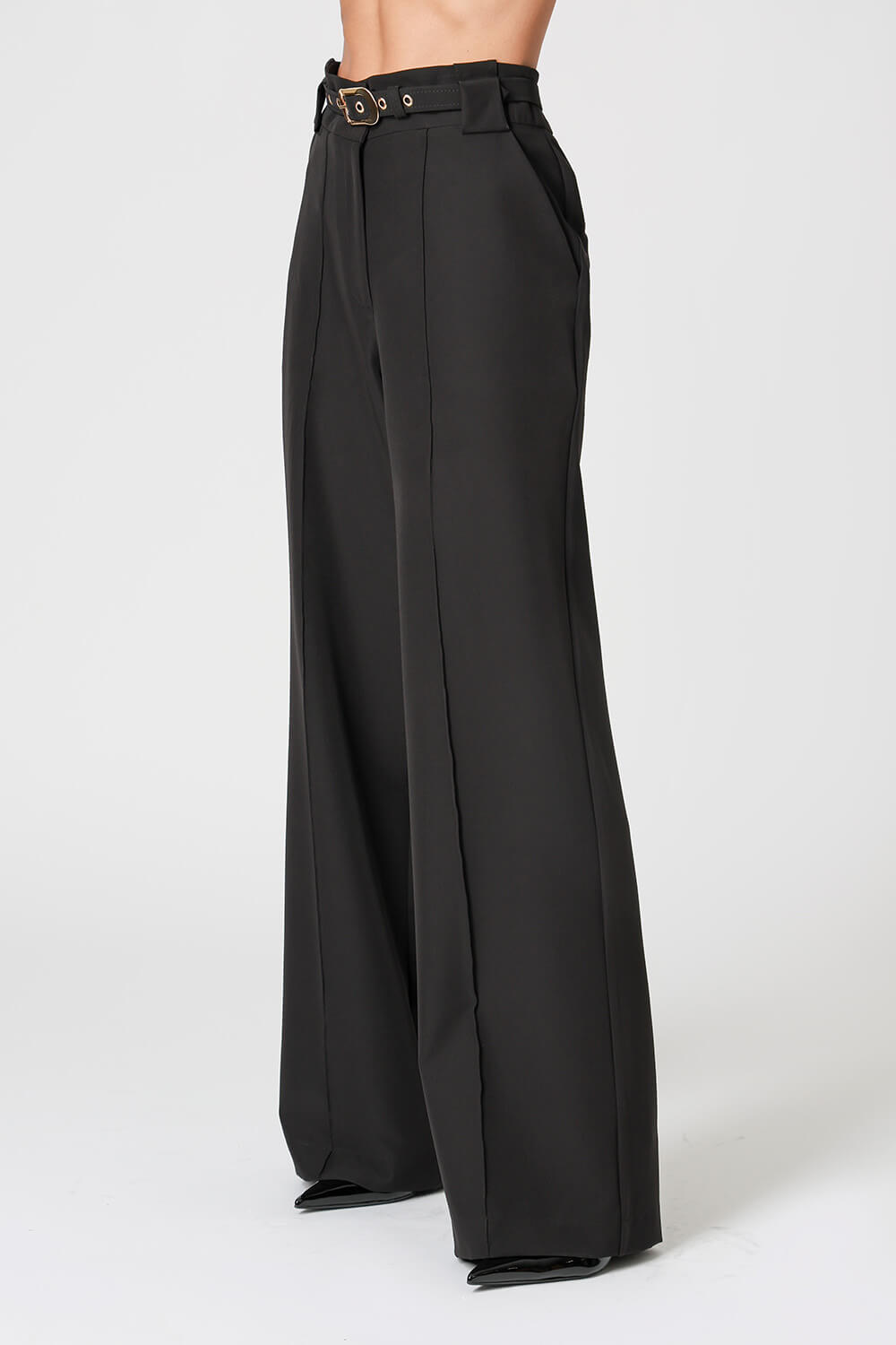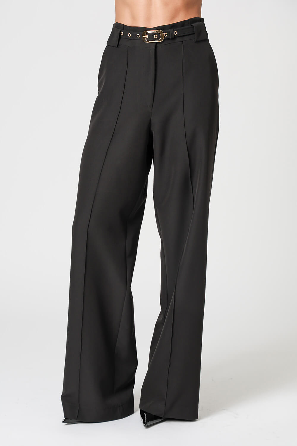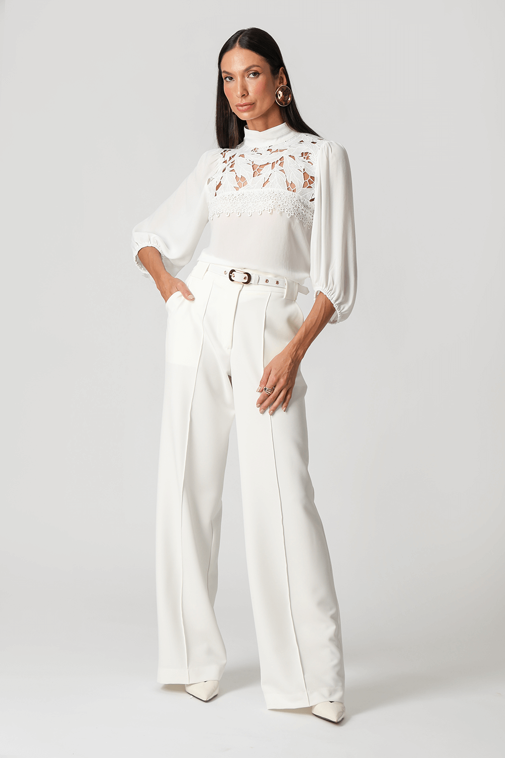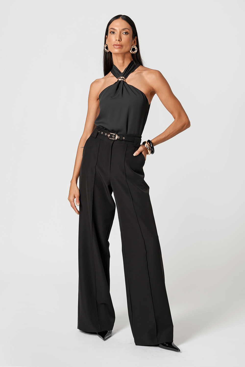 Calça pantalona em alfaiataria, com bolso faca, nervura frontal e passantes largos. Elegante e versátil, garante um caimento impecável e toque de sofisticação ao look.