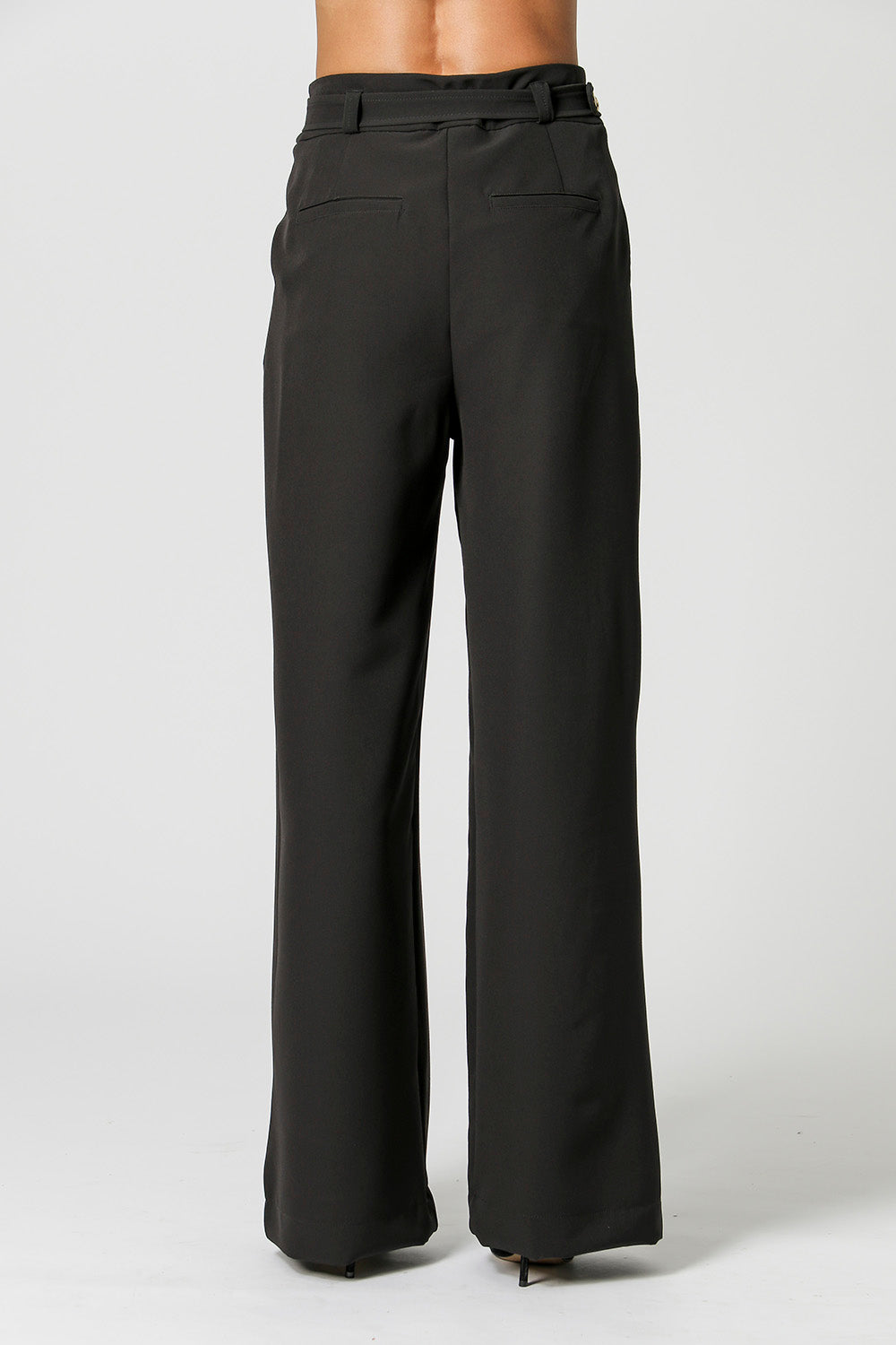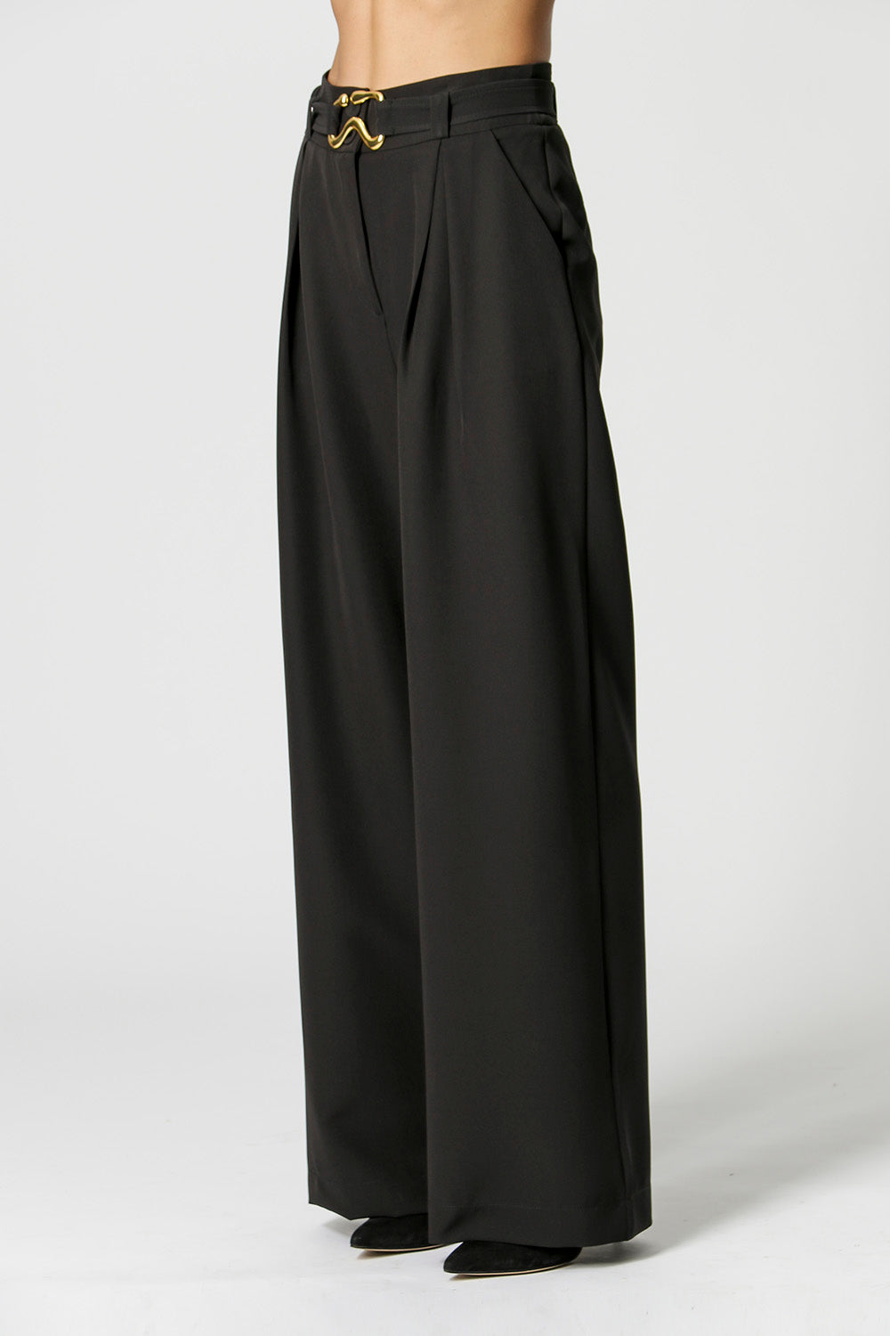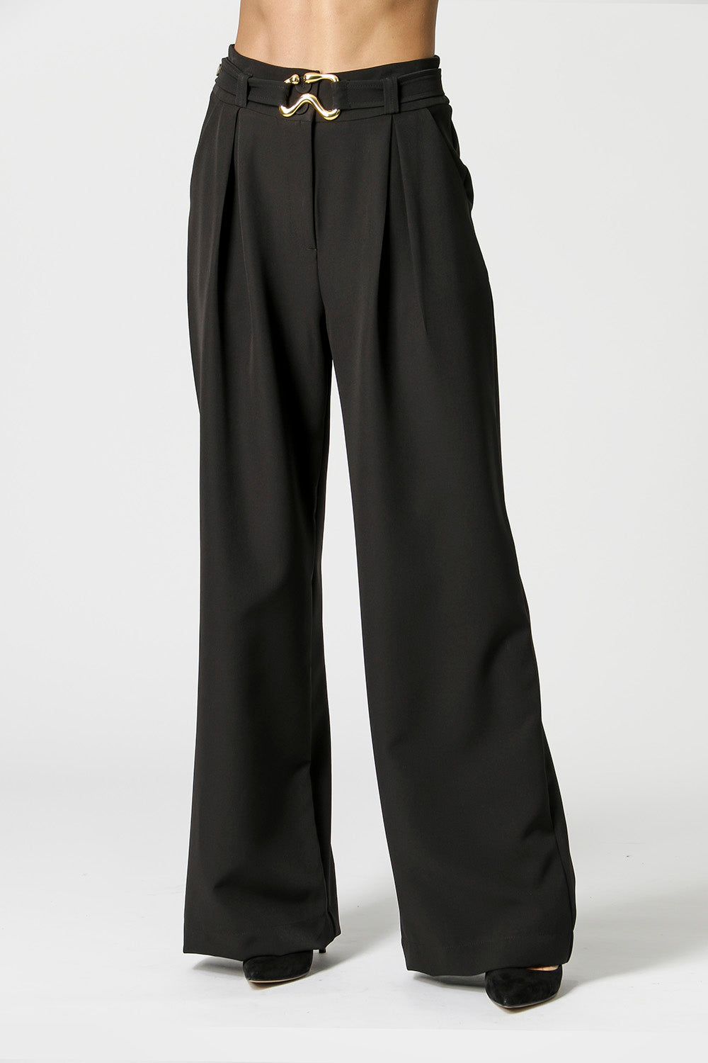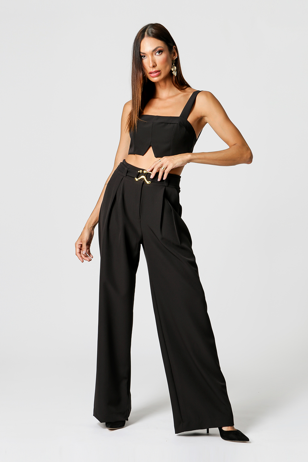 Calça de alfaiataria com shape pantalona, ganhando destaque com o cinto de fivela curva metalizada. Uma peça com um caimento perfeito e muito charme.