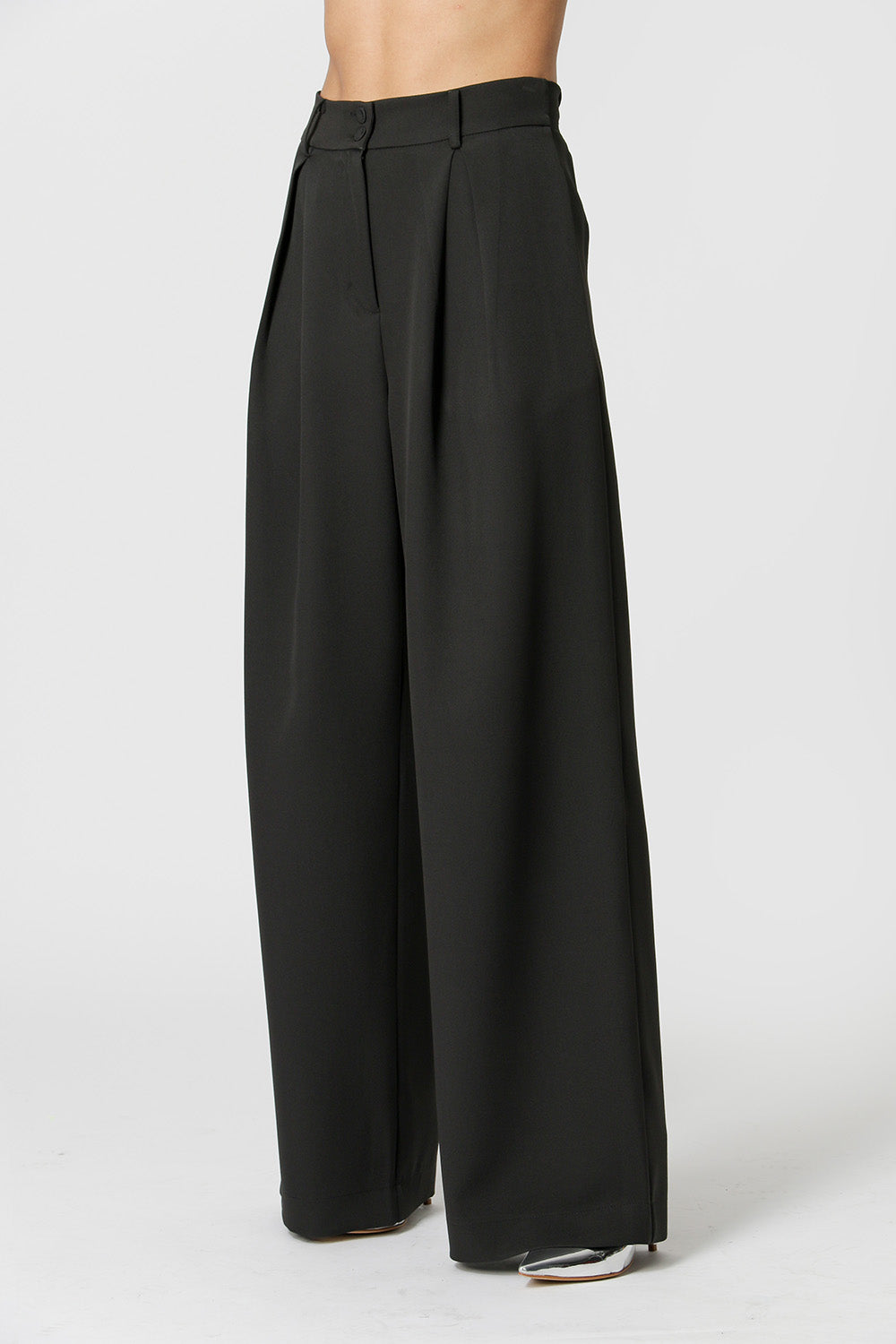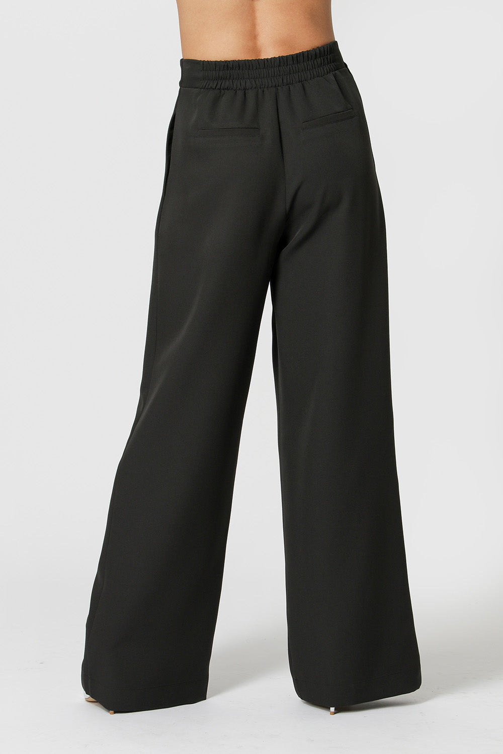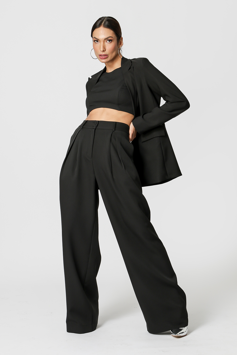Calça pantalona com detalhe de pregas. Possui elástico no cós traseiro. Peça feita em alfaiataria, um clássico que você precisa ter!