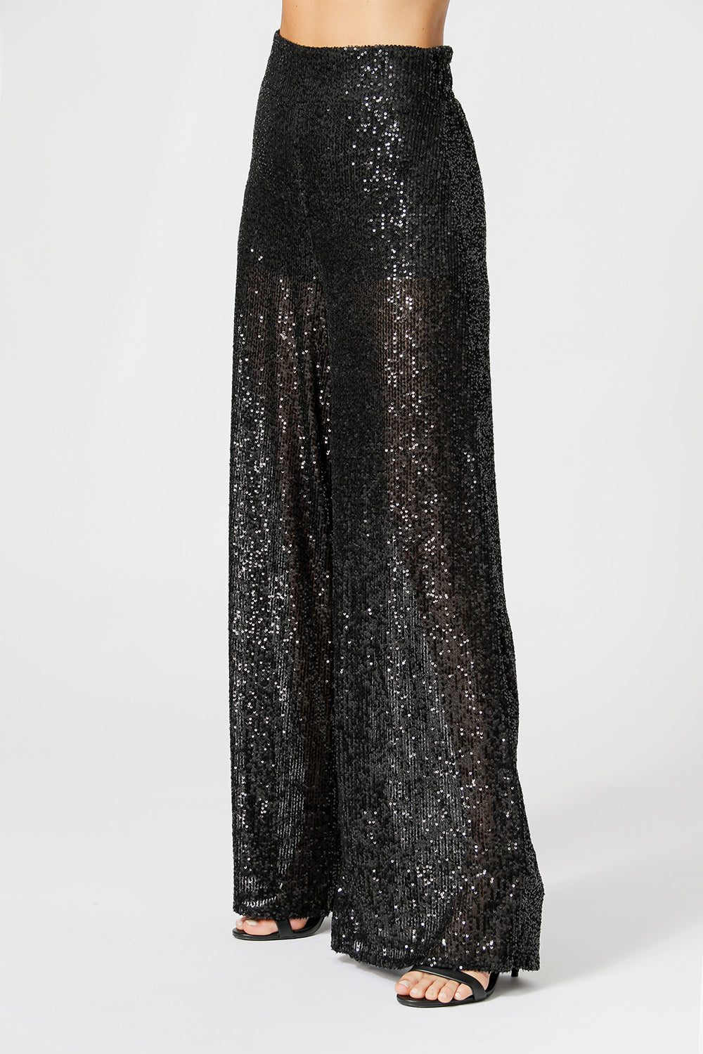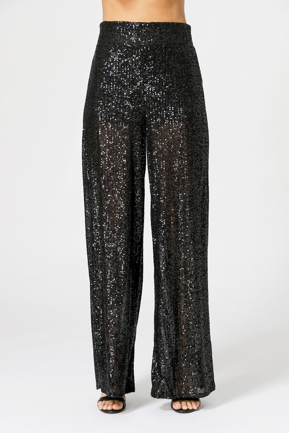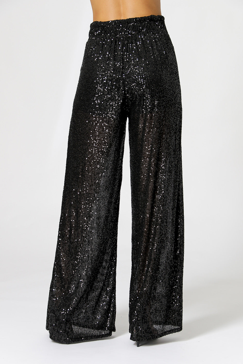 Calça pantalona com cós de elástico, forro e leve transparência na meia perna. Modelo marcante e indispensável para arrasar look glam.