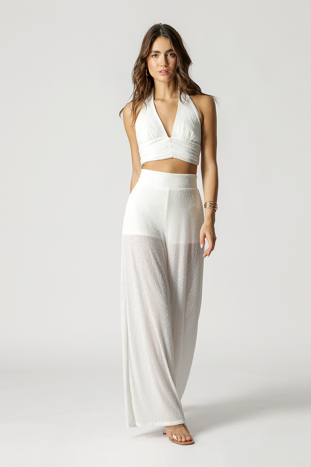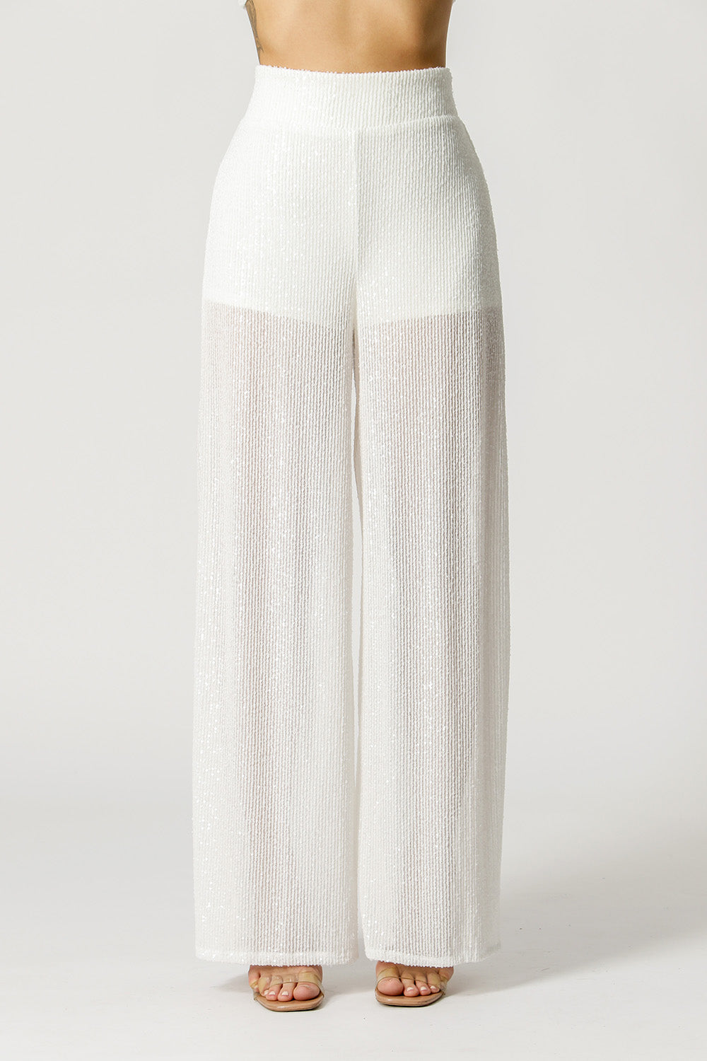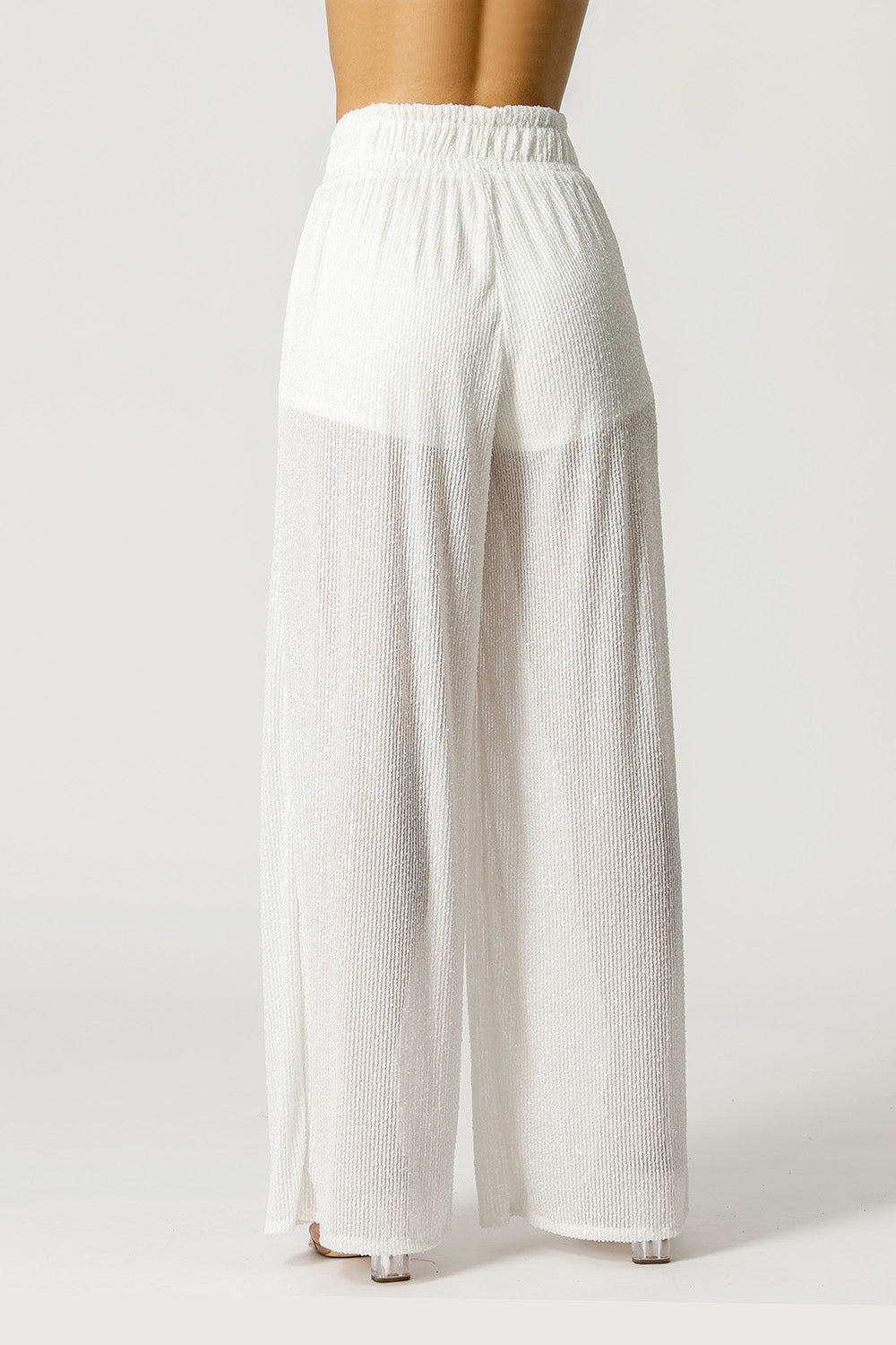 Calça pantalona com cós de elástico, forro e leve transparência na meia perna. Modelo marcante e indispensável para arrasar look glam.