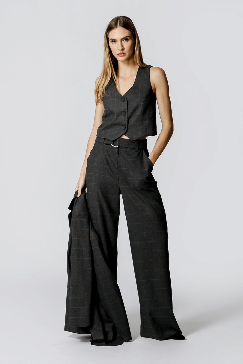 Calça pantalona acompanha um cinto faixa com fivela meia lua onix. Com botão forrado do próprio tecido, feito em tecido de alfaiataria risca de giz, um item chave para atualizar o look.