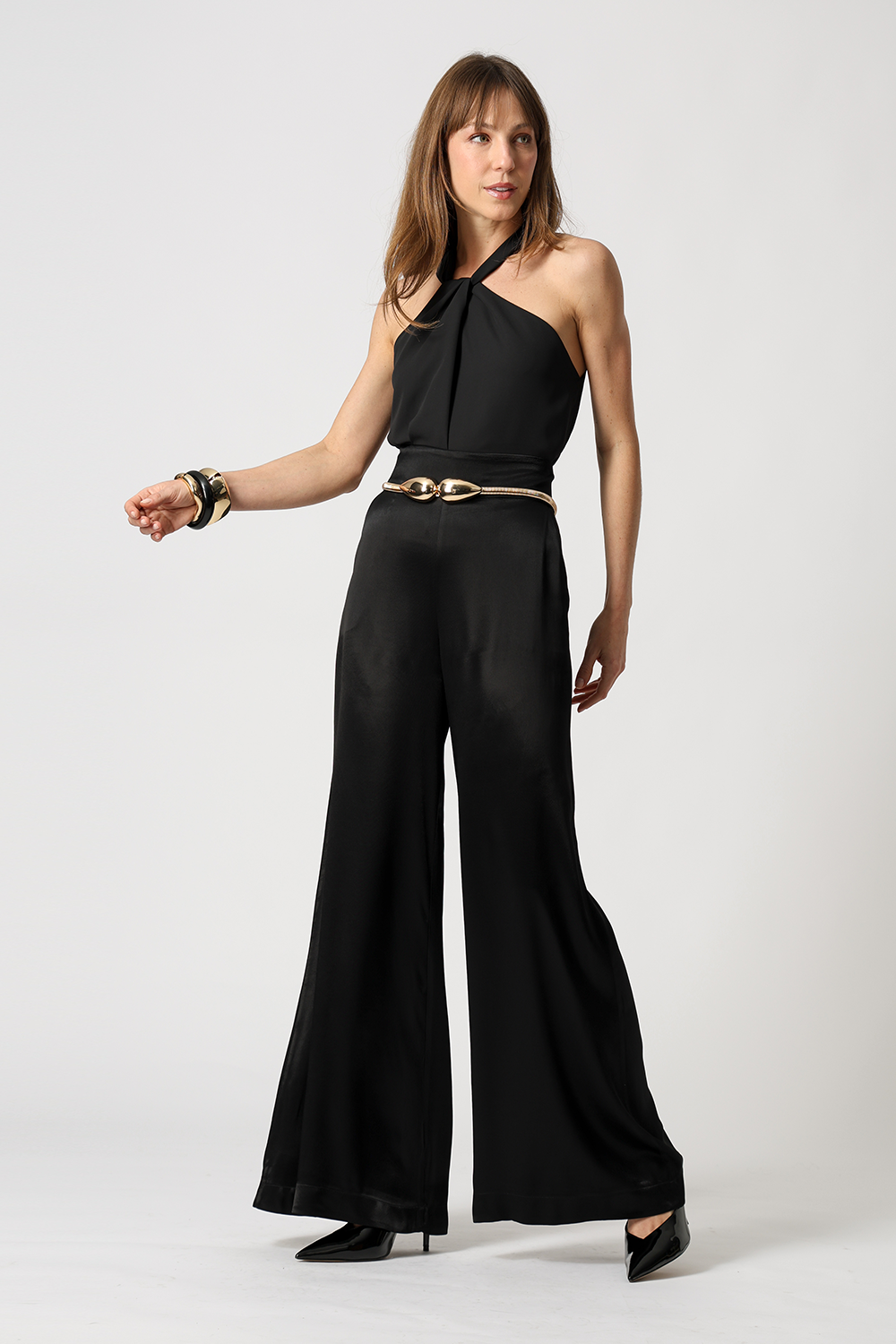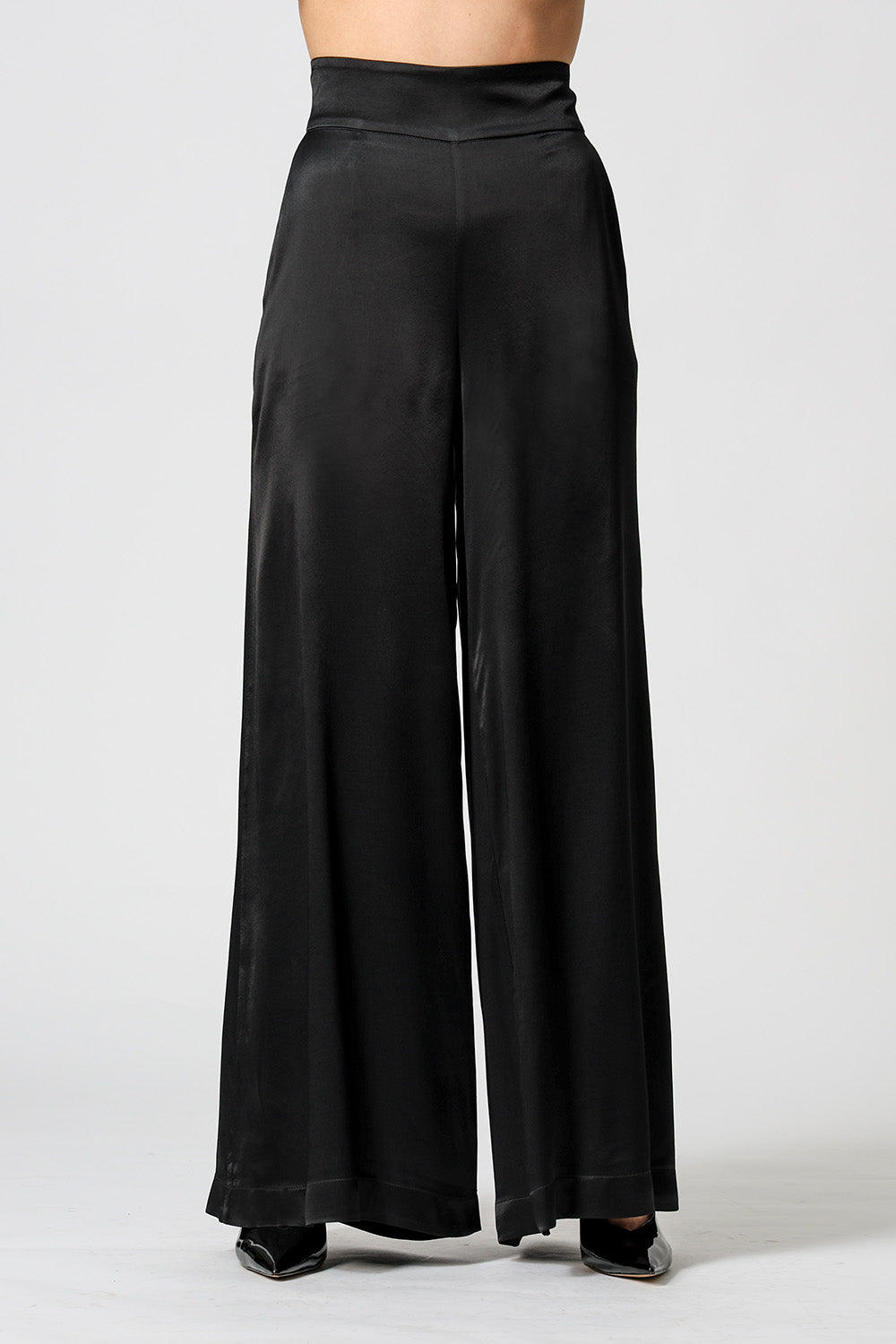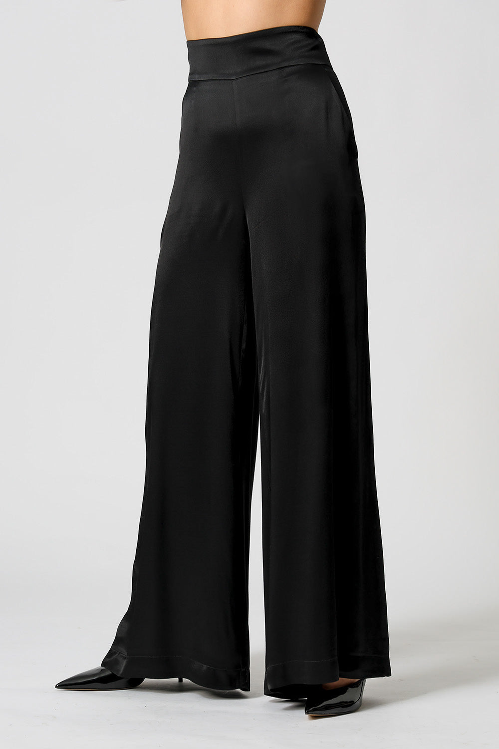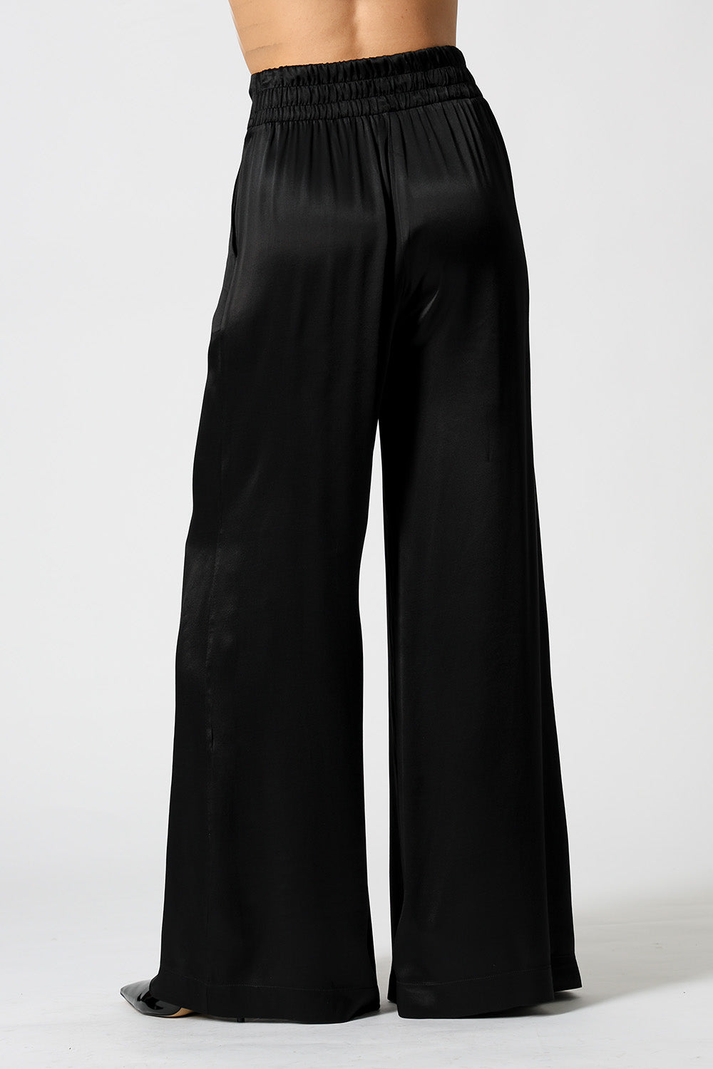 Com caimento sofisticado, a calça pantalona em cetim premium possui bolsos funcionais e elástico nas costas para mais conforto. Elegante e versátil para diversas ocasiões.