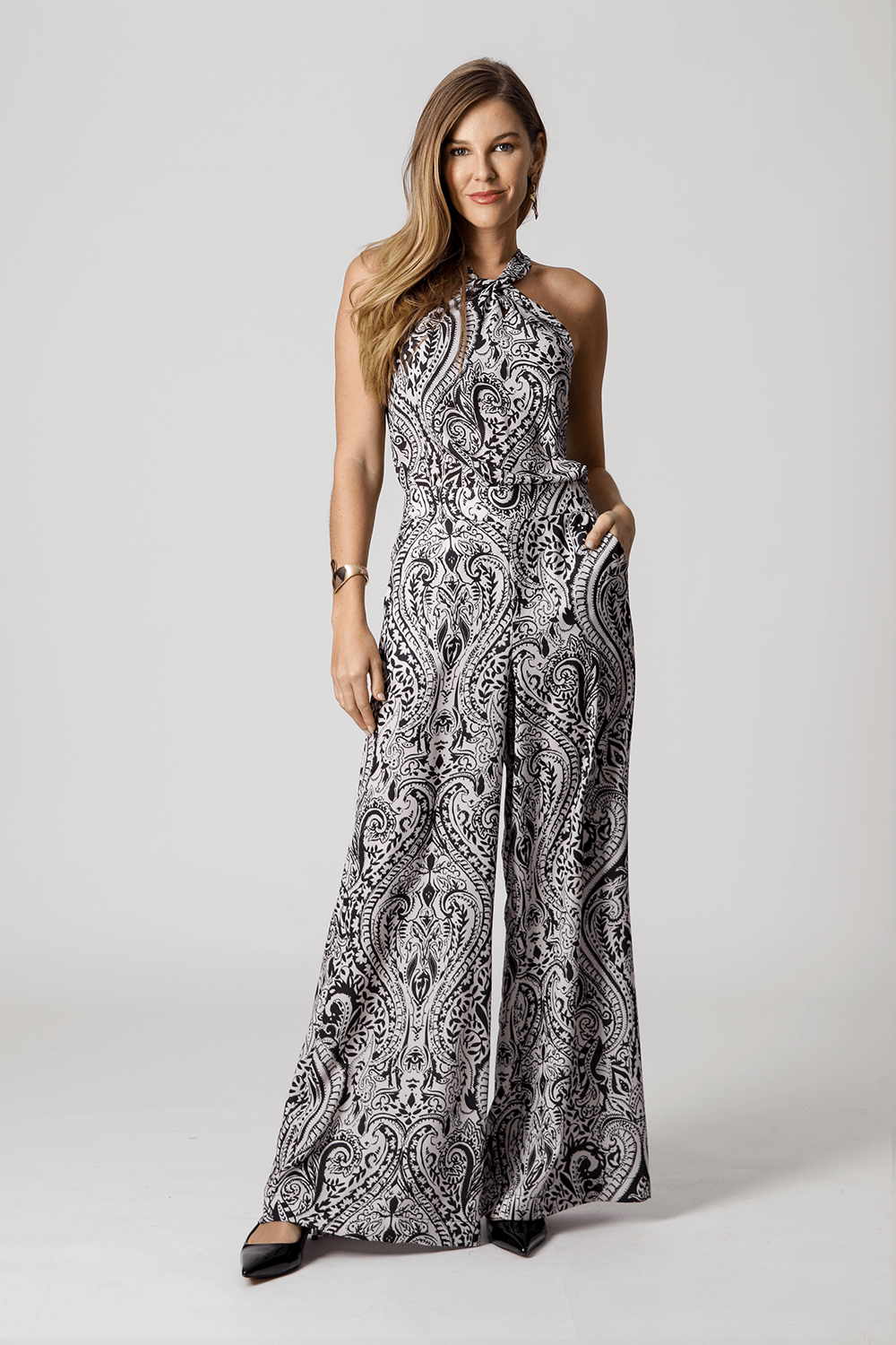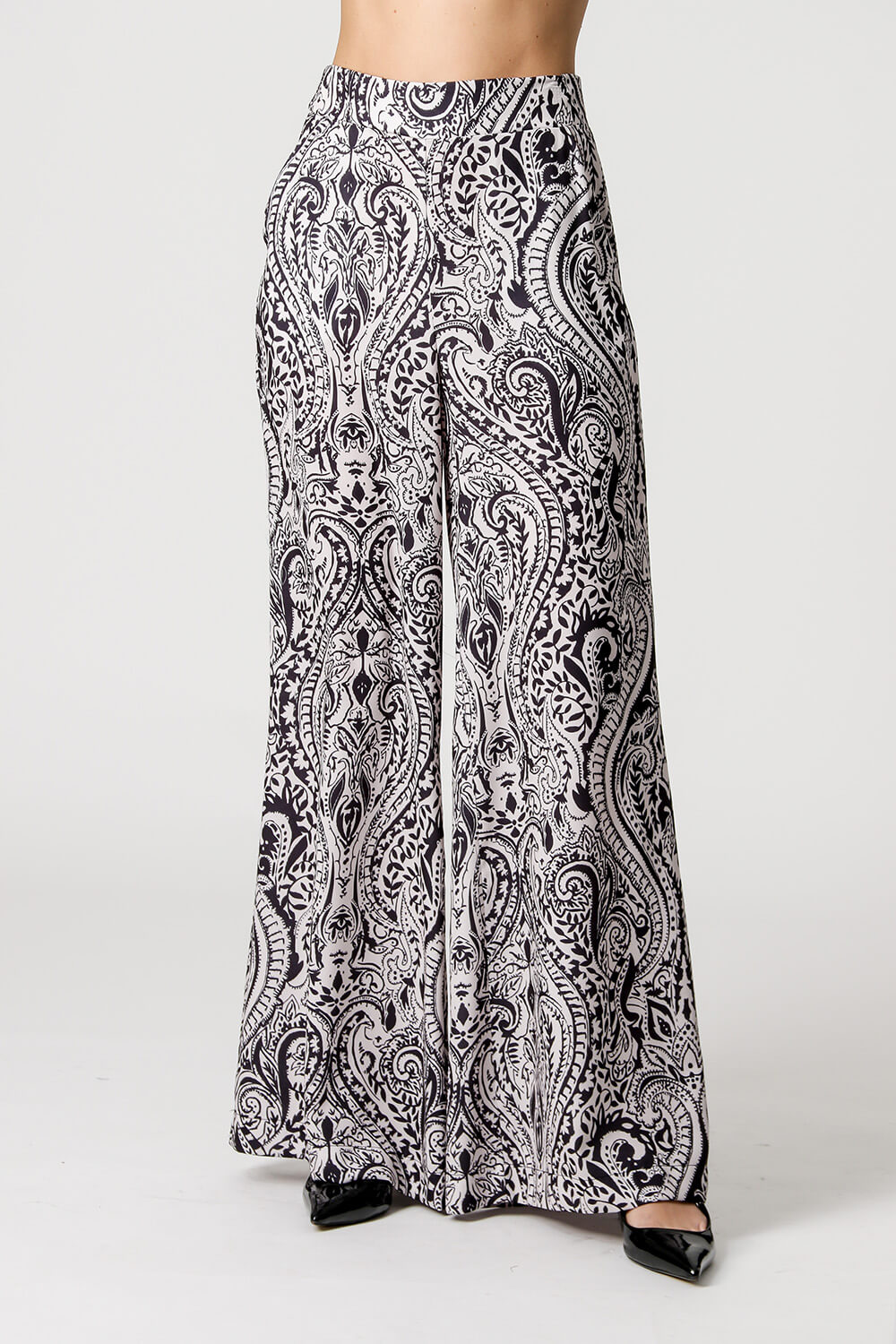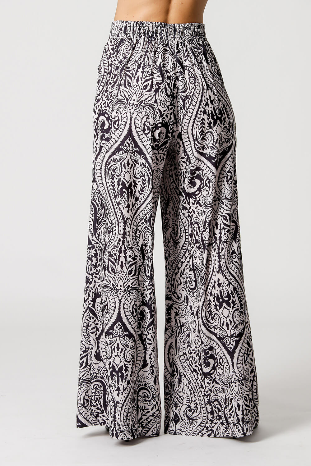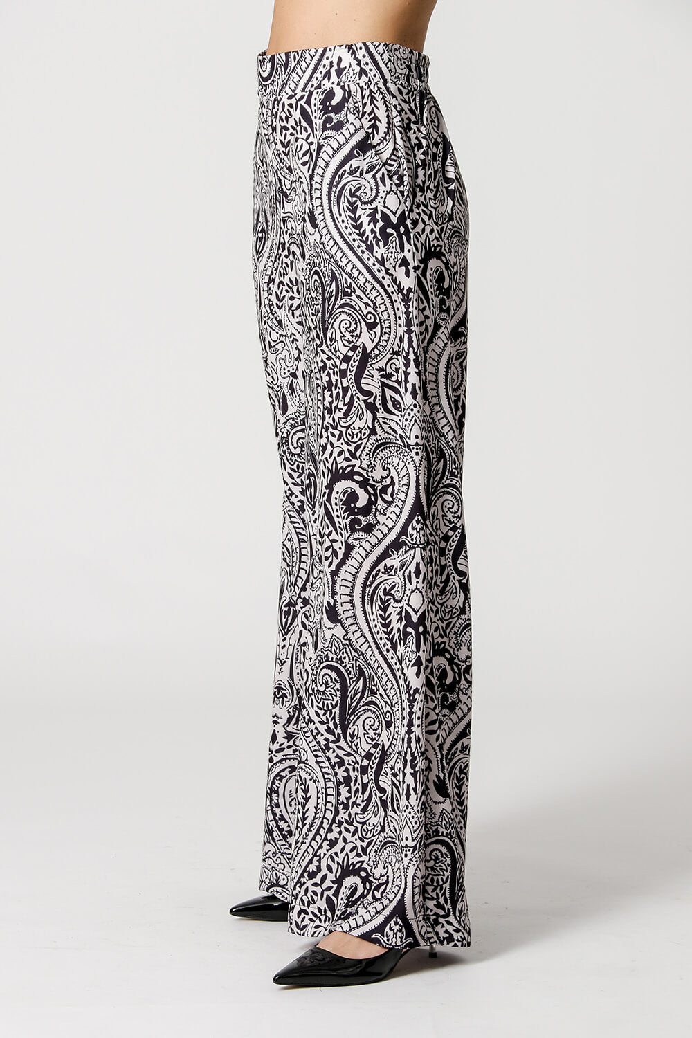 Calça pantalona com bolso e elástico na parte posterior, um modelo confeccionado em tecido leve com caimento fluído estampado, perfeito para looks elegante e casual aposte nesta peça.