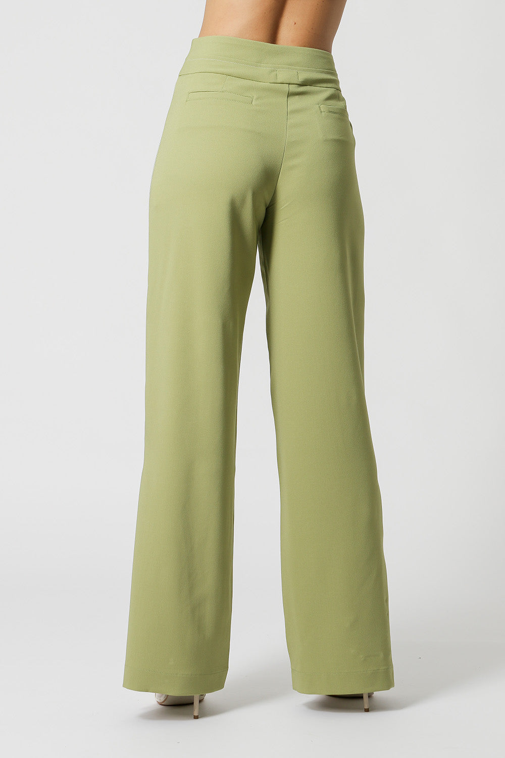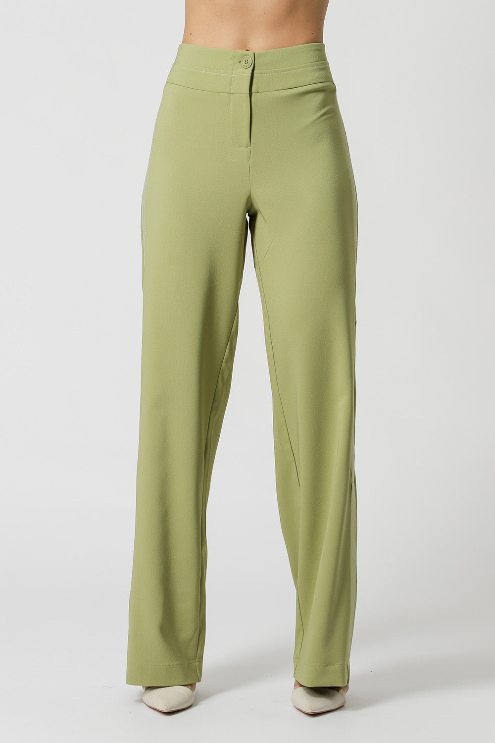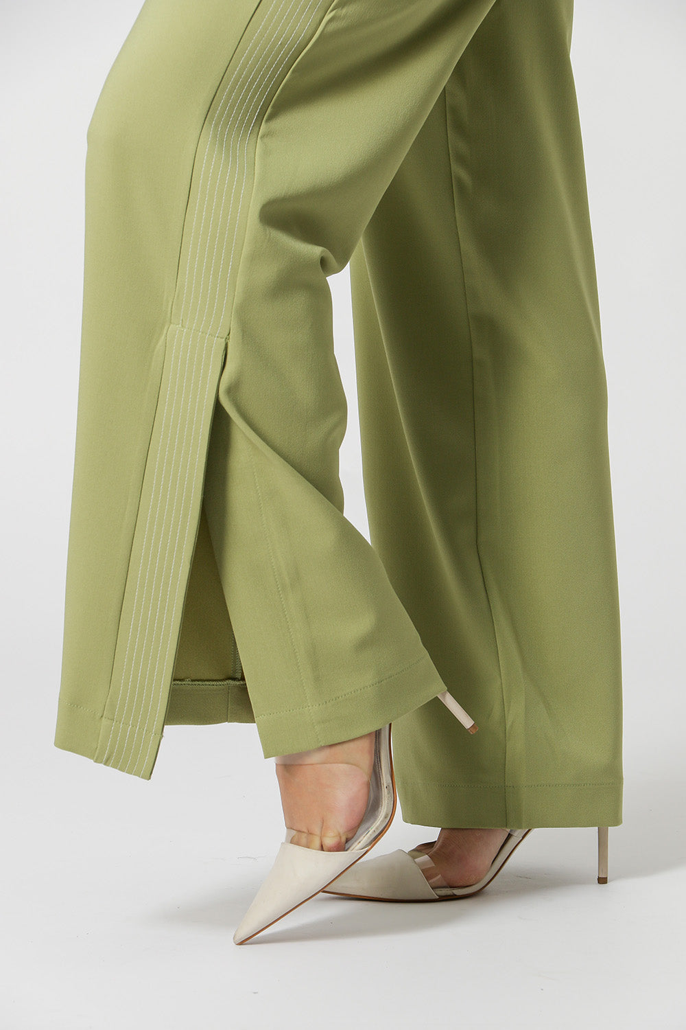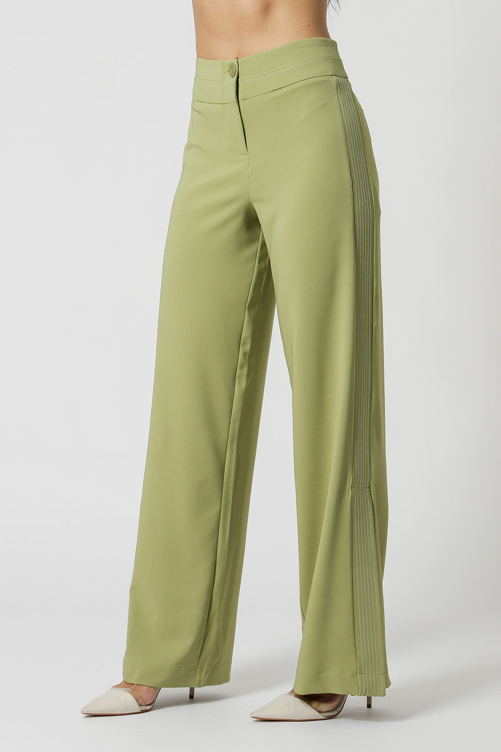 Calça pantalona com detalhe de pesponto contrastante por toda peça. Possui fendas laterais e bolso embutido traseiro. Peça trendy para arrasar em suas produções.