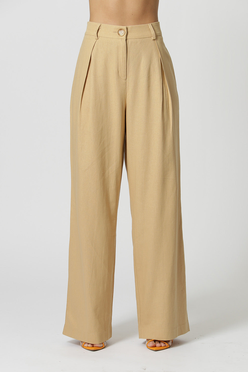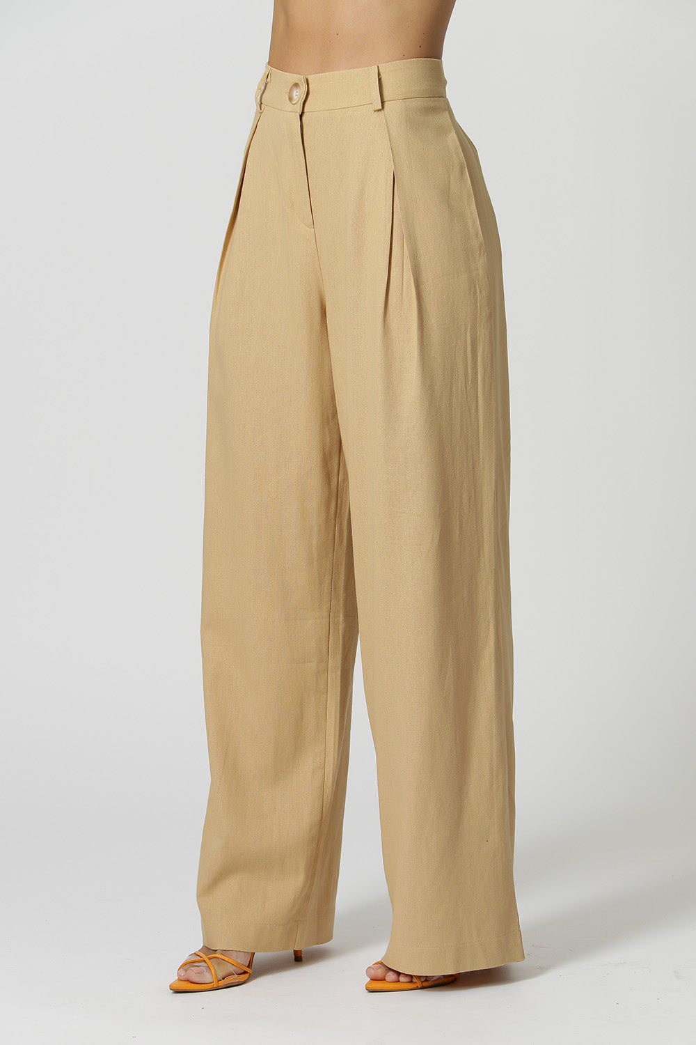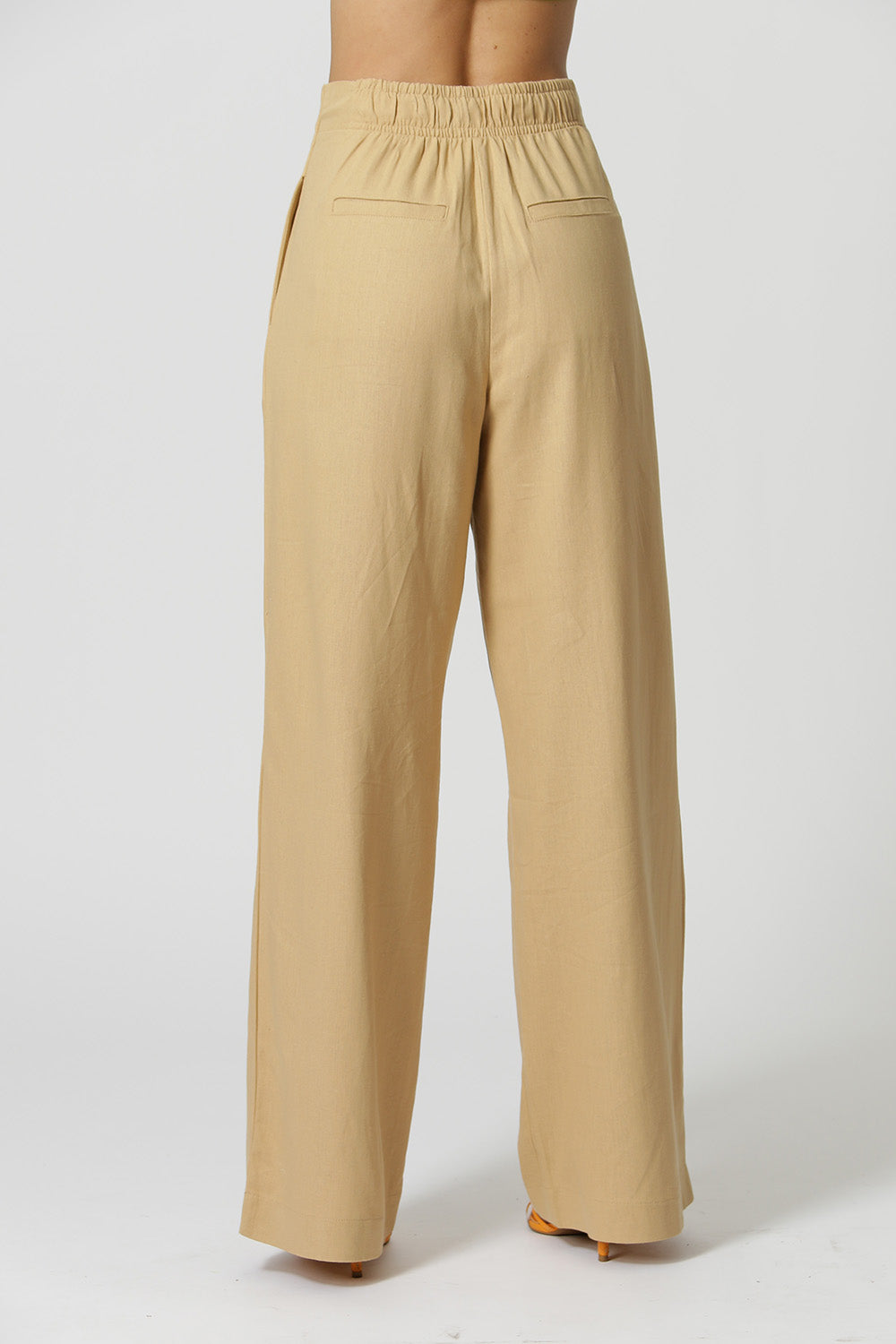 Calça pantalona com detalhe de pregas transpassadas e cós traseiro com elástico. Peça feita em linho. Um clássico que você precisa ter no guarda roupa!