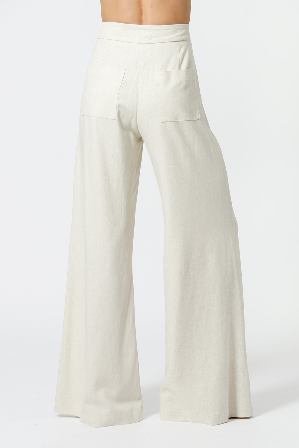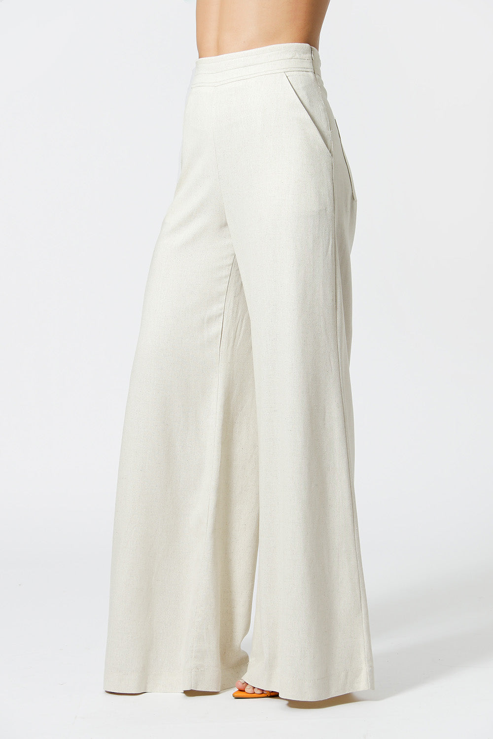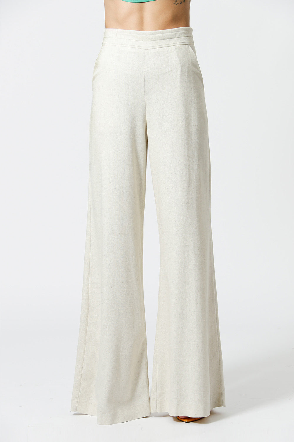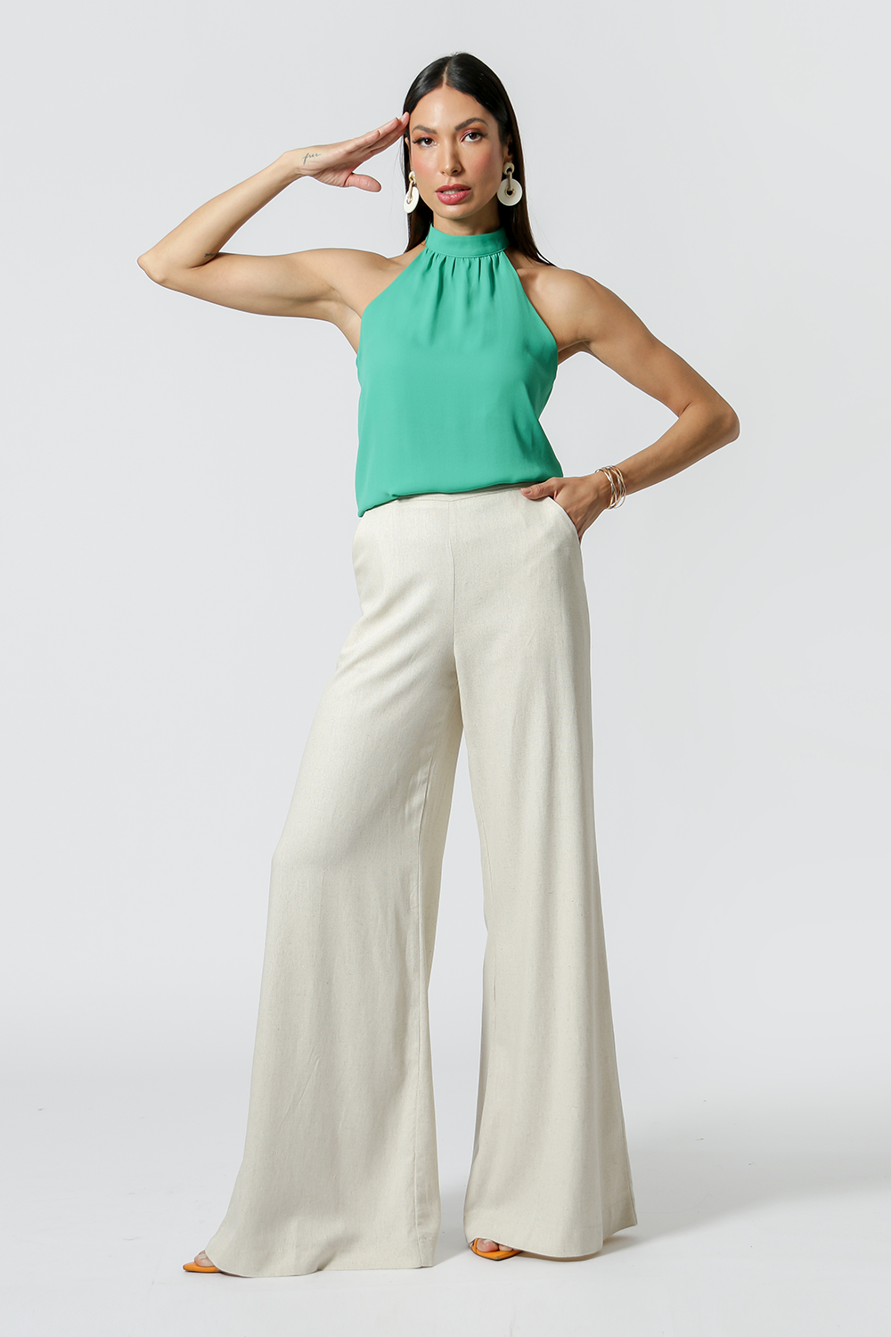 Calça pantalona com detalhe de pregas no cós, bolso faca, zíper invisível na lateral e pence nas costas. Modelo feito em linho fresh, ideal para um look casual chic.