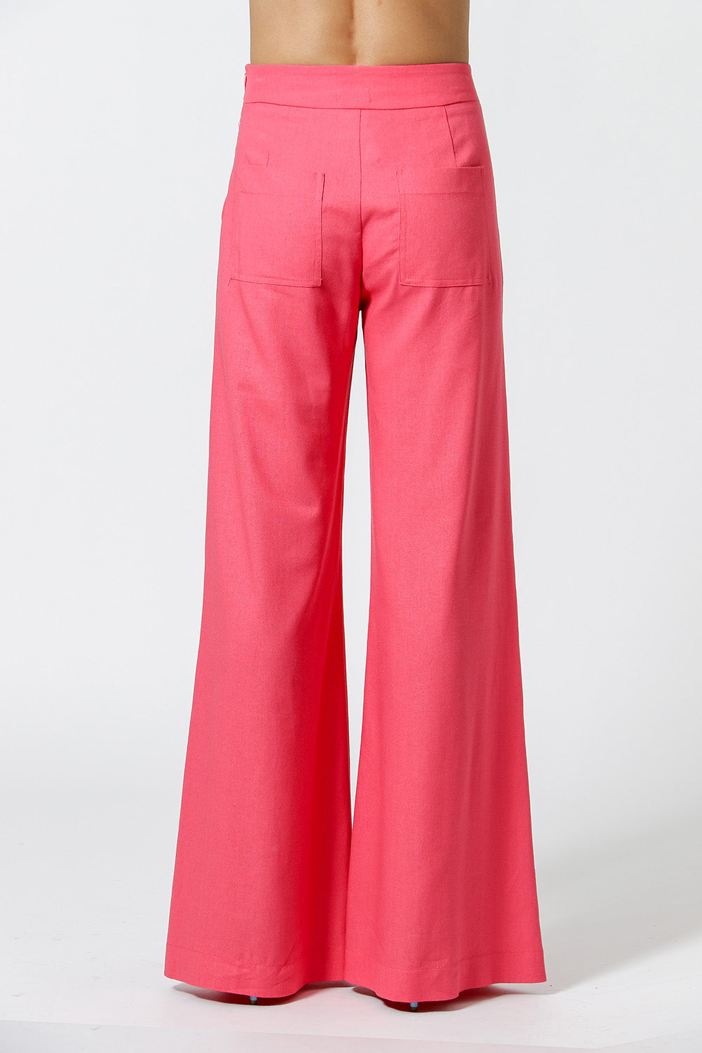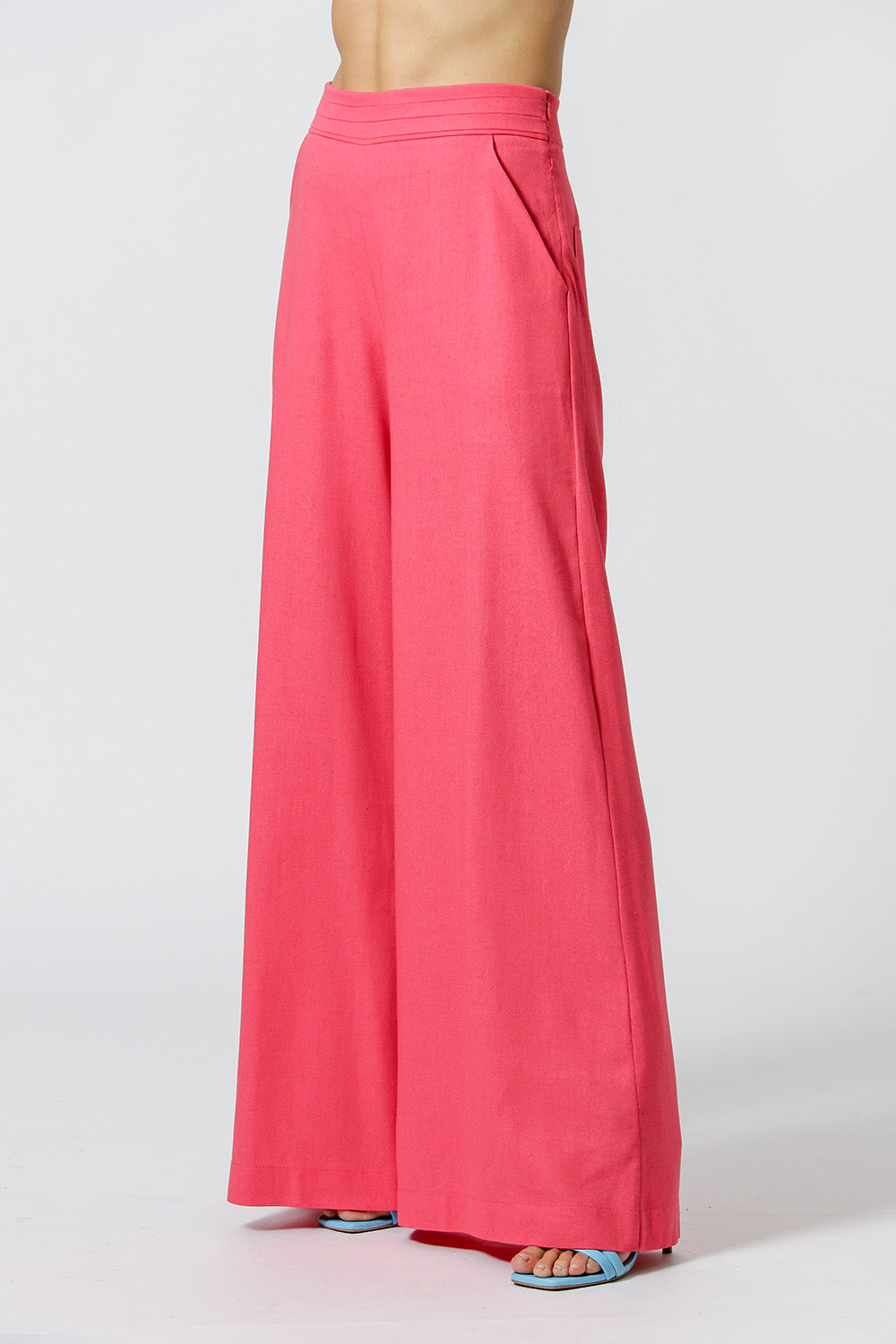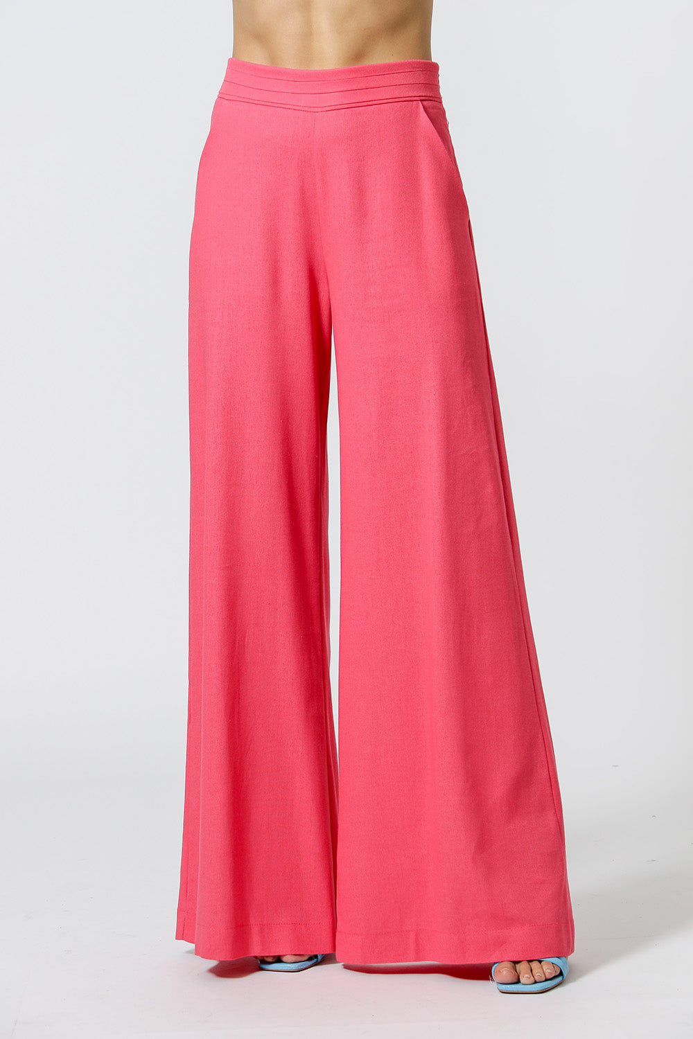 Calça pantalona com detalhe de pregas no cós, bolso faca, zíper invisível na lateral e pence nas costas. Modelo feito em linho fresh, ideal para um look casual chic.