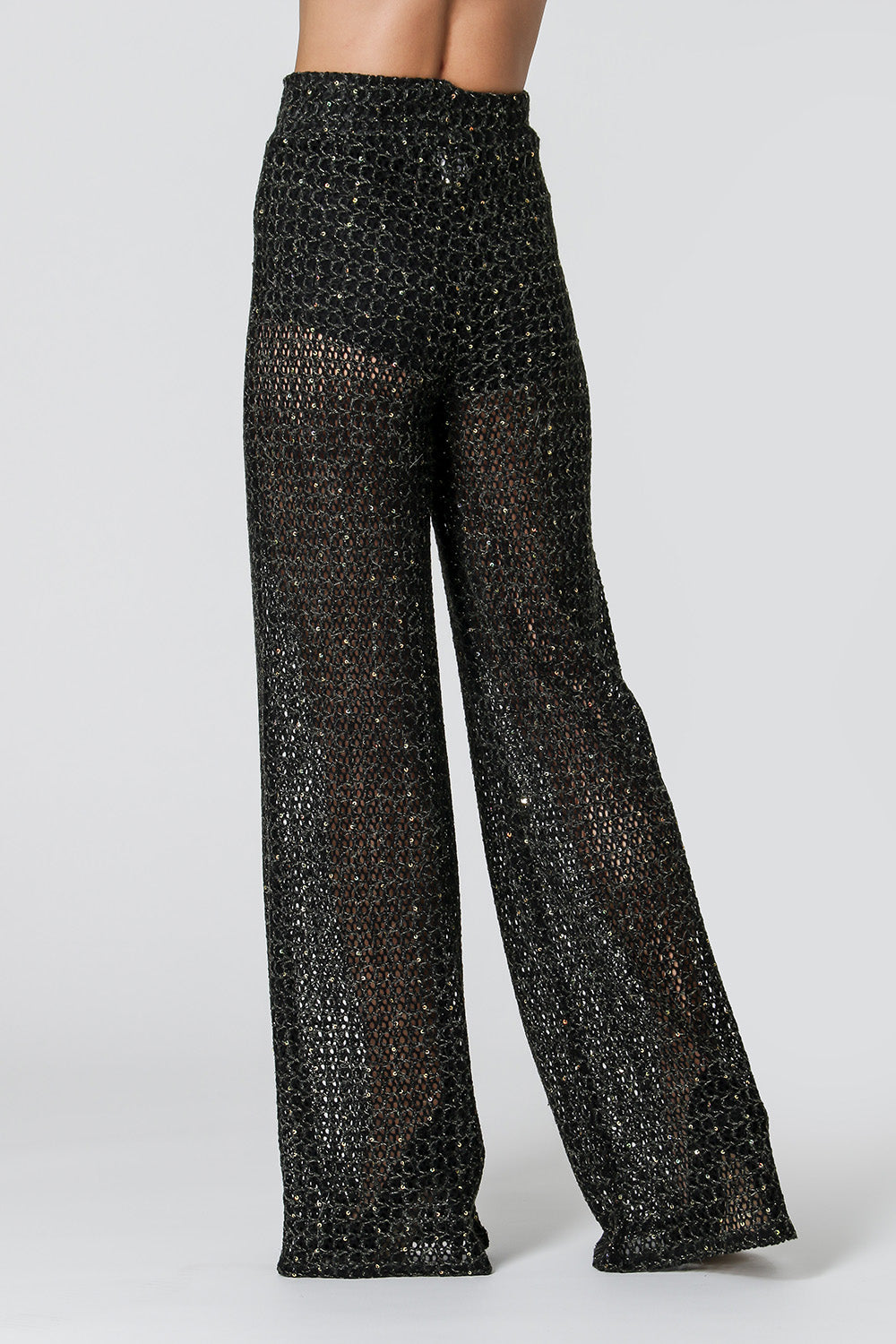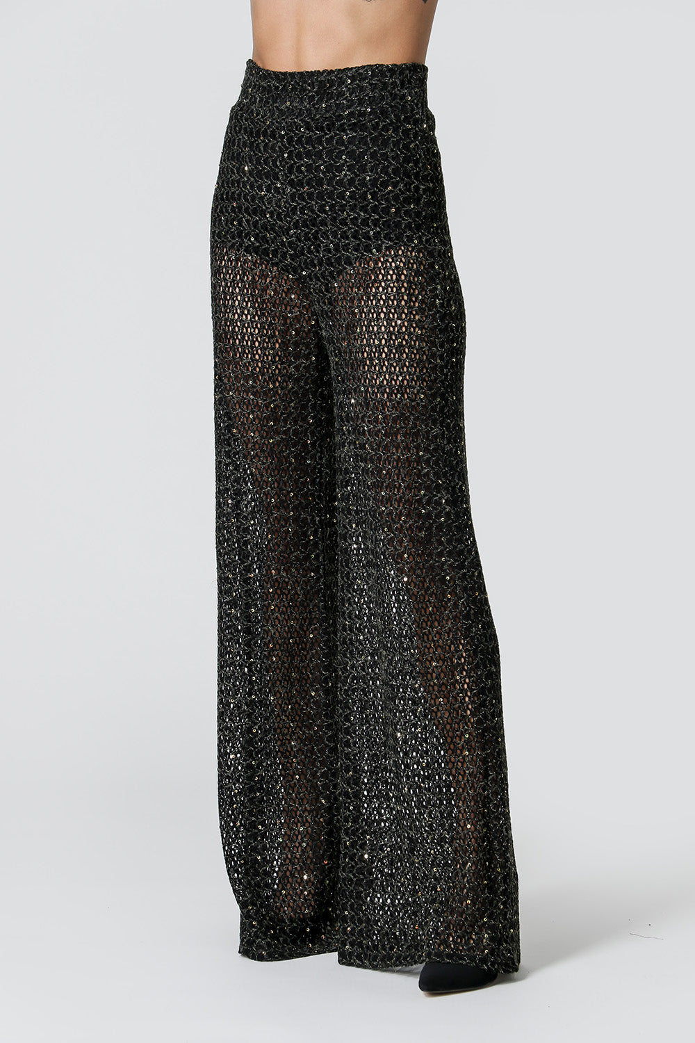 Calça pantalona com cós largo. Feita em malha crochê deixando a peça transparente. Possui hot pants. Uma peça coringa para looks casuais ou mesmo para um look night.