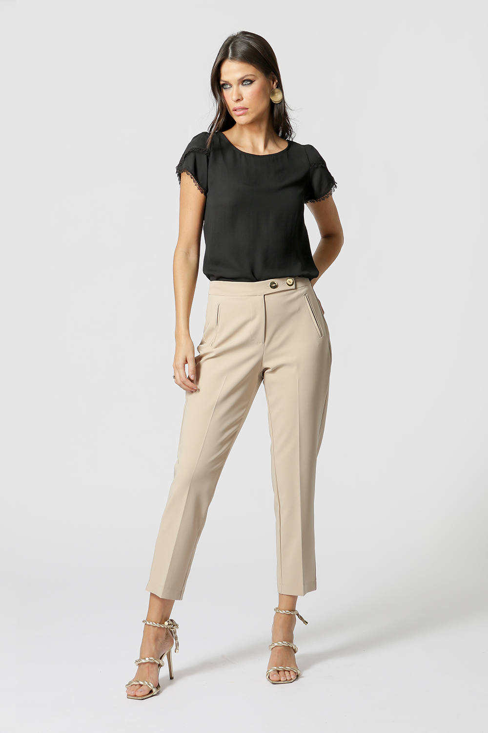 Calça reta com detalhe de bolso frontal. Confeccionada em tecido alfaiataria uma peça perfeita para compor looks work com elegância no seu dia-a-dia.