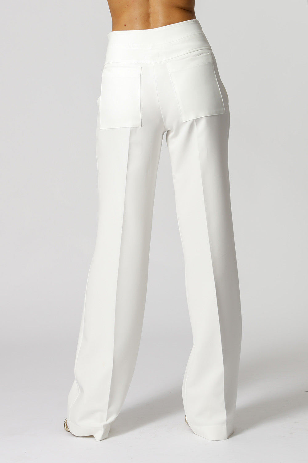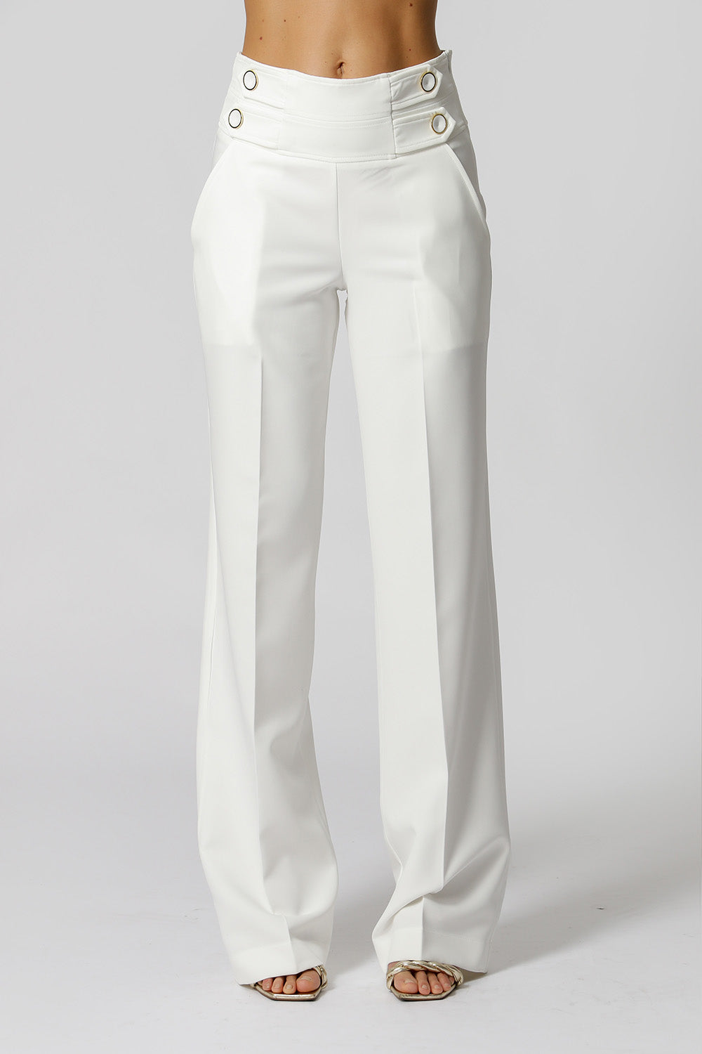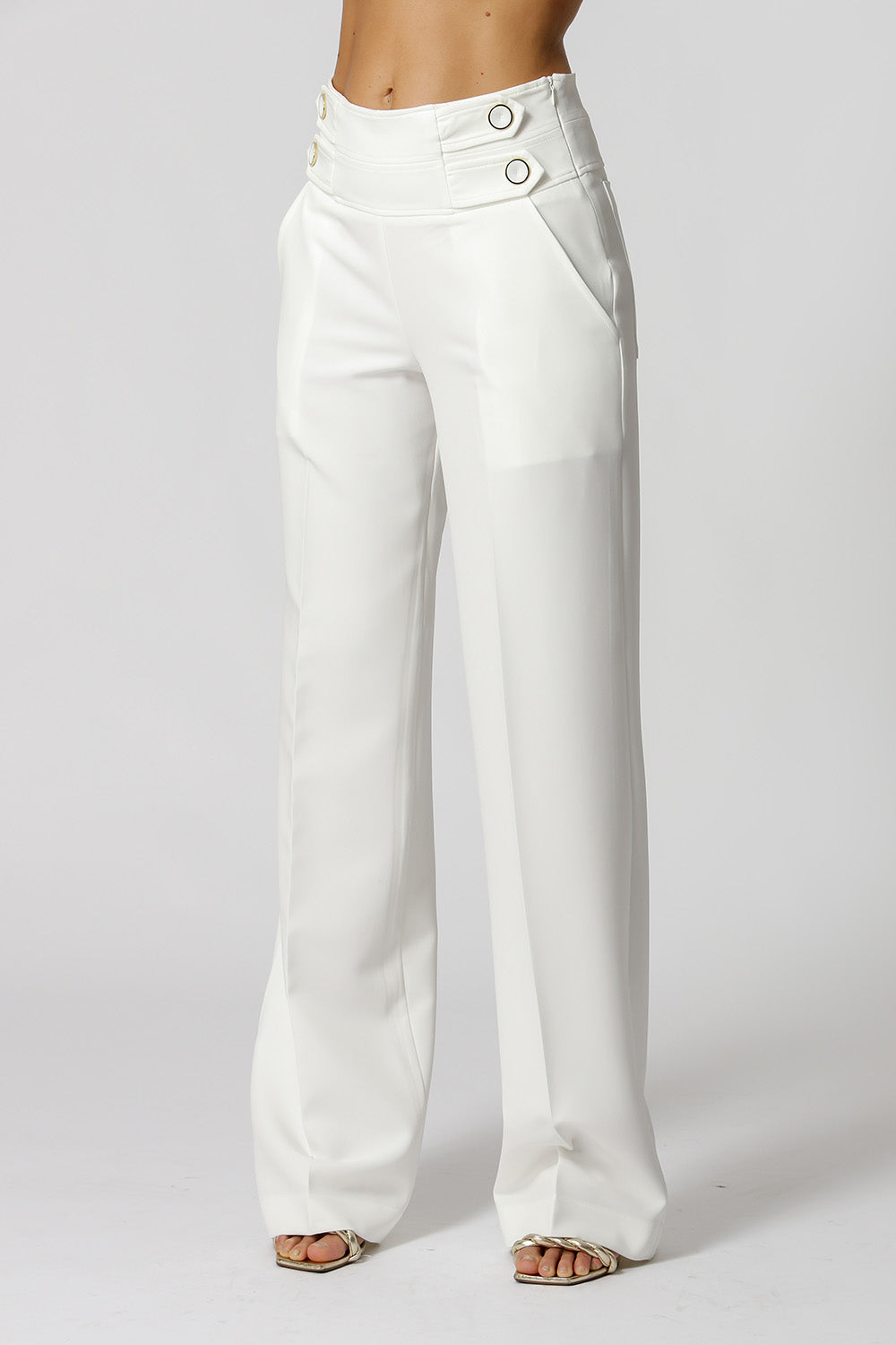 Calça reta com detalhe de lapela no cós com botões forrado do próprio tecido. Um modelo confeccionado em tecido alfaiataria. Peça perfeita para compor vários looks Work com elegância e arrasar.