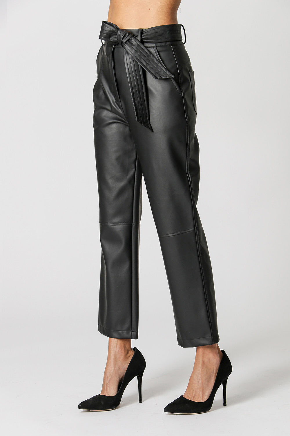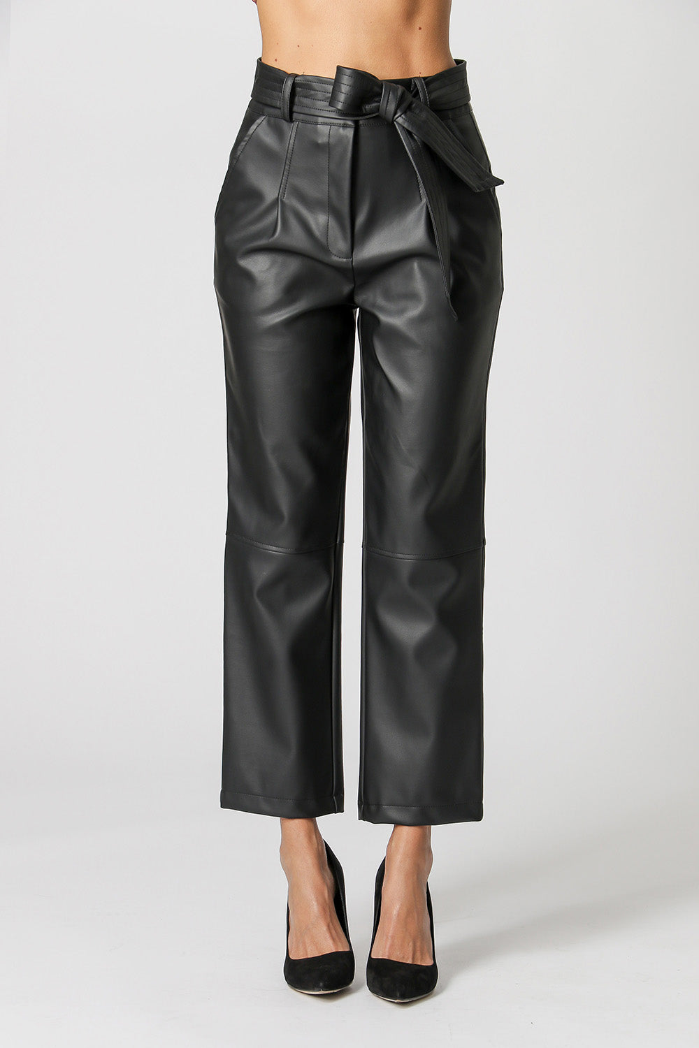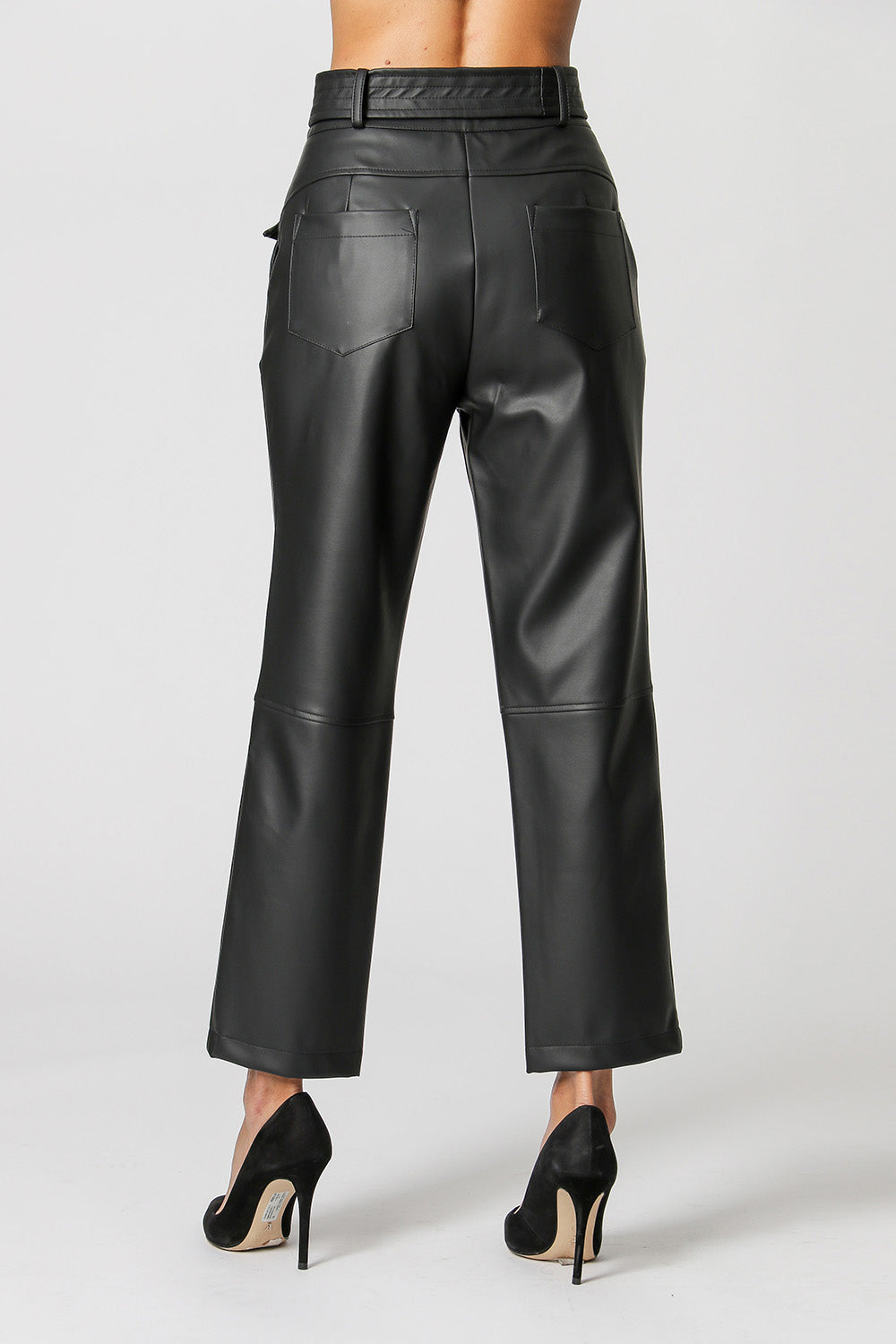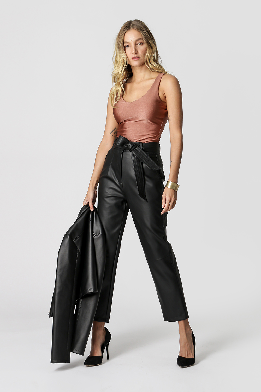 Calça feita em couro sintético, possui shape reto e recortes diferentes que valorizam o corpo. Acompanha faixa. Uma peça chave, ideal para looks atemporais.