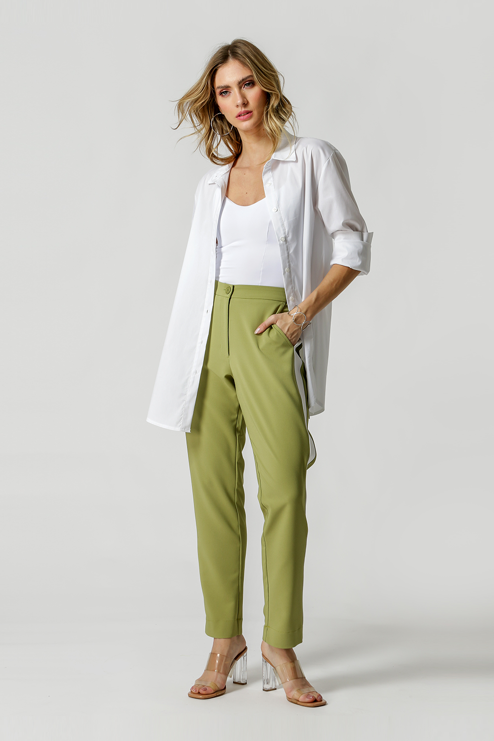 Calça com shape reto, bolso faca, bolso traseiro e recortes laterais. Peça confeccionada em alfaiataria creponada. Perfeita para um look mais formal.