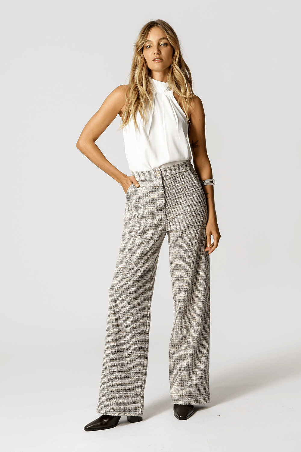 Calça reta com bolso lateral e botão forrado do próprio tecido. Modelo confeccionado em tecido Tweed Color. Um Modelo elegante e confortável que proporciona um looks casual muito moderno.