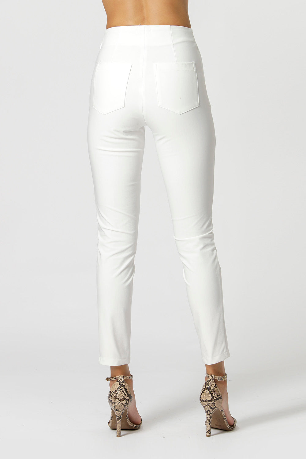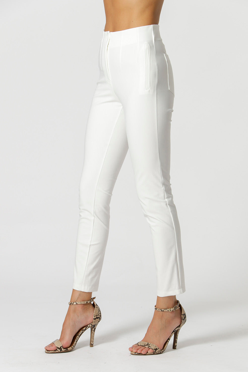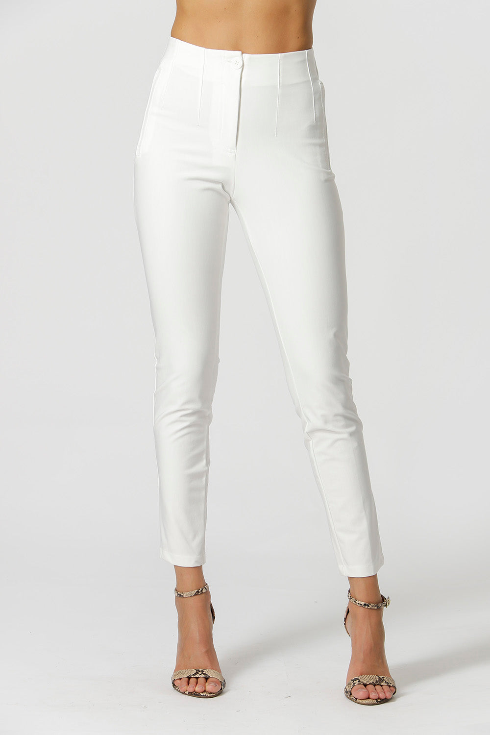 Calça de modelagem skinny com pences pespontadas, bolsos frontais e traseiros. Uma peça que compõe looks de trabalhos e casuais.