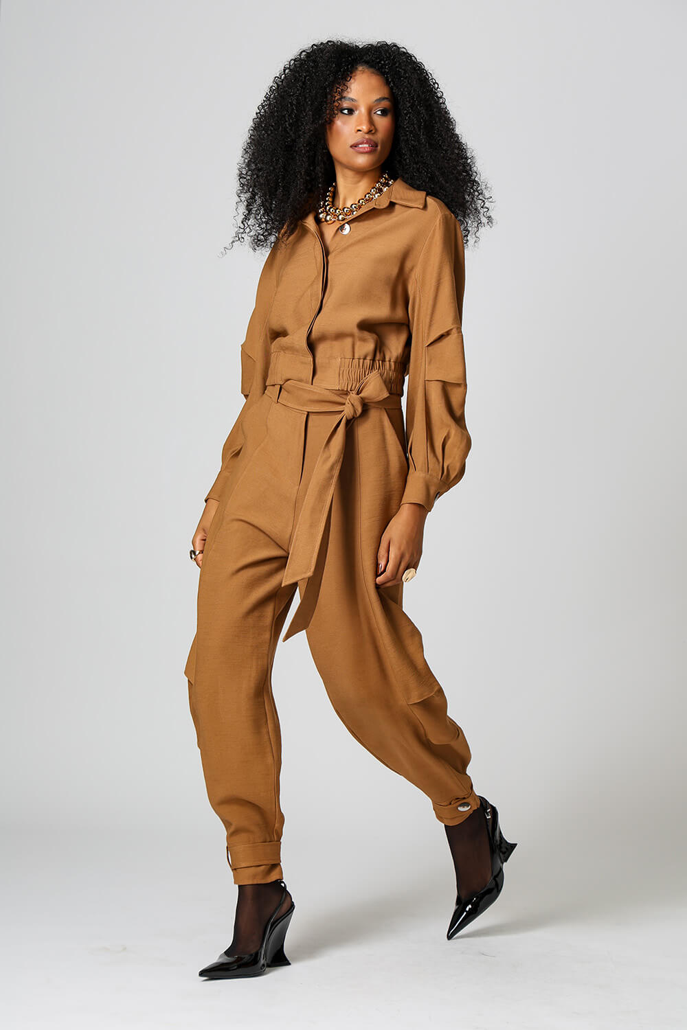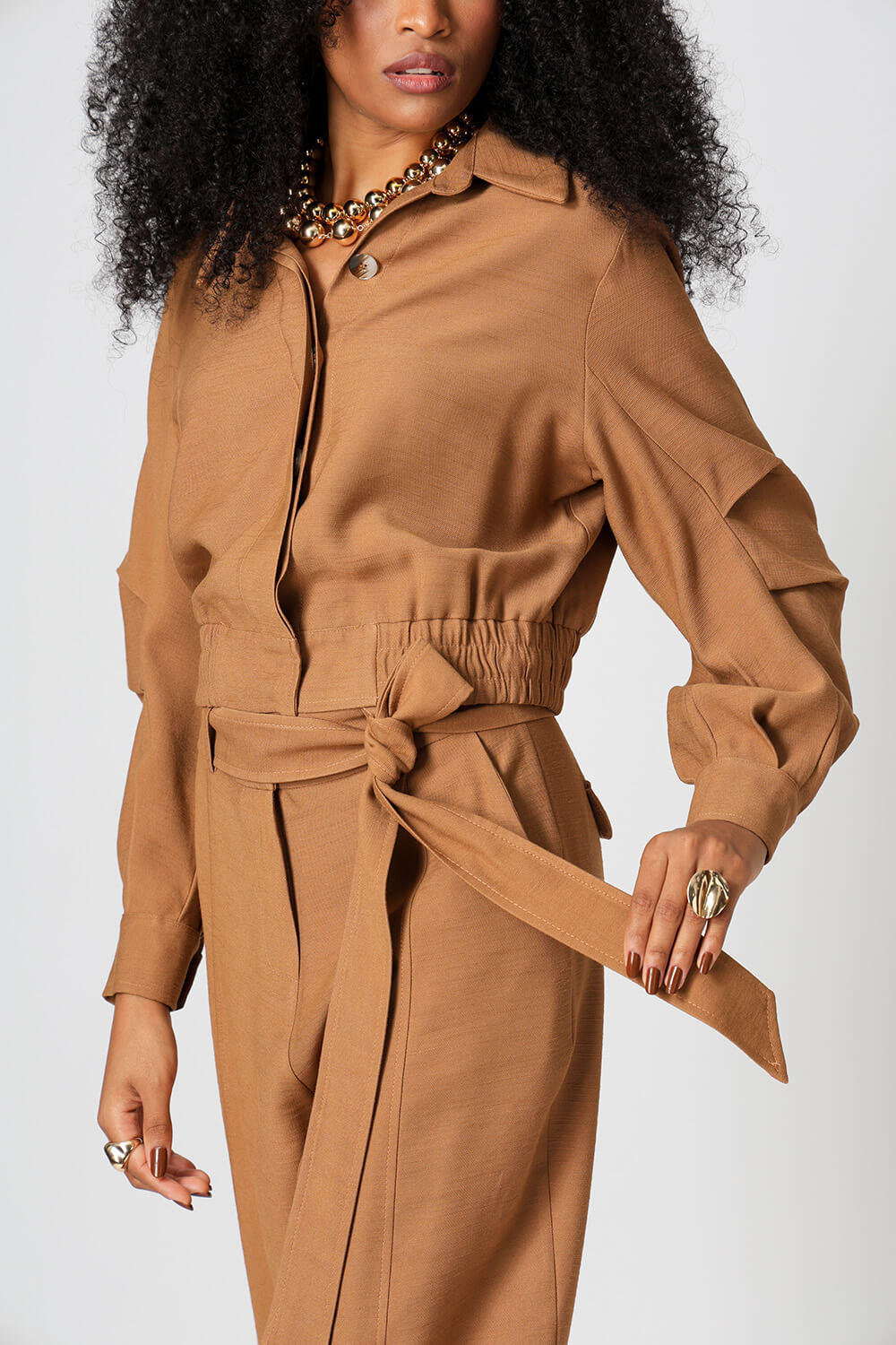 Detalhe de pregas na lateral frontal, faixa para amarração e lapela decorativa nas costas