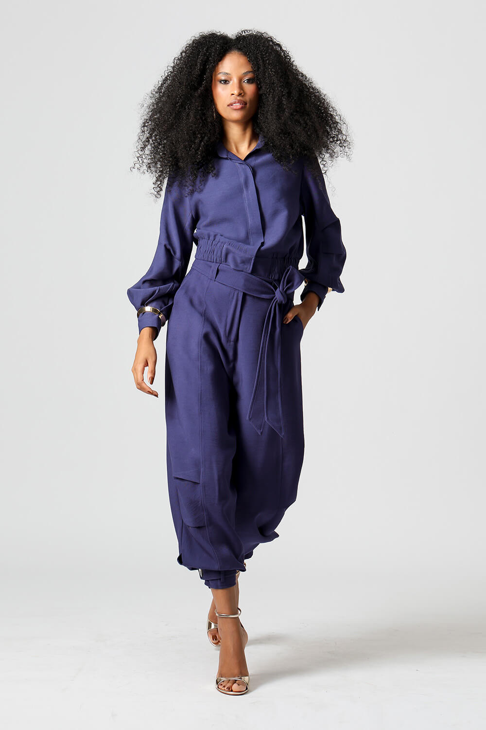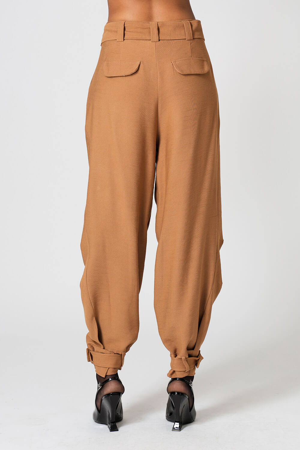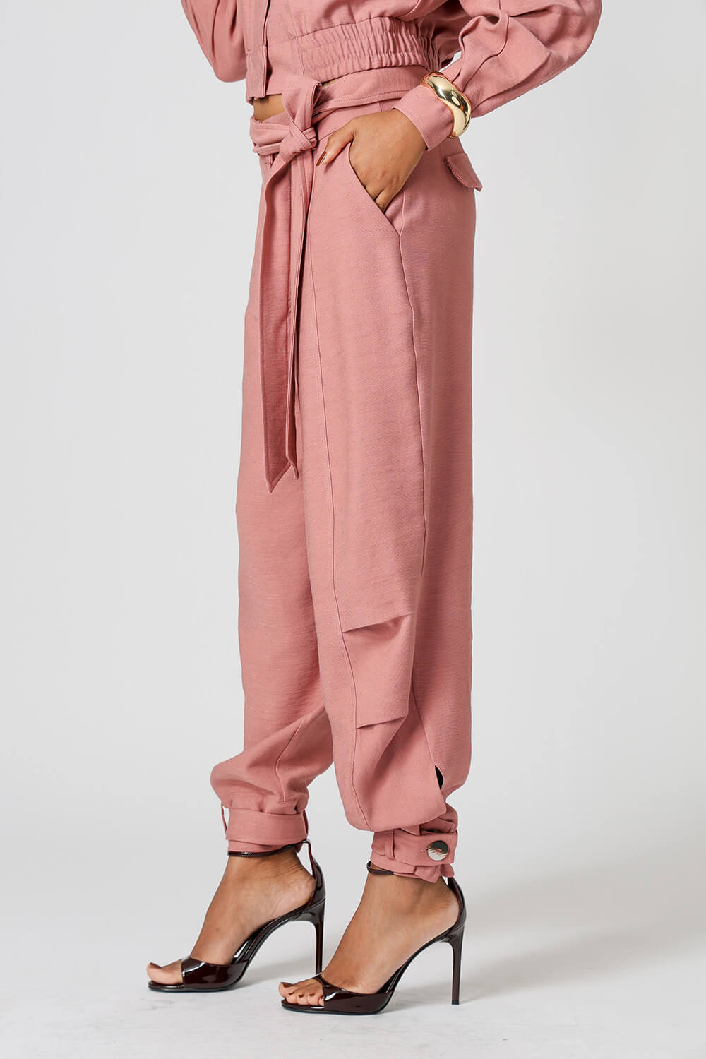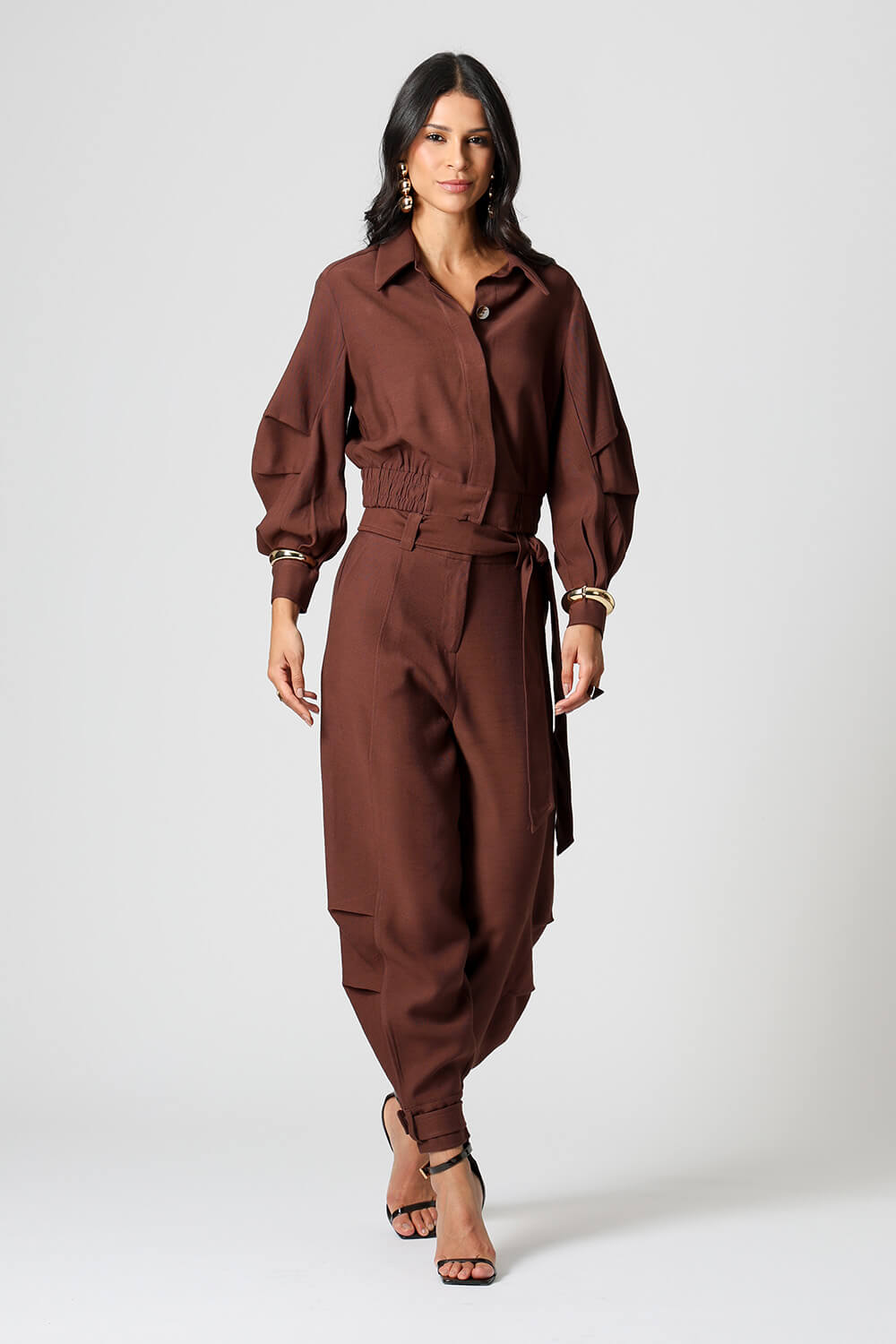 Calça em viscose heavy com modelagem elegante e detalhes que valorizam a peça. Possui pregas na lateral frontal da perna, martingale na barra para ajuste, faixa para amarração na cintura e lapela decorativa não funcional nas costas. Ideal para composições sofisticadas e modernas.