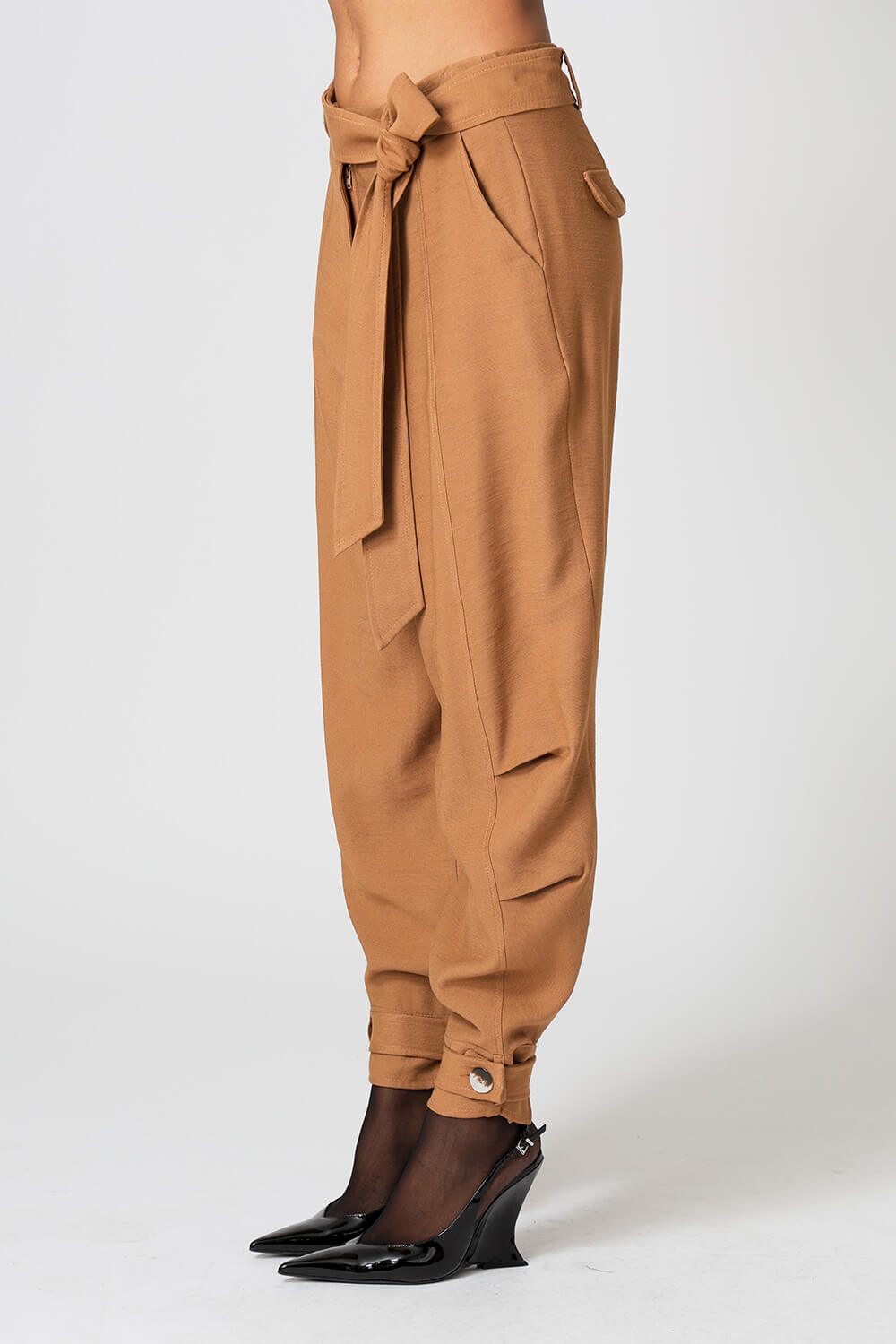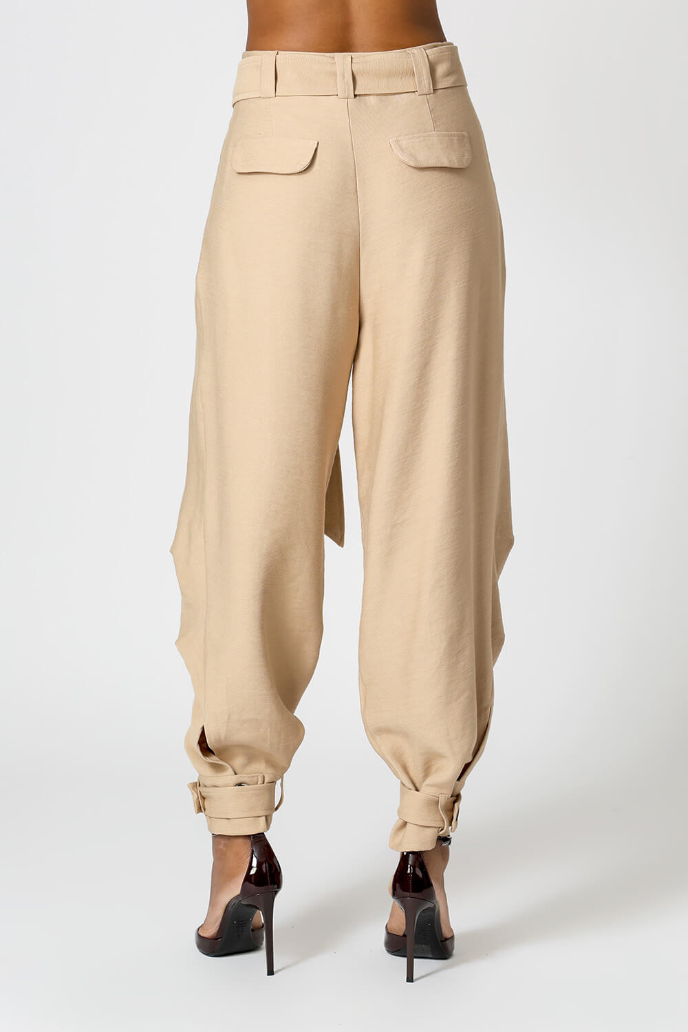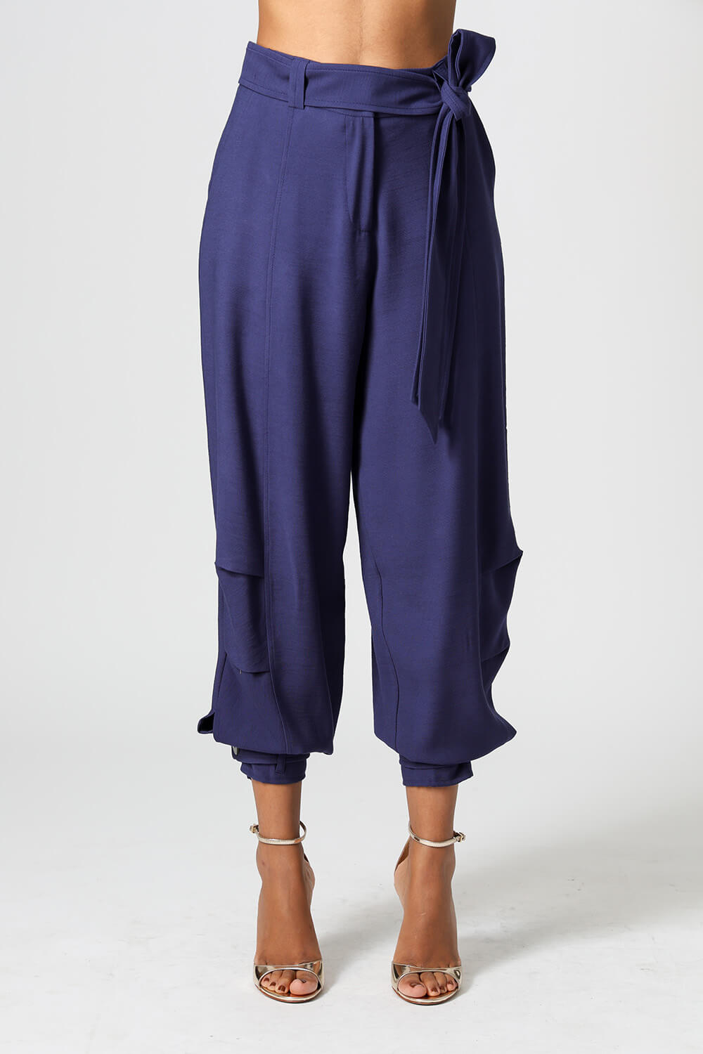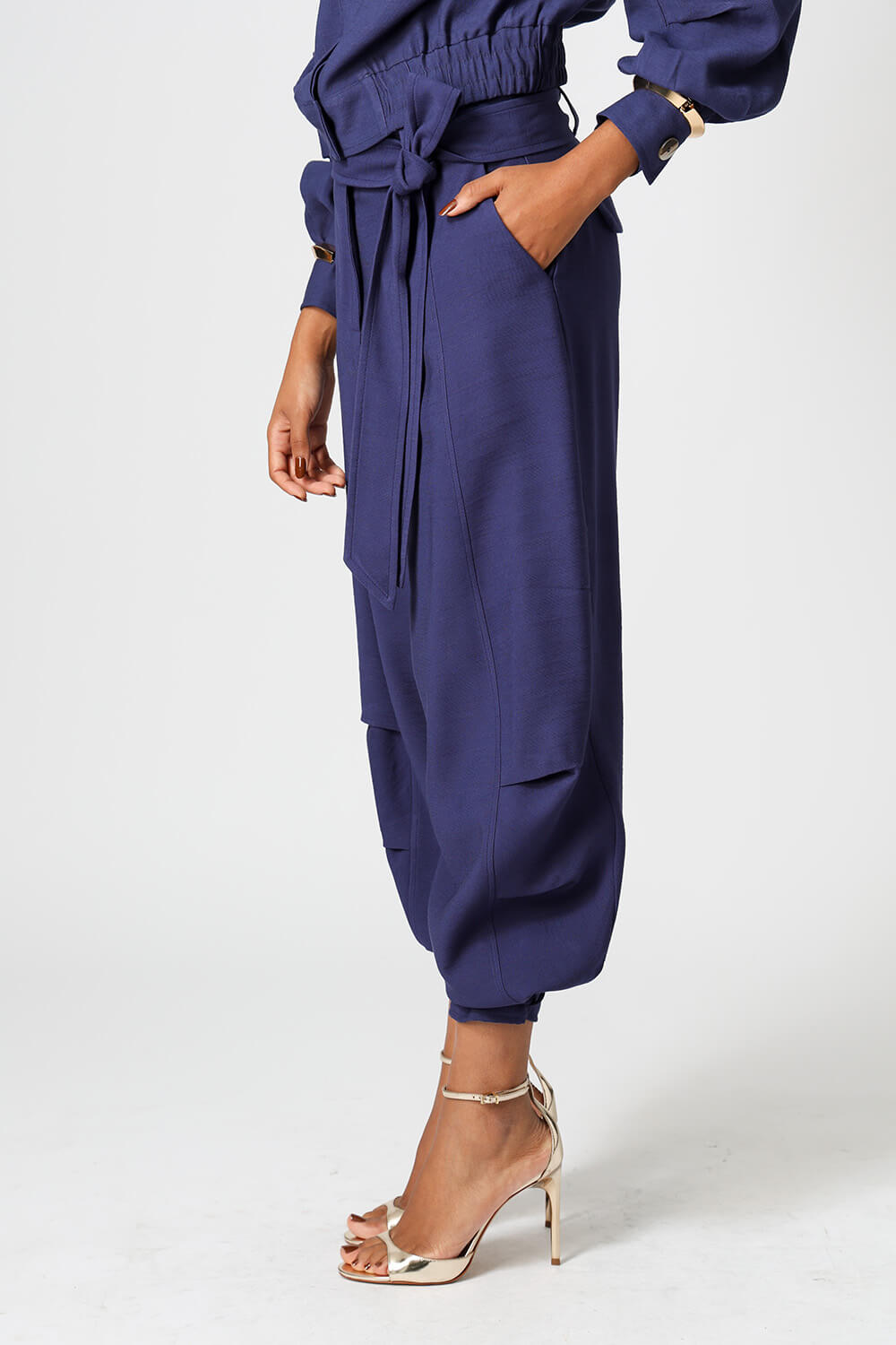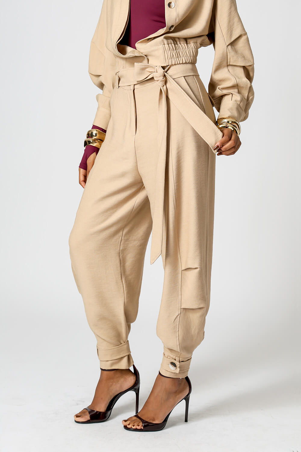 Calça em viscose heavy com modelagem elegante e detalhes que valorizam a peça. Possui pregas na lateral frontal da perna, martingale na barra para ajuste, faixa para amarração na cintura e lapela decorativa não funcional nas costas. Ideal para composições sofisticadas e modernas.