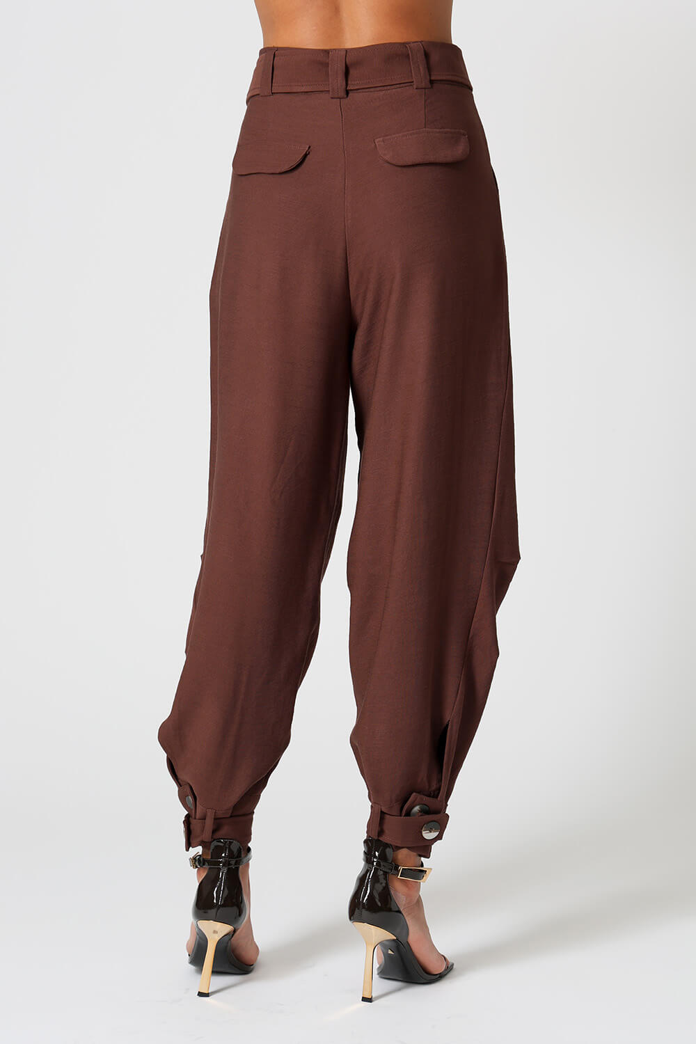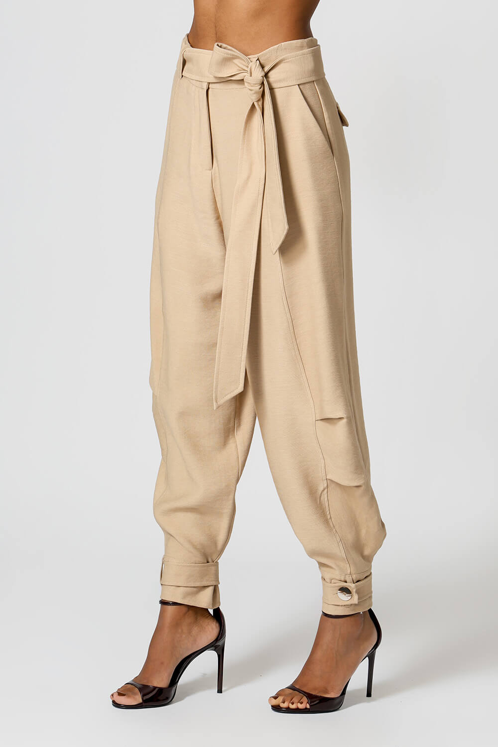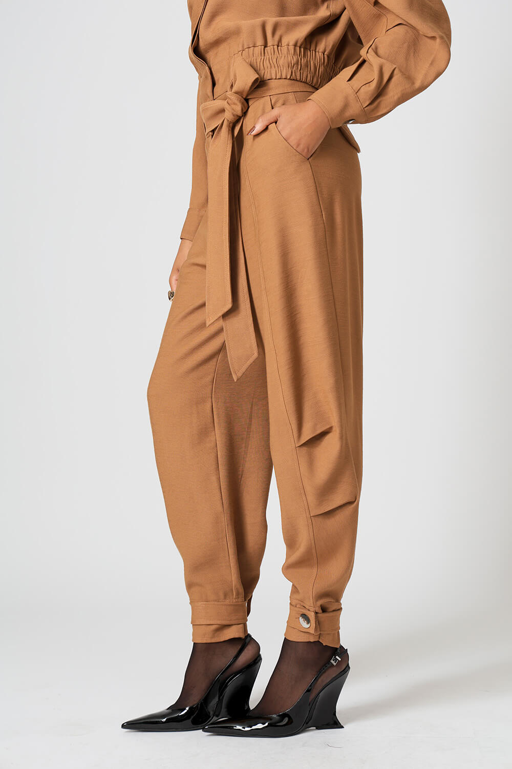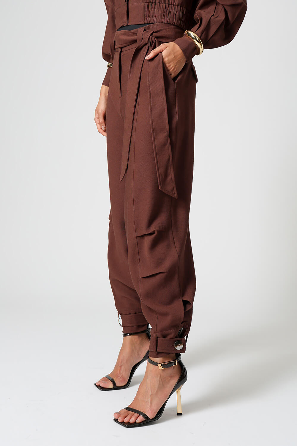 Calça em viscose heavy com modelagem elegante e detalhes que valorizam a peça. Possui pregas na lateral frontal da perna, martingale na barra para ajuste, faixa para amarração na cintura e lapela decorativa não funcional nas costas. Ideal para composições sofisticadas e modernas.