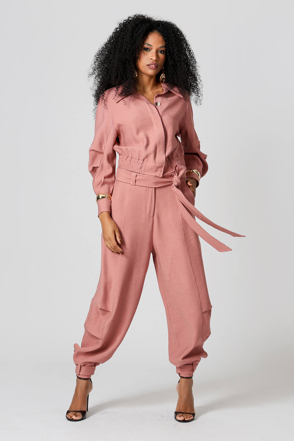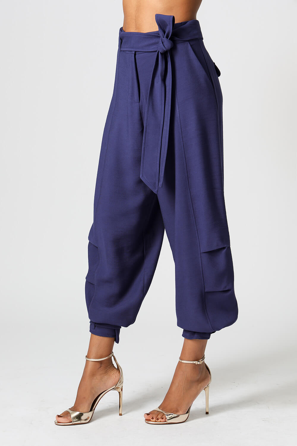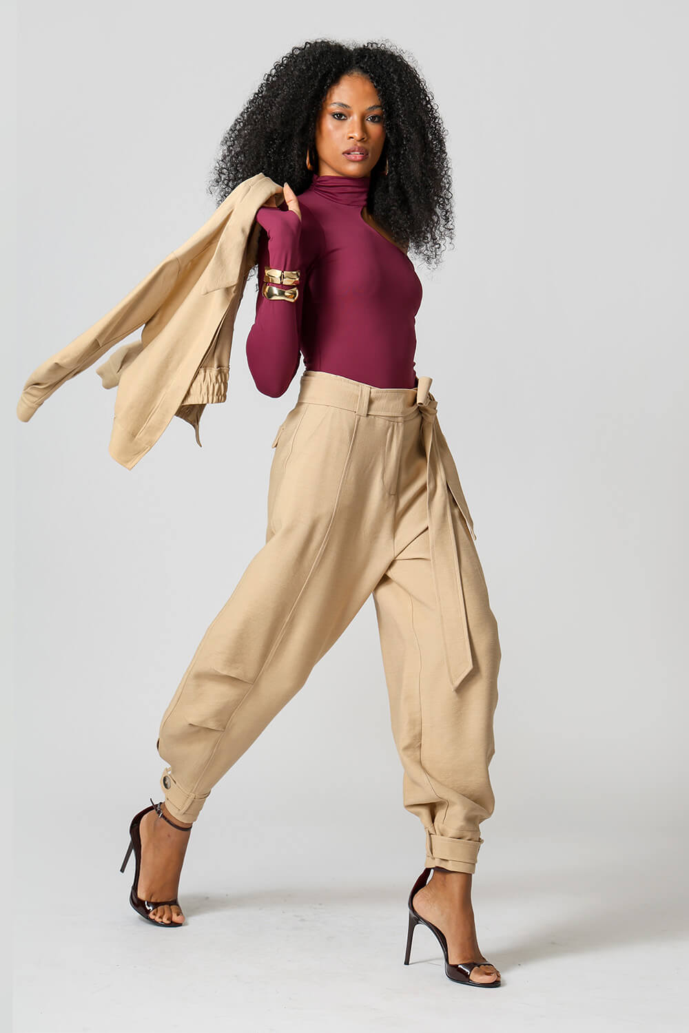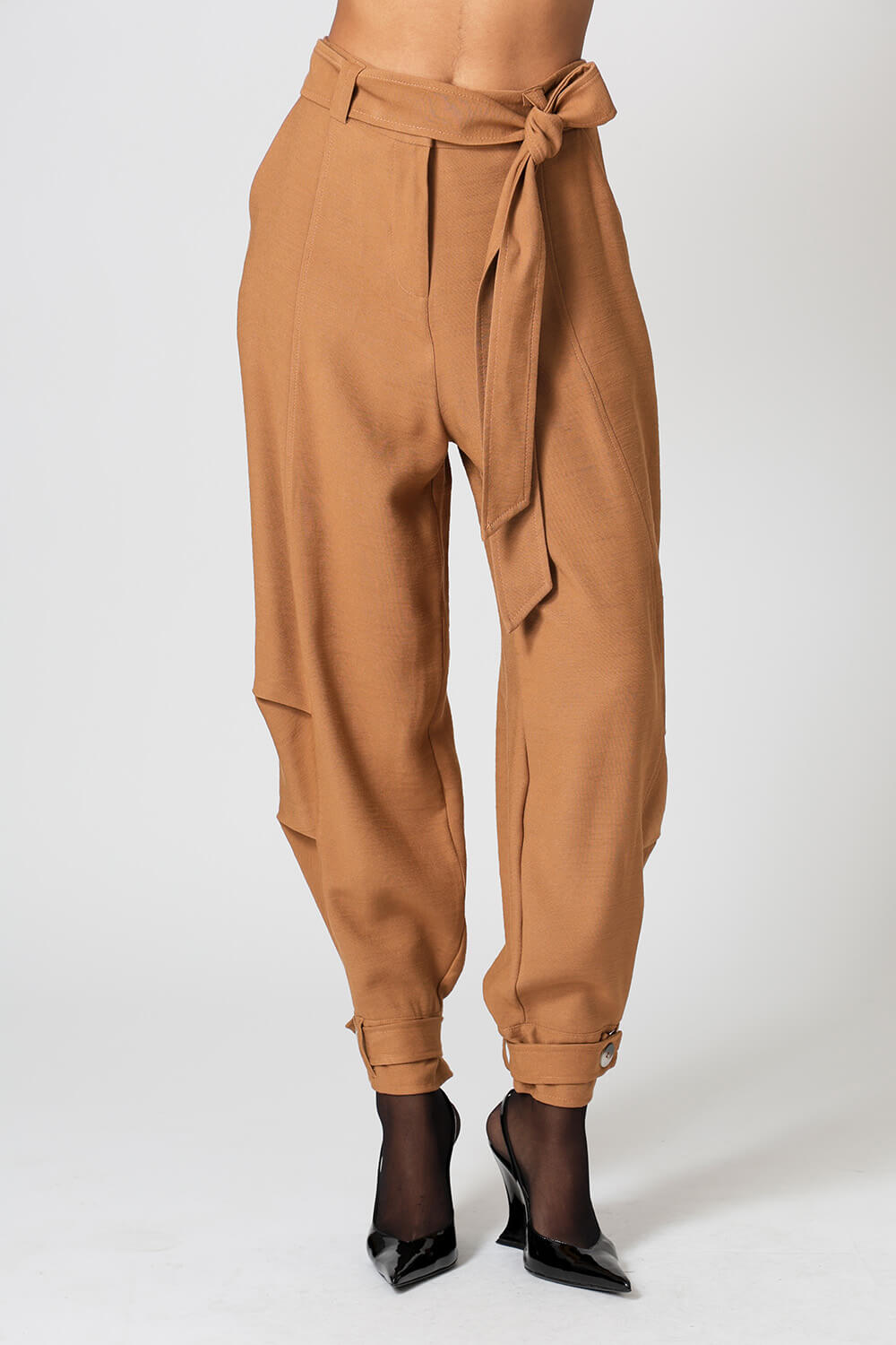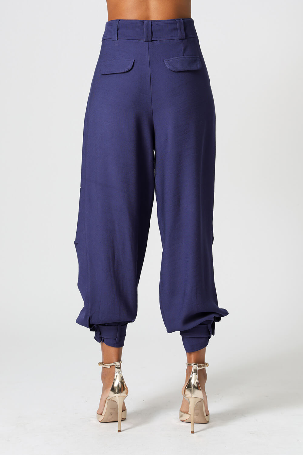 Calça em viscose heavy com modelagem elegante e detalhes que valorizam a peça. Possui pregas na lateral frontal da perna, martingale na barra para ajuste, faixa para amarração na cintura e lapela decorativa não funcional nas costas. Ideal para composições sofisticadas e modernas.