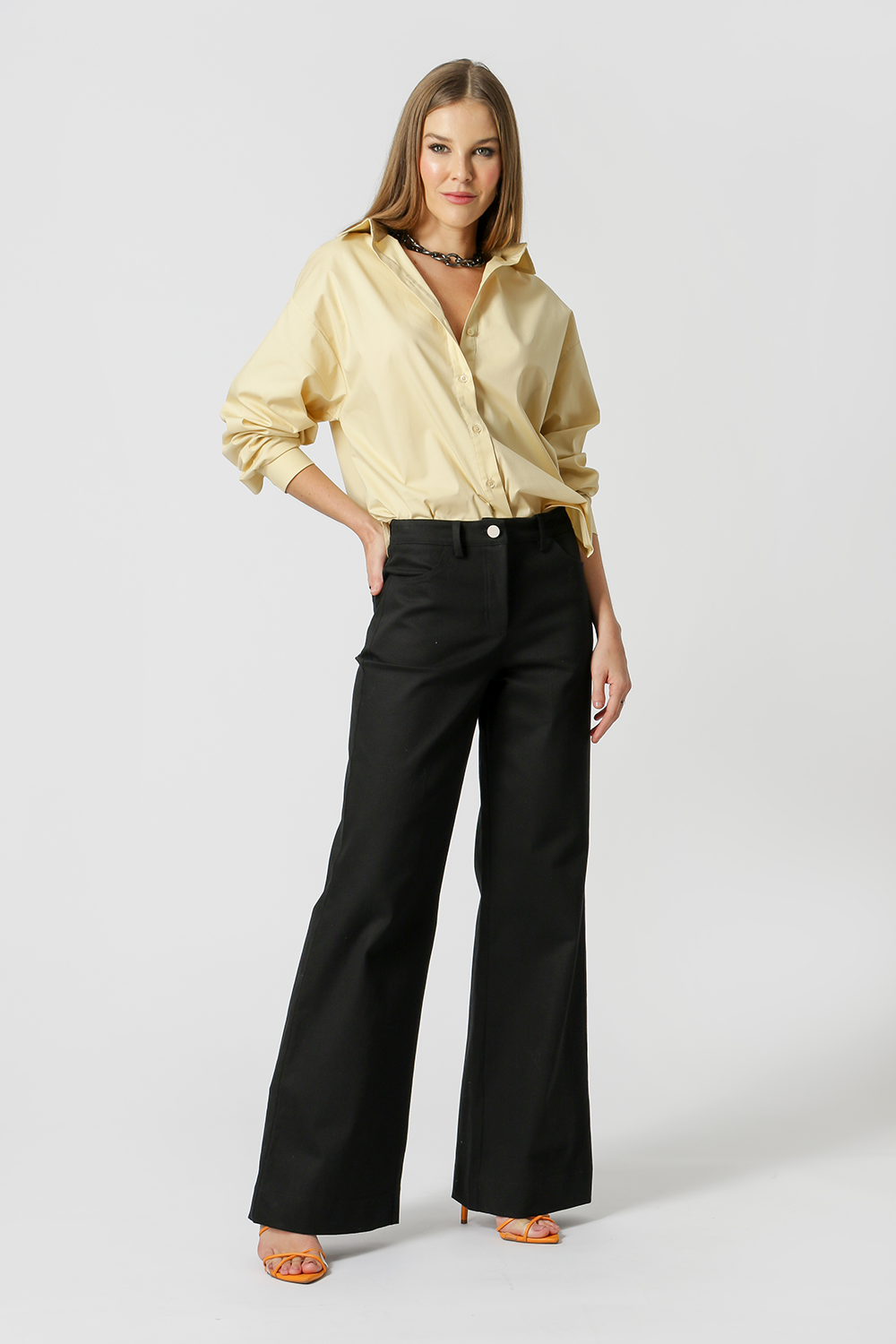 Calça com modelagem wide leg feita em sarja, detalhe de passantes, fechamento por zíper e botão metal. Queridinha das tendências, as Wide Leg tem aquele estilo despojado que a gente adora!