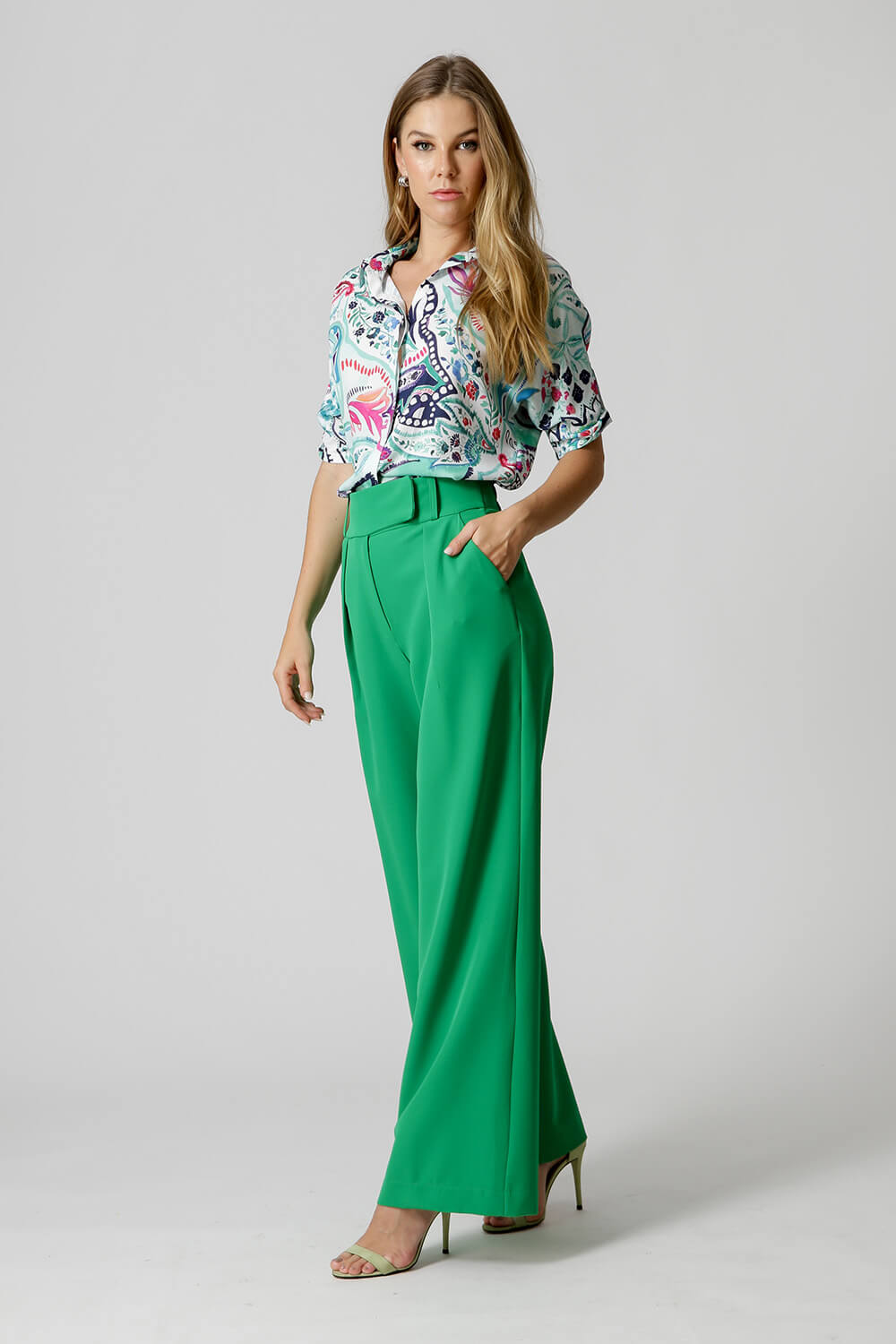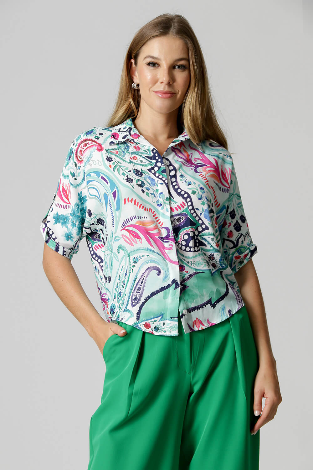 Camisa de modelagem ampla, estampada, com detalhe na manga. Possui recortes estilizados na parte das costas da peça e vista dupla em tecido creponado. É uma peça básica diferenciada, que a gente adora.