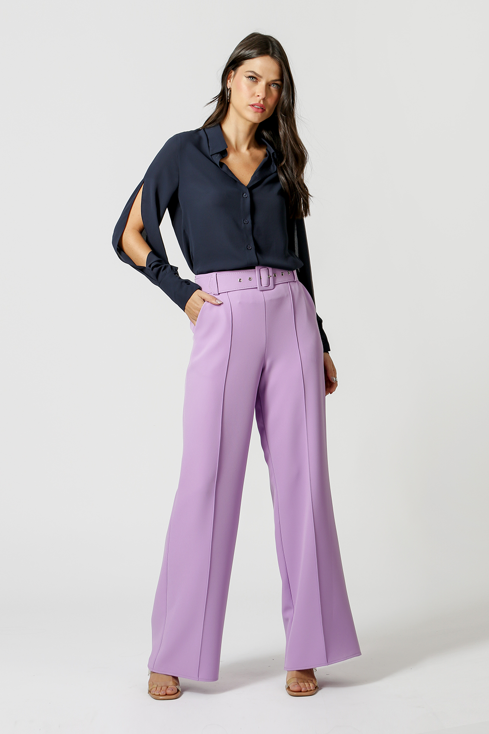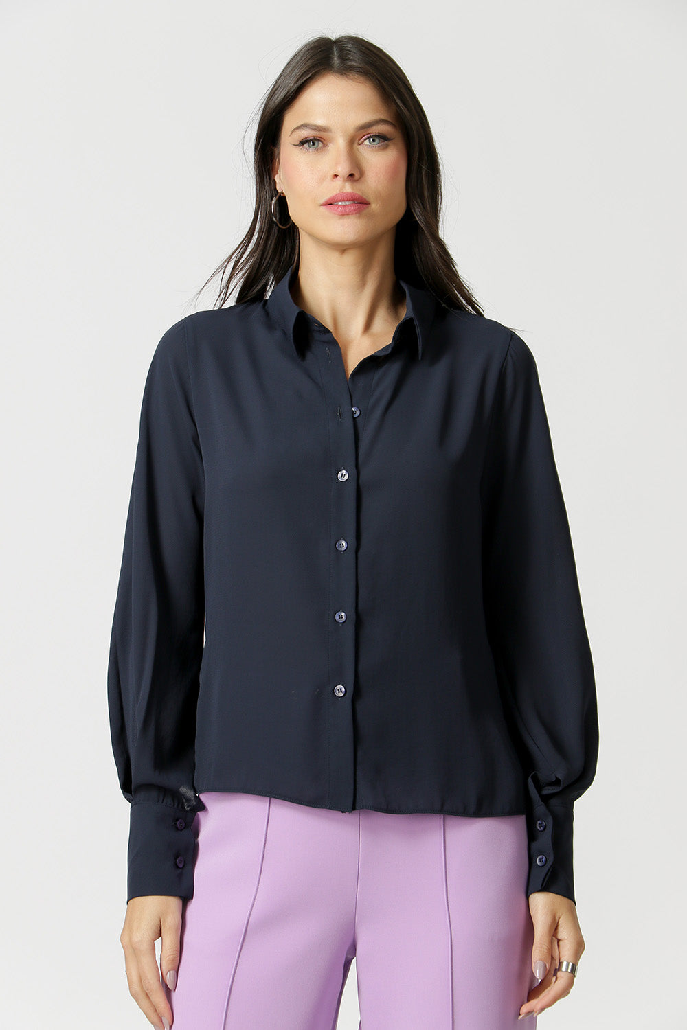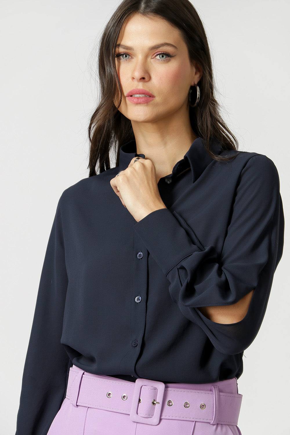Camisa feita em crepe fluido, com detalhes de abertura na manga. Peça coringa na composição de looks mais formais.