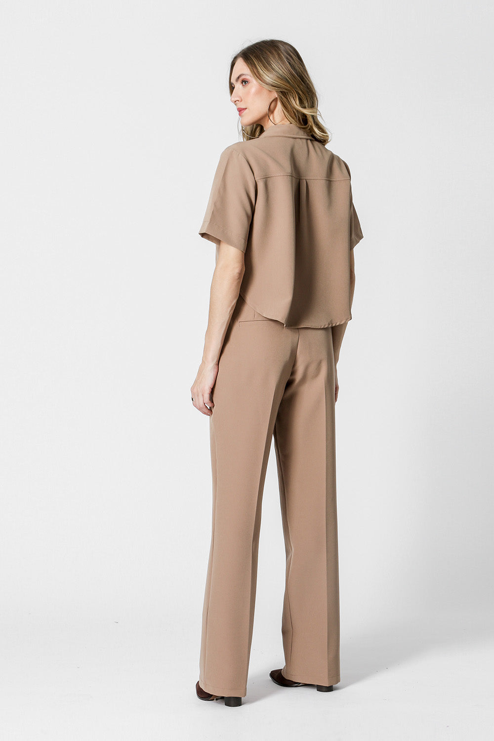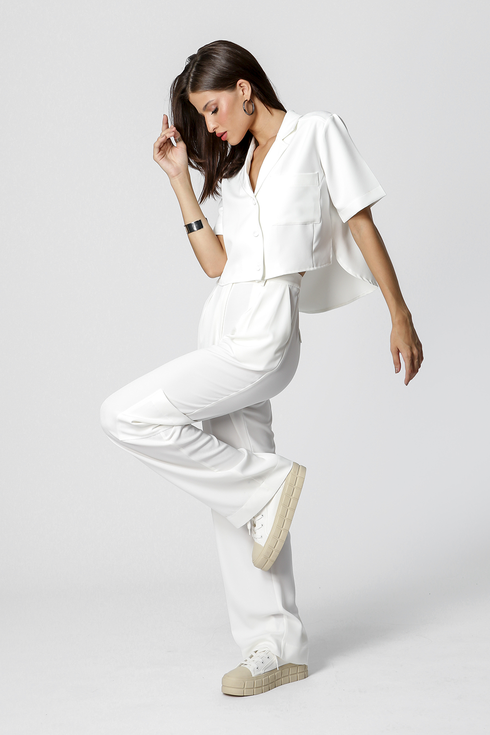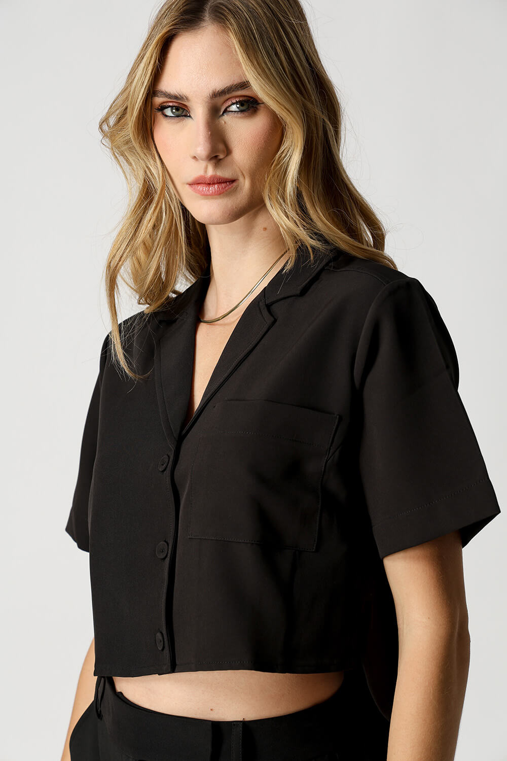 Camisa em alfaiataria com comprimento cropped, abertura frontal com botões forrados e bolso. Peça descontraída sem perder a elegância na composição do look work.