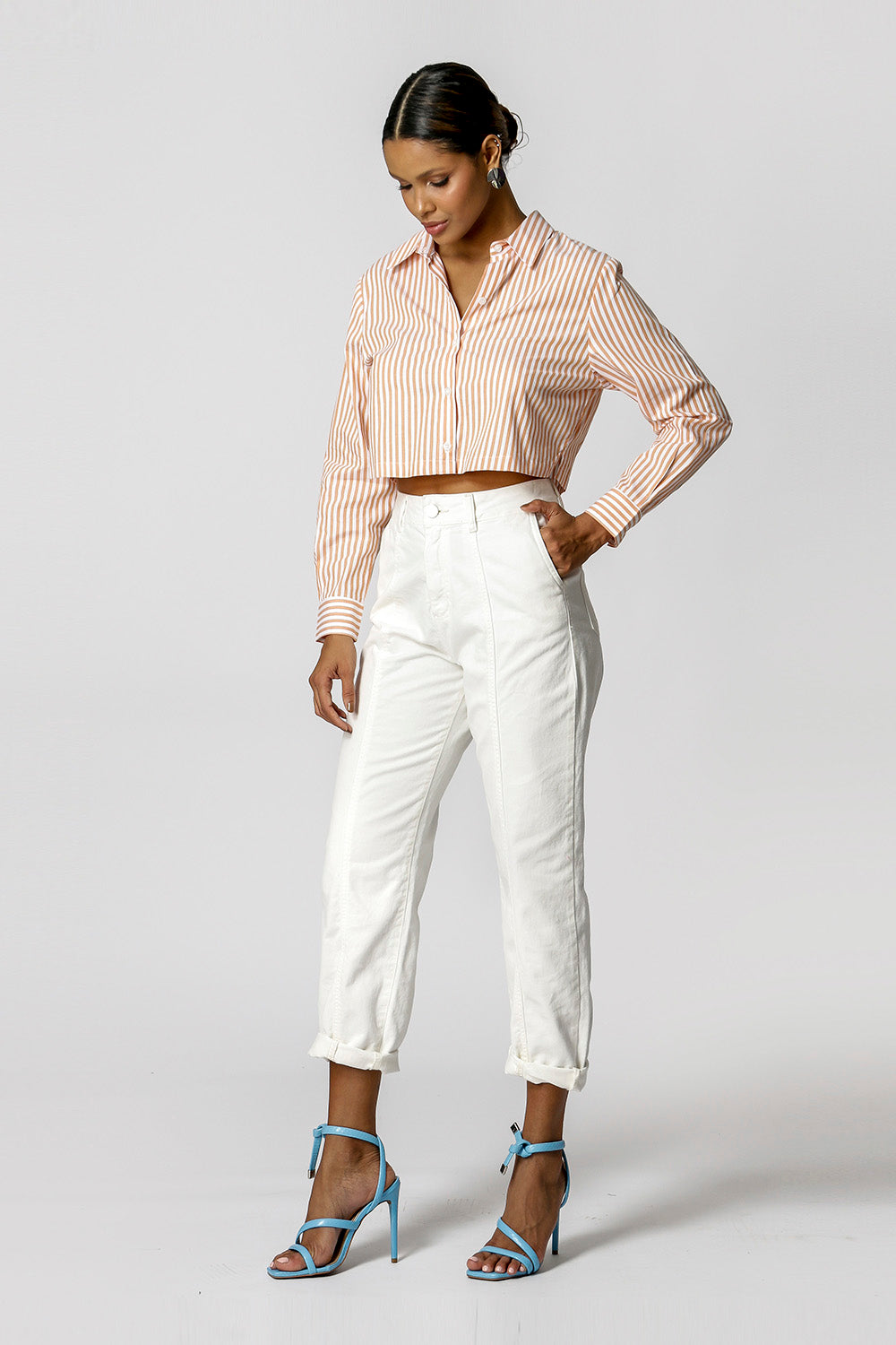 Camisa listrada no comprimento cropped feita em tricoline estampada. Um clássico atual que vai dar um UP na sua produção.