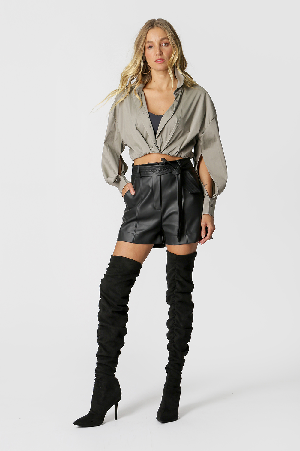 Camisa cropped com shape diferenciado, manga longa com abertura e elástico na barra. Peça feita em tricoline de algodão. Peça moderna e fashionista, uma otima opção para produções casuais.