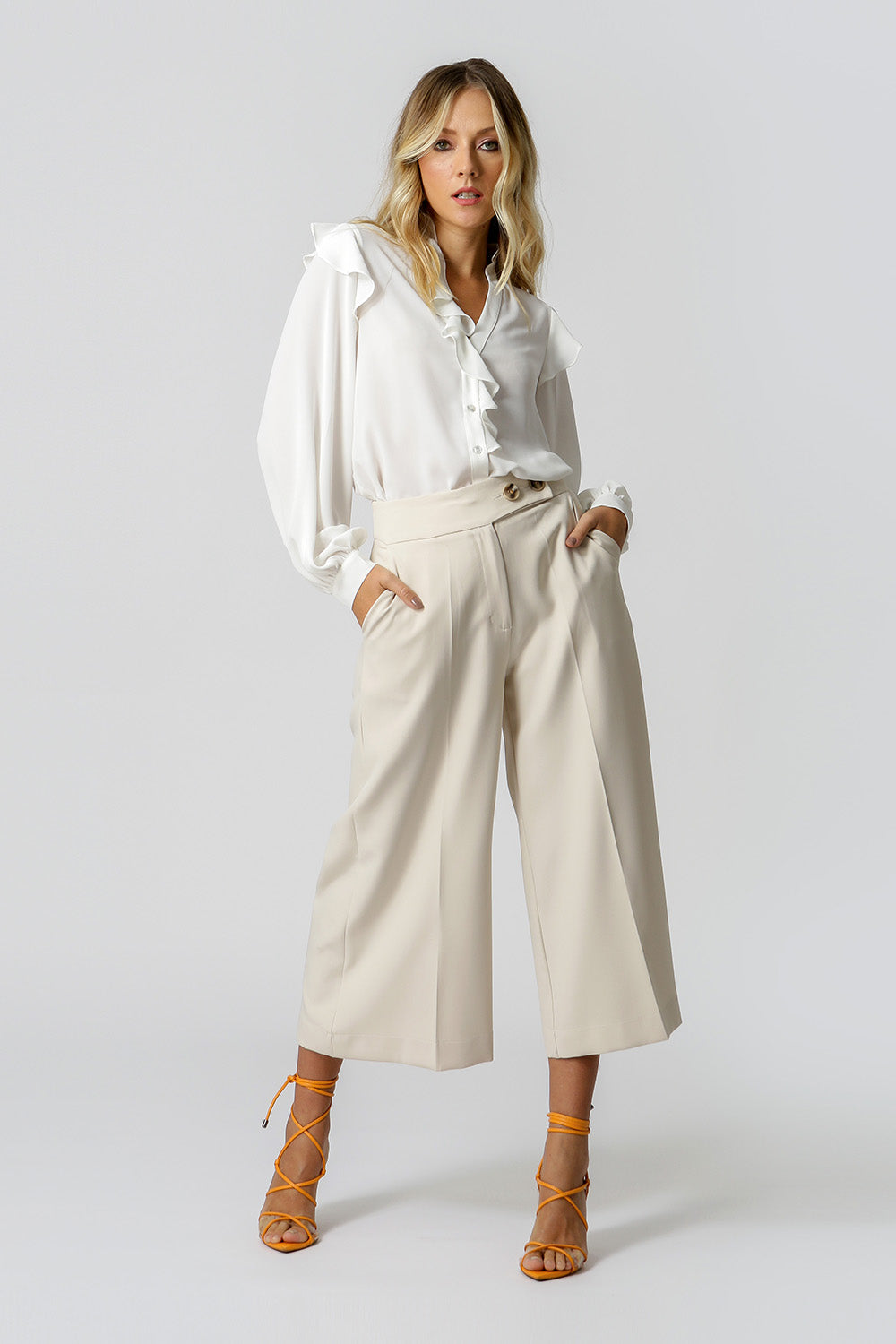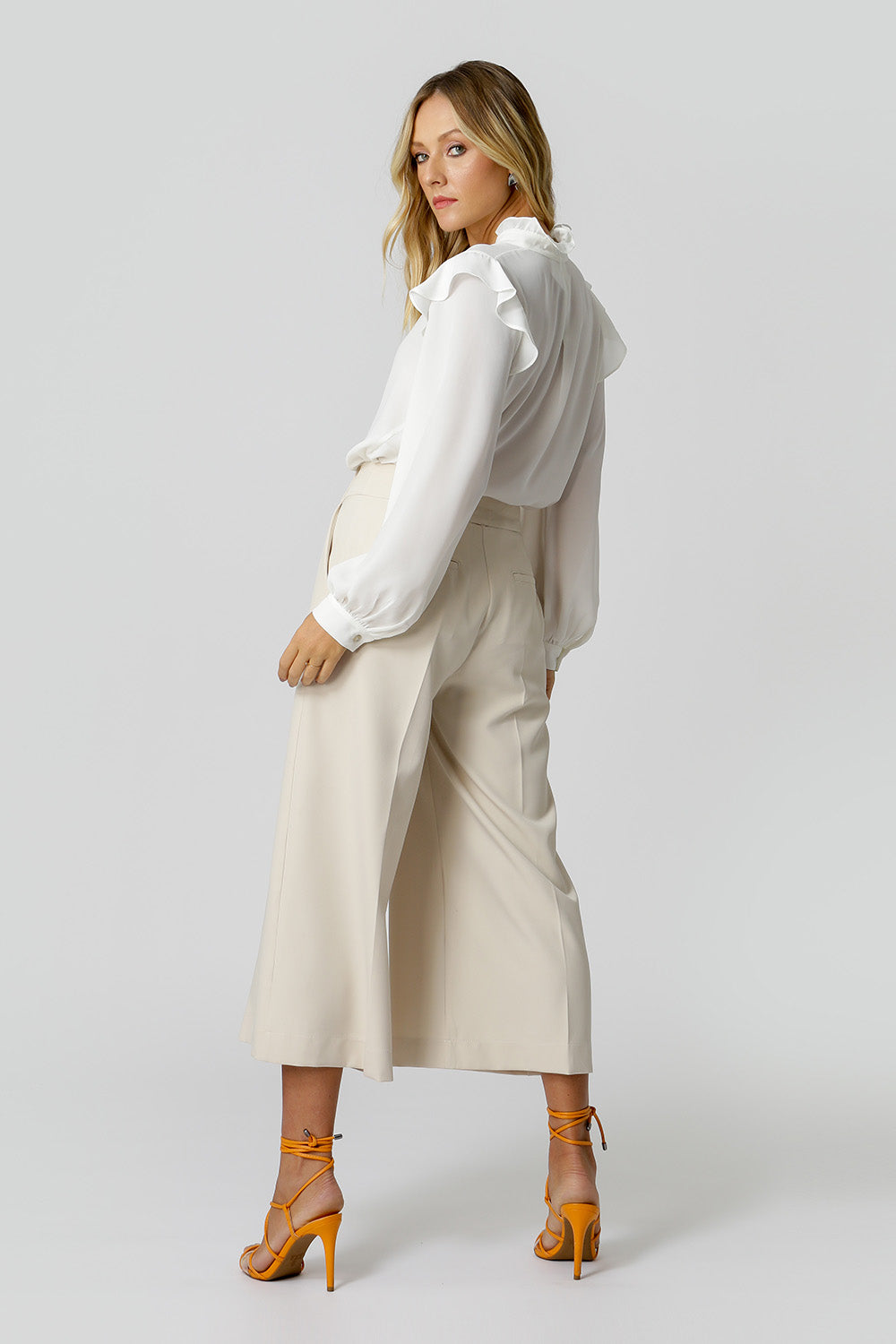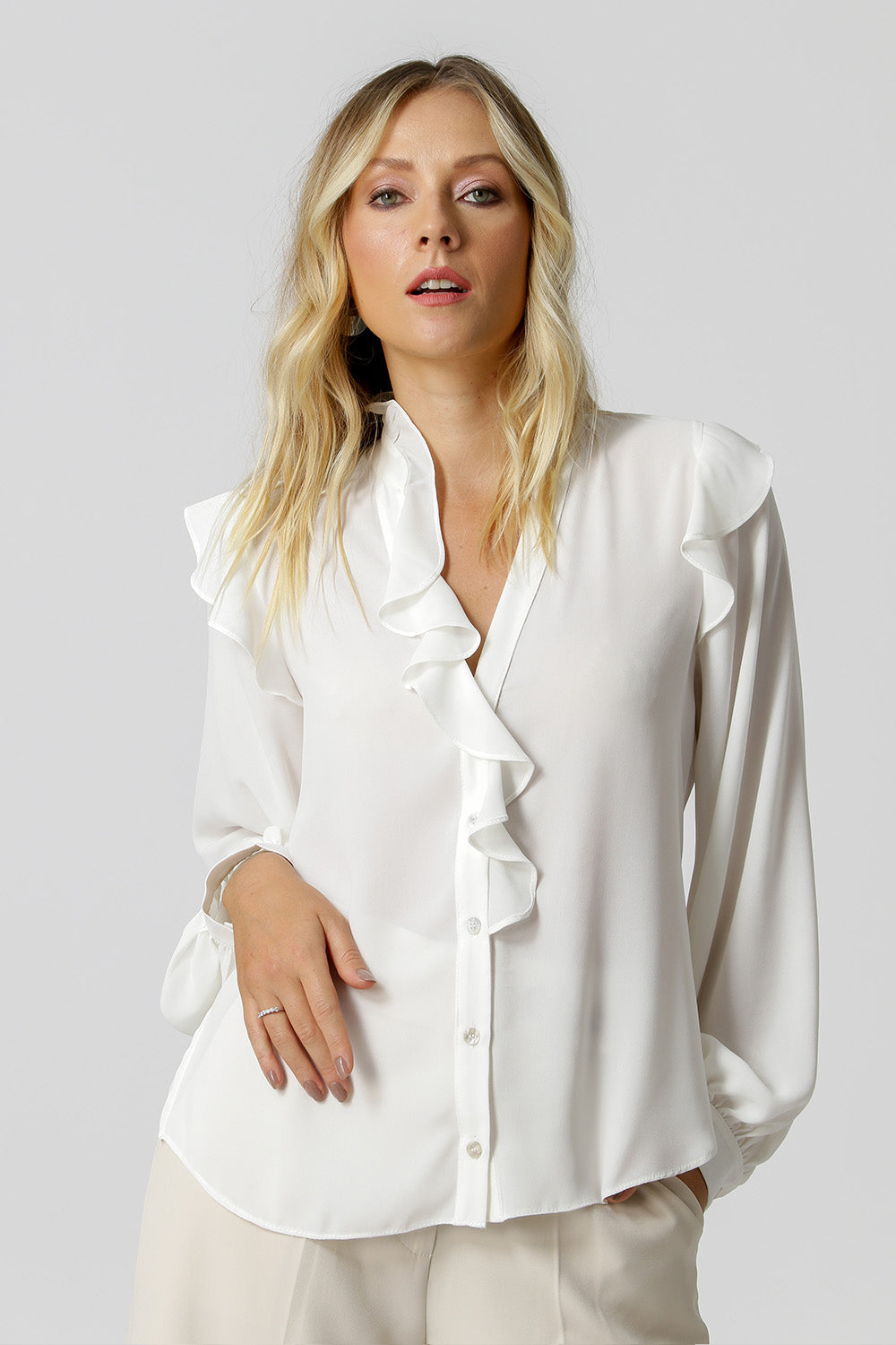 Camisa com shape fluído e detalhe de babado nas mangas, gola e busto. Ideal para deixar seu look mais sofisticado.