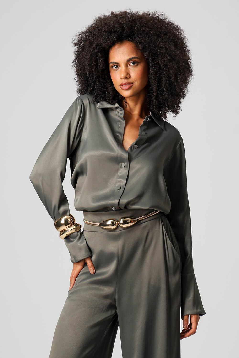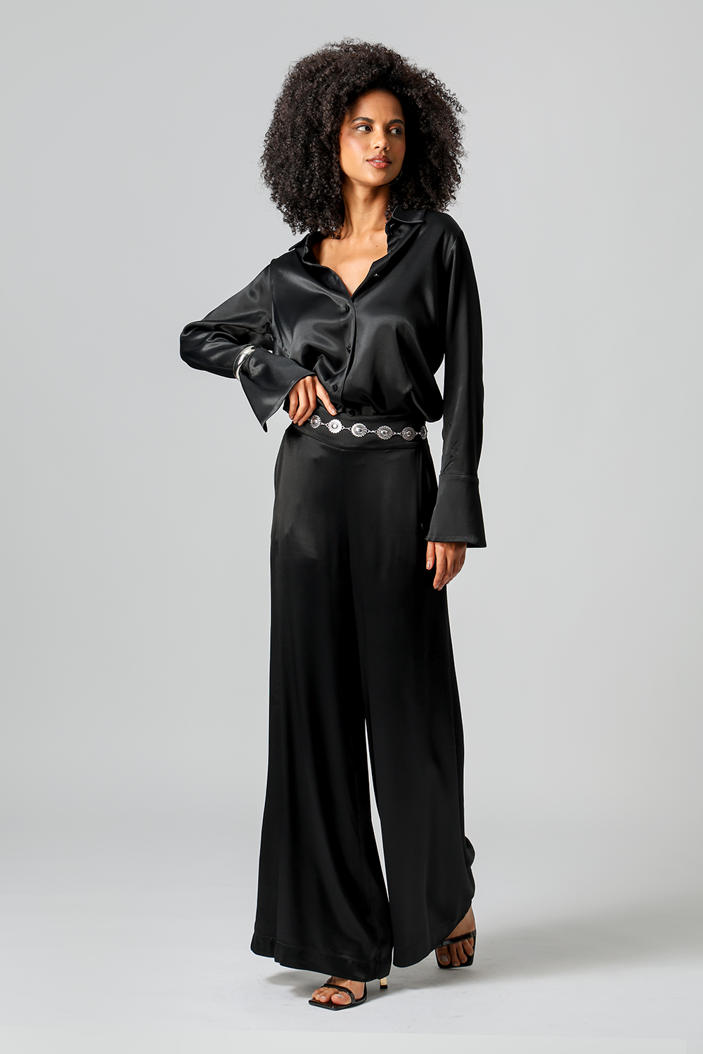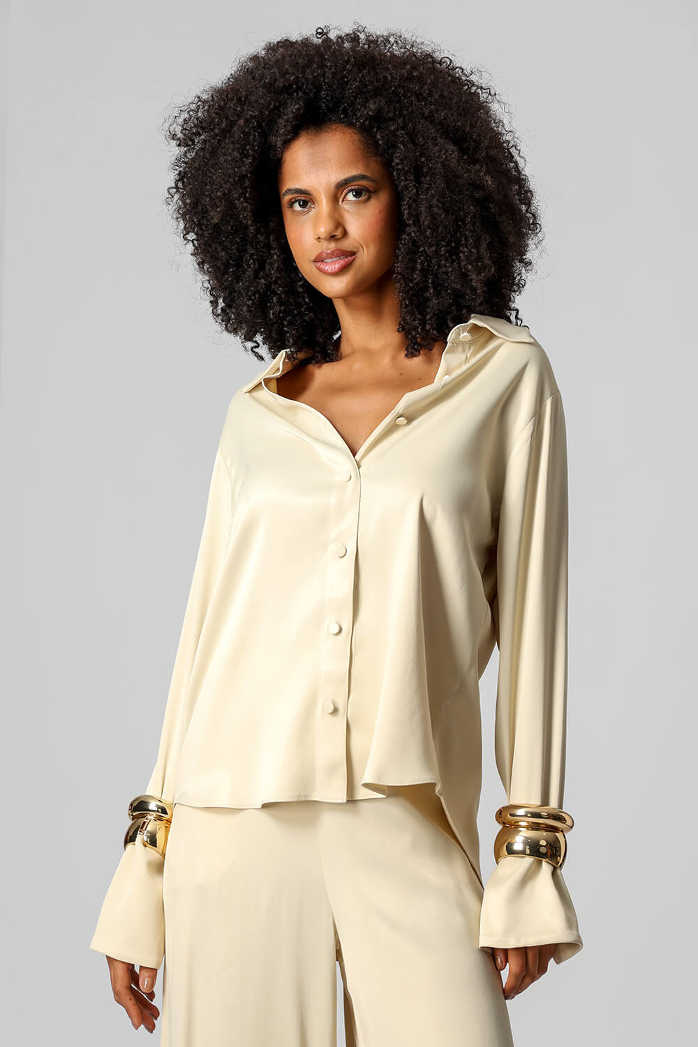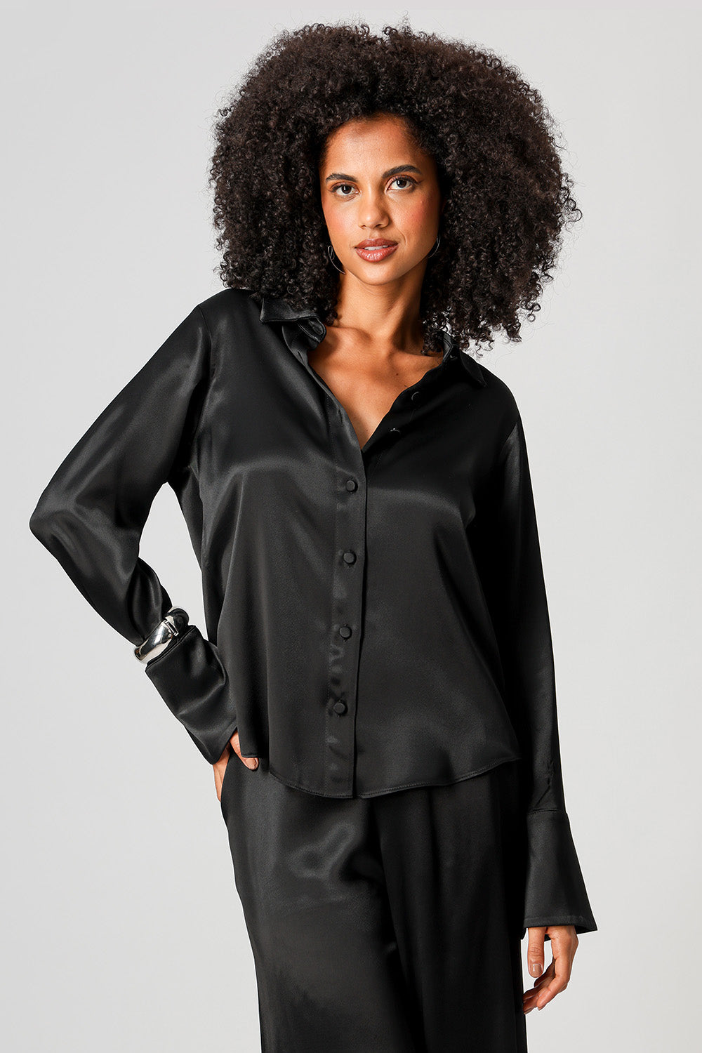 Elegante e sofisticada, a camisa em cetim premium possui punhos largos com fechamento por botão e design clássico que valoriza qualquer produção
