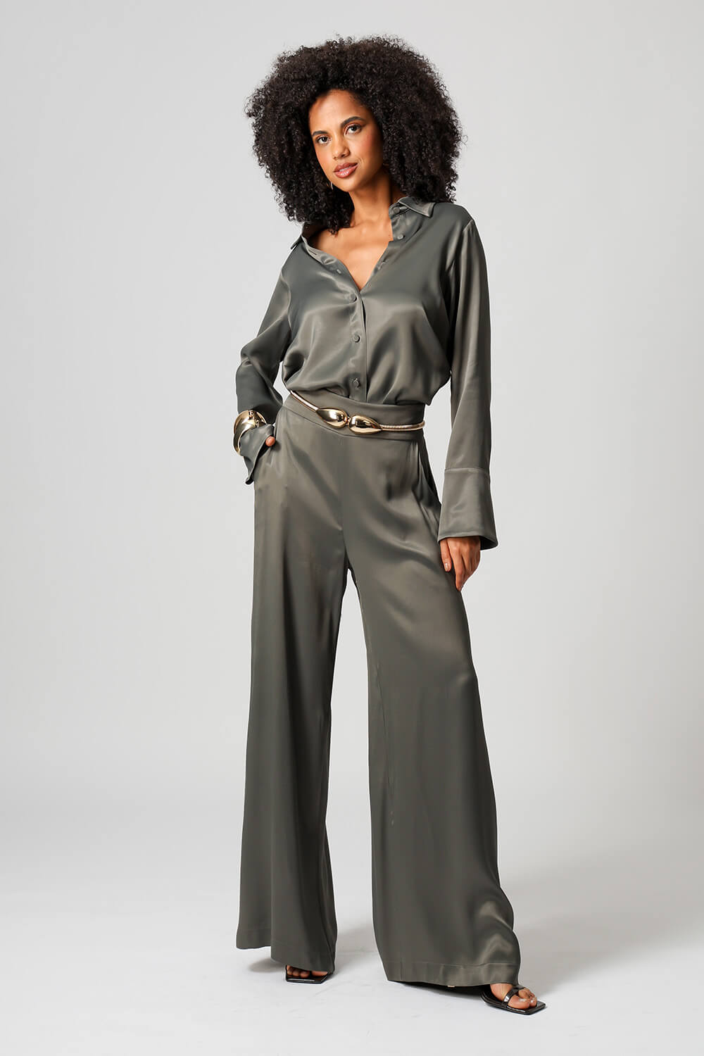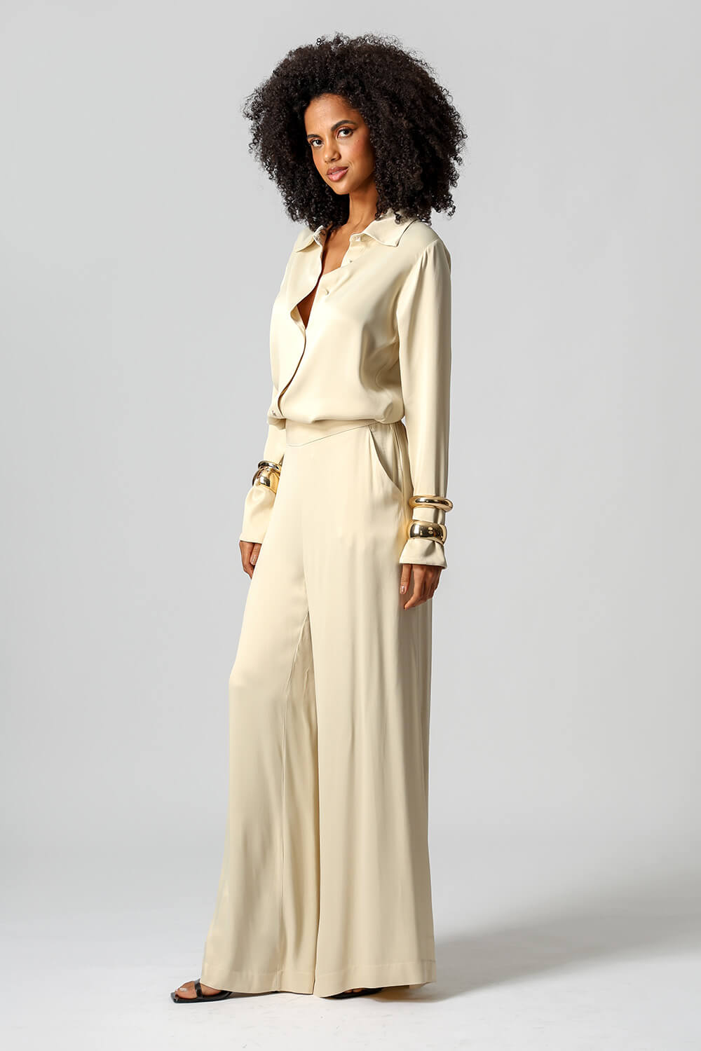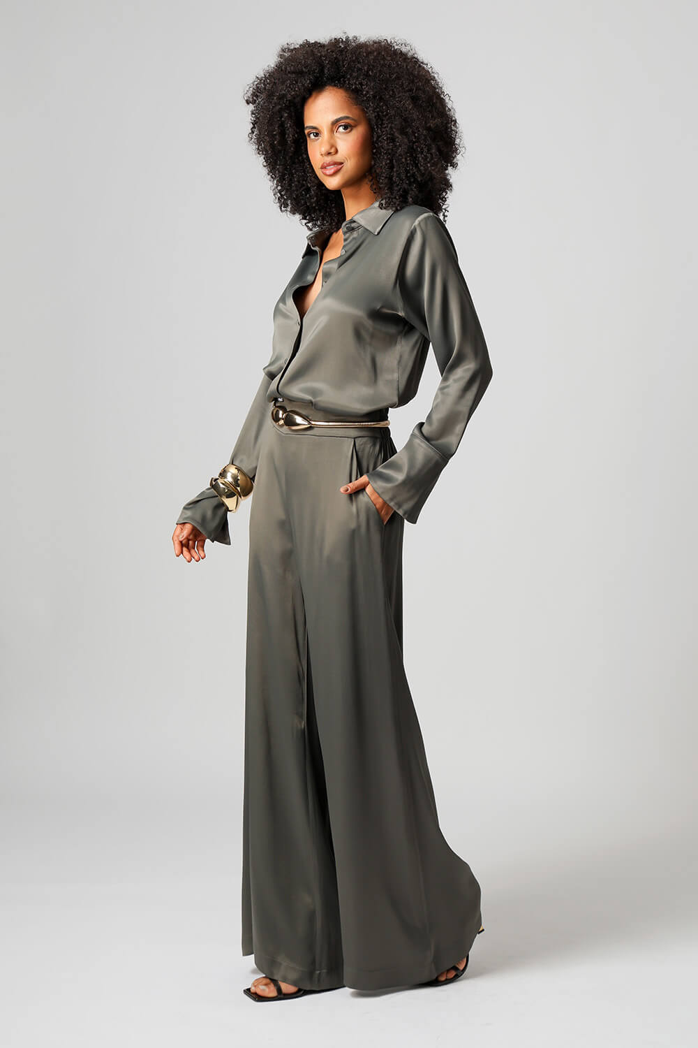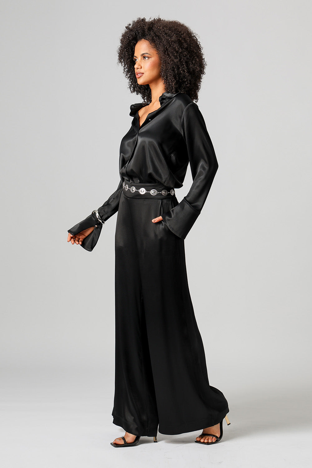 Elegante e sofisticada, a camisa em cetim premium possui punhos largos com fechamento por botão e design clássico que valoriza qualquer produção